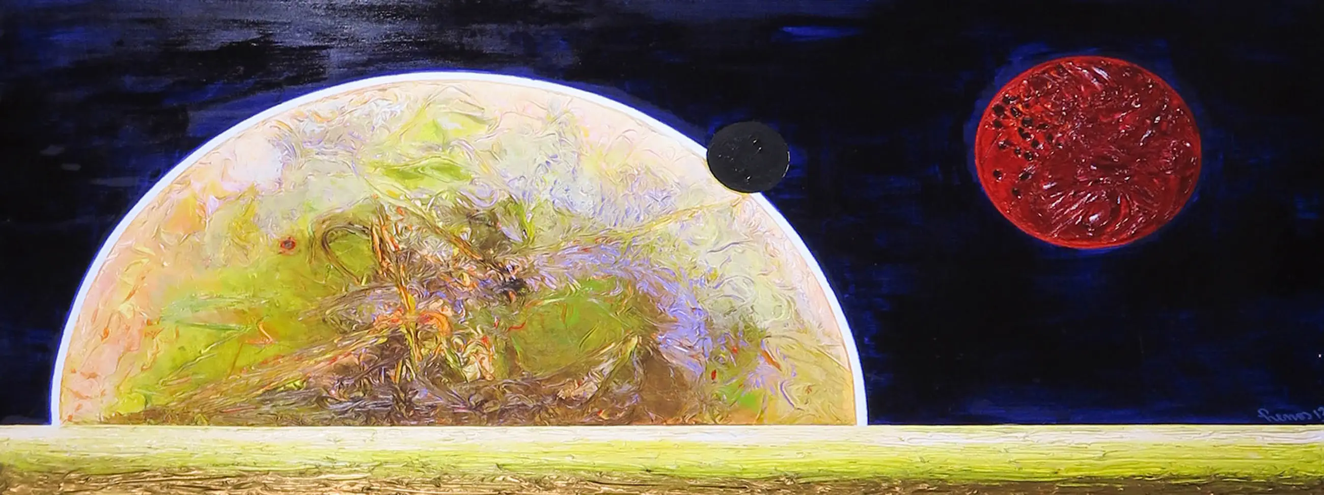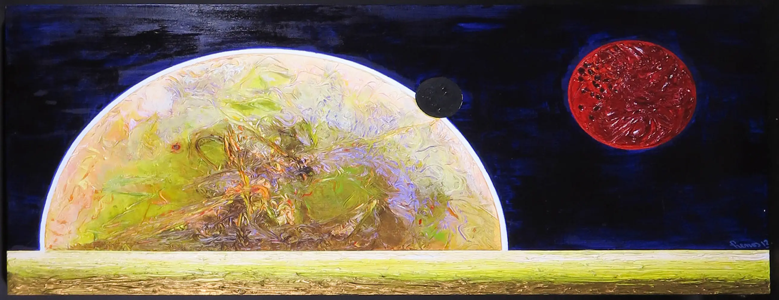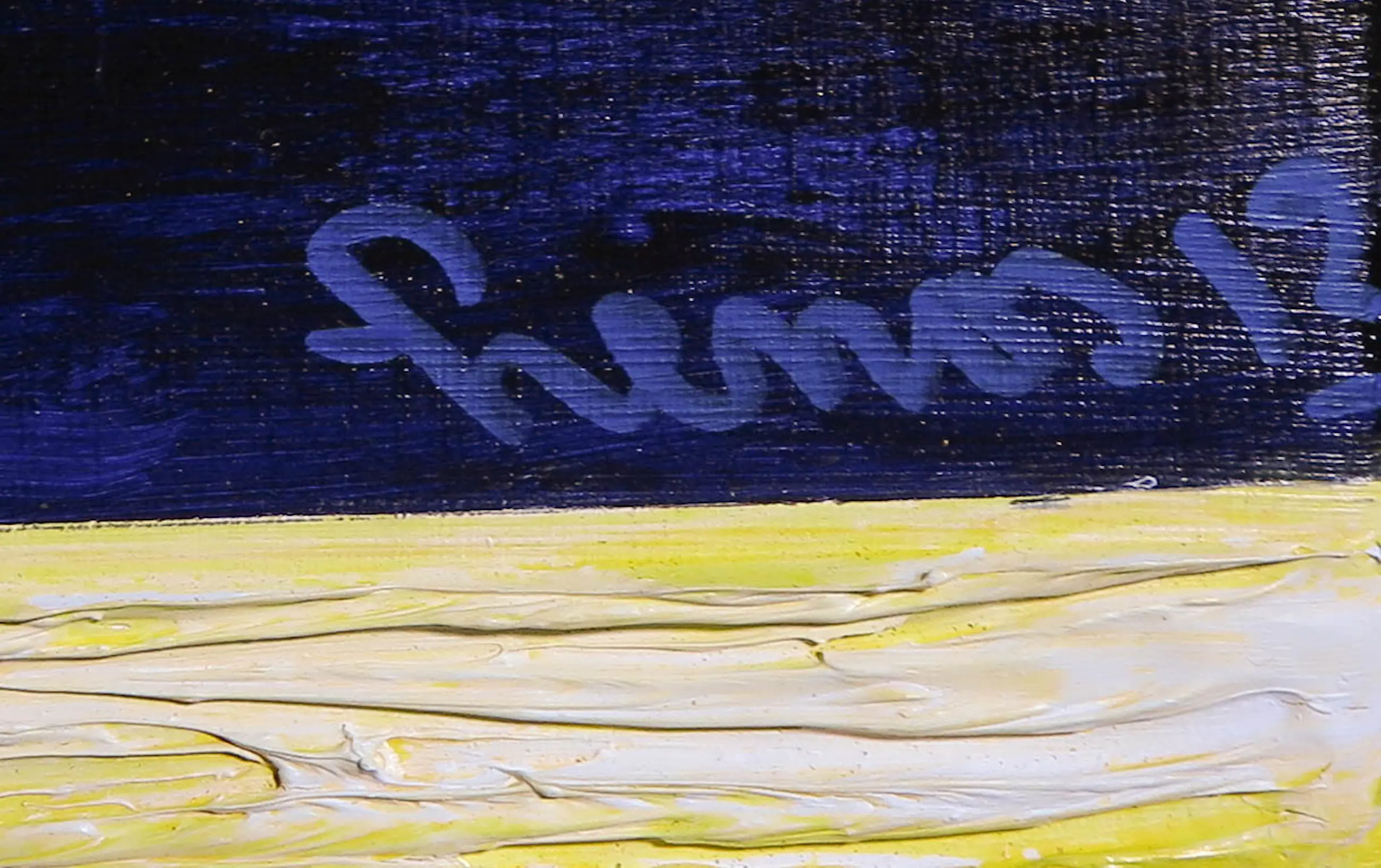 Werk van olieverf op paneel door kunstenaar Pim Lenos. Het werk is linksonder gesigneerd.