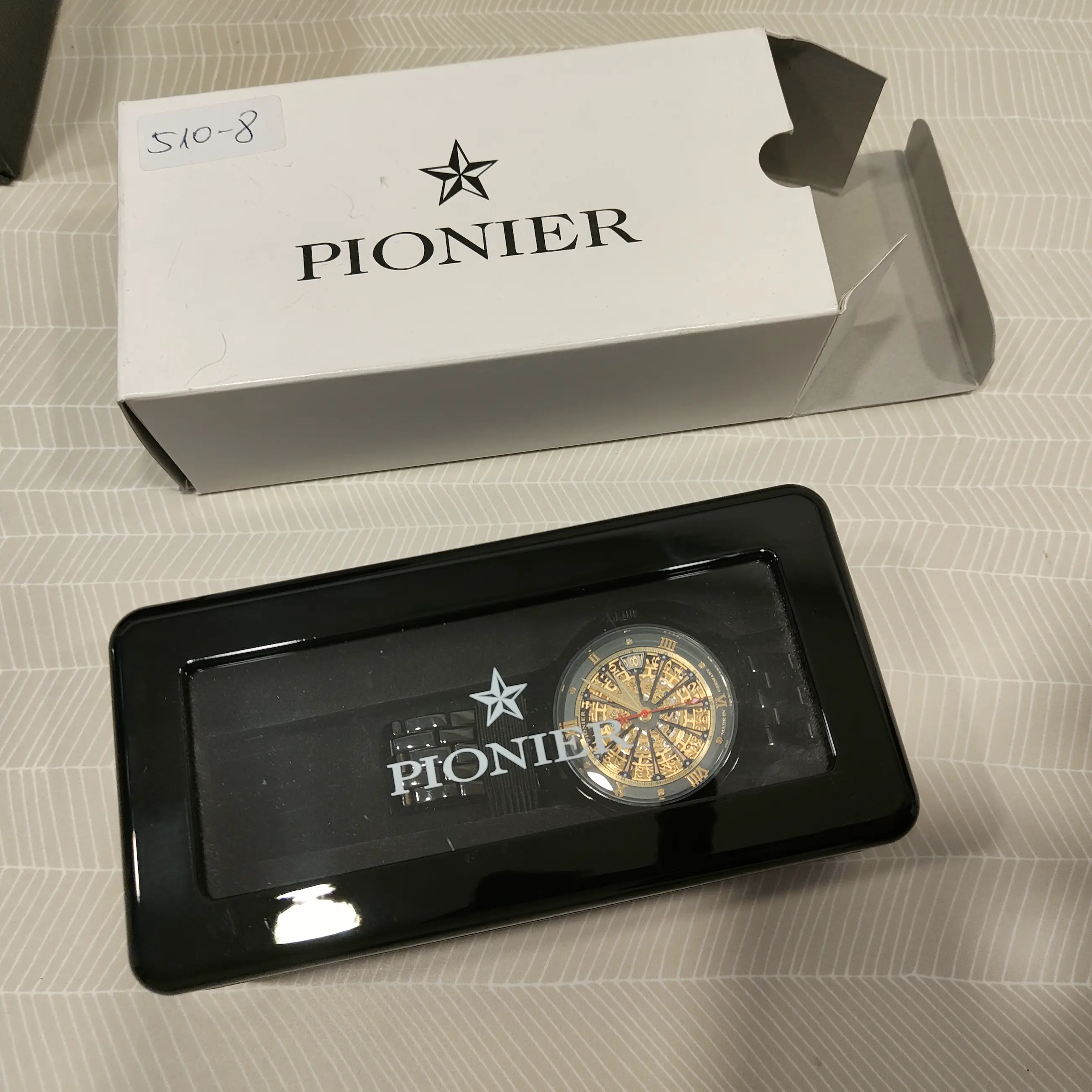 Referentie GM-510-8 Geval Roestvrij staal 5 micron (316 L) Dimensie Afmeting circa 44 mm zonder kroon Beweging Automaat met 20 Jewels Lens Saffier gecoat Sluiting/gesp Vlindergesp Band Roestvrijstalen band Inbegrepen Originele Pionier doos Waterafstotend 3 ATM Merk Pionier Vervaardigd Gemaakt in Duitsland