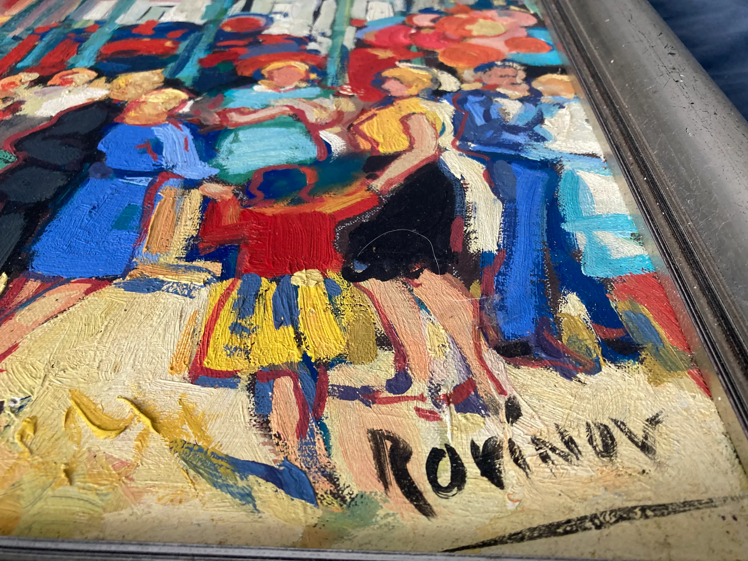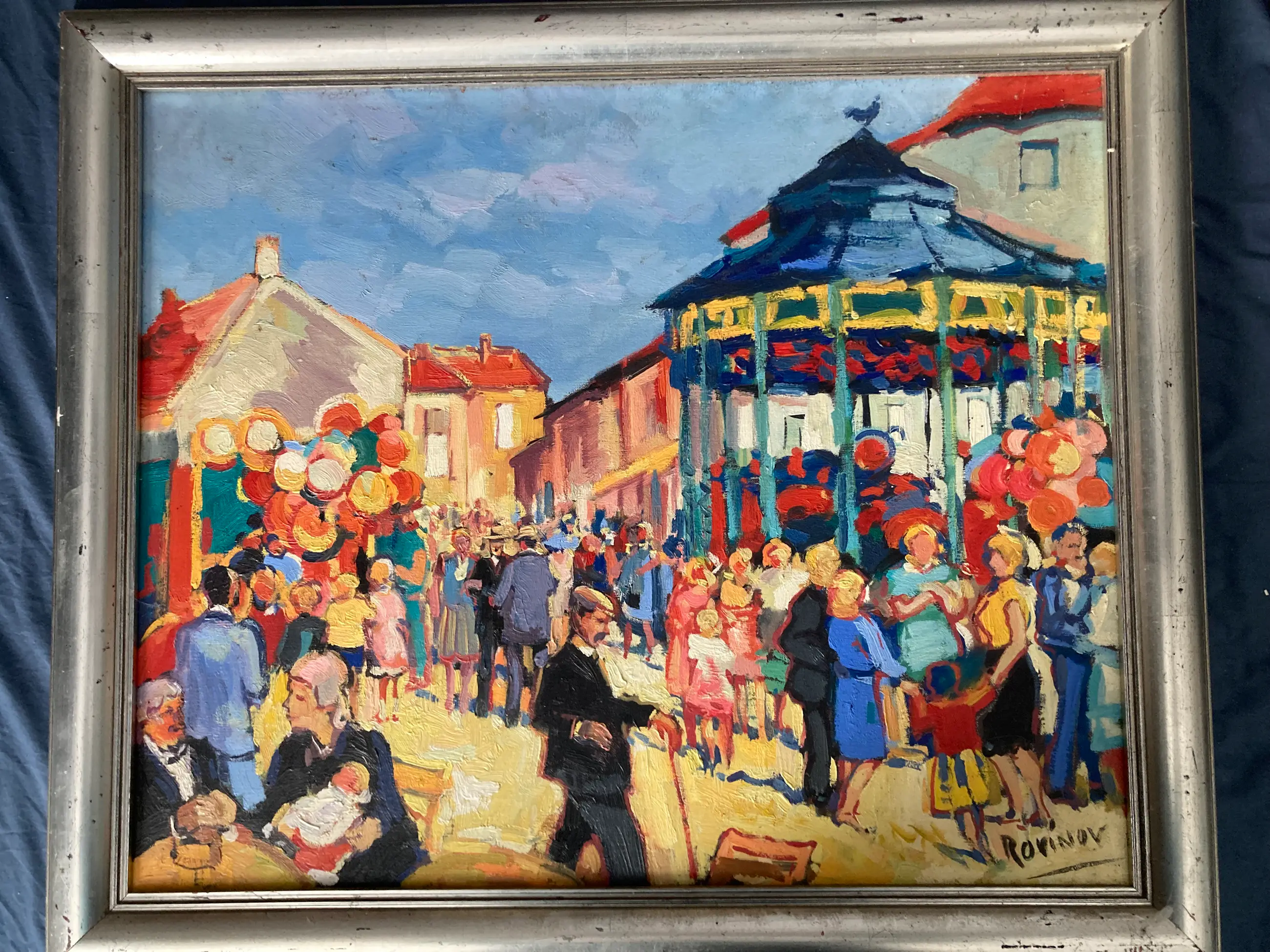 Mooi schilderij van Rovinov. Zeer kleurrijk en voor de echte kunstliefhebber. Op schilderij is een kermis of markt te zien in het dorp of stad.