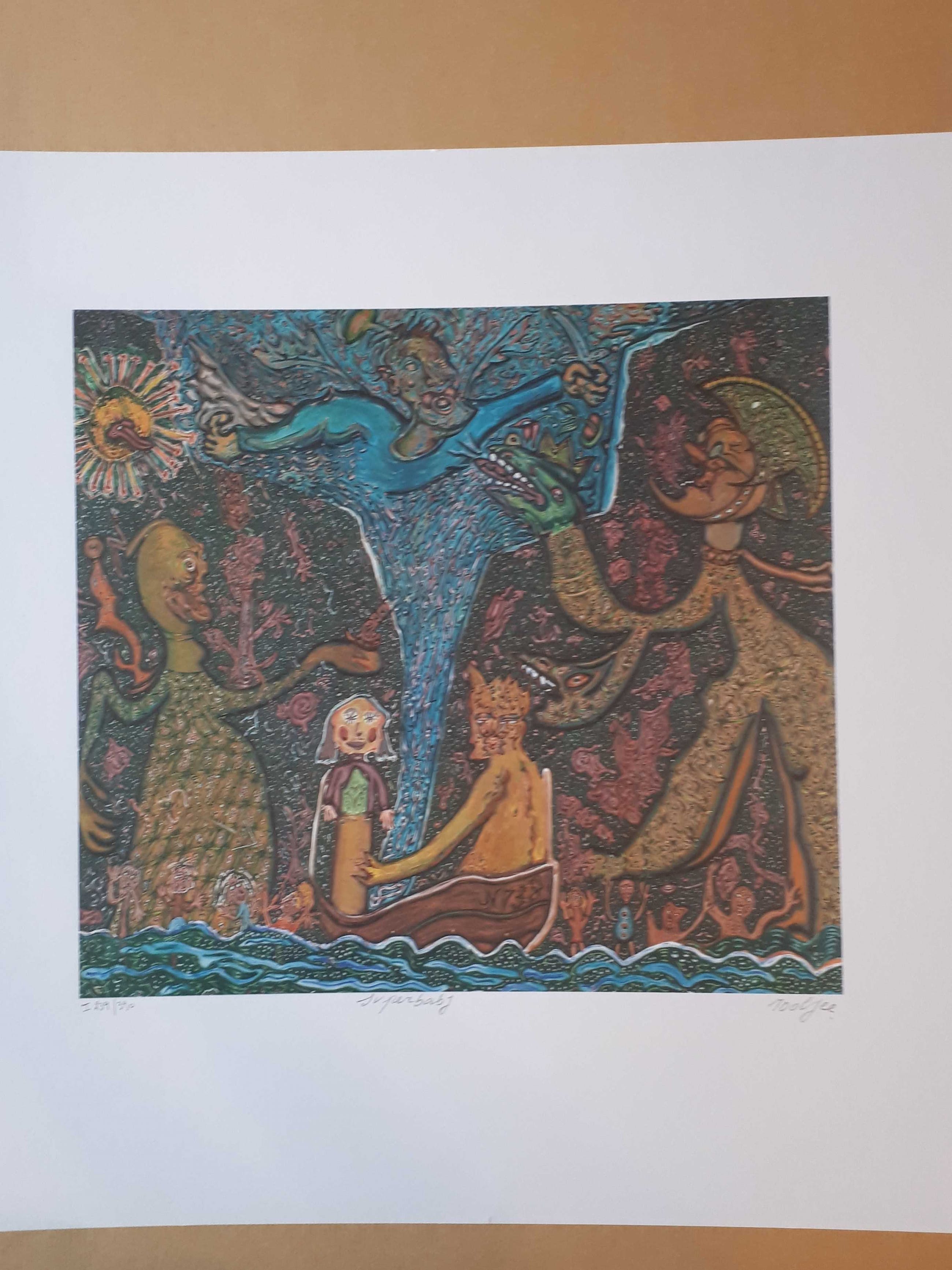 Pjeroo Roobjee, ( Pseudoniem van Dirk de Vilder, 1945 Gent te België. ) Titel : Superbaby. Techniek : Zeefdruk op papier. Oplage : I 239 / 390 ( I = gelimiteerde oplage ). Ingelijst : Nee, niet ingelijst. Handgesigneerd en genummerd en betiteld : Pjeroo Roobjee. Mooi kleurrijke zeefdruk. Een geliefde zeefdruk van Pjeroo Roobjee omdat de compositie zo knap in detail is.