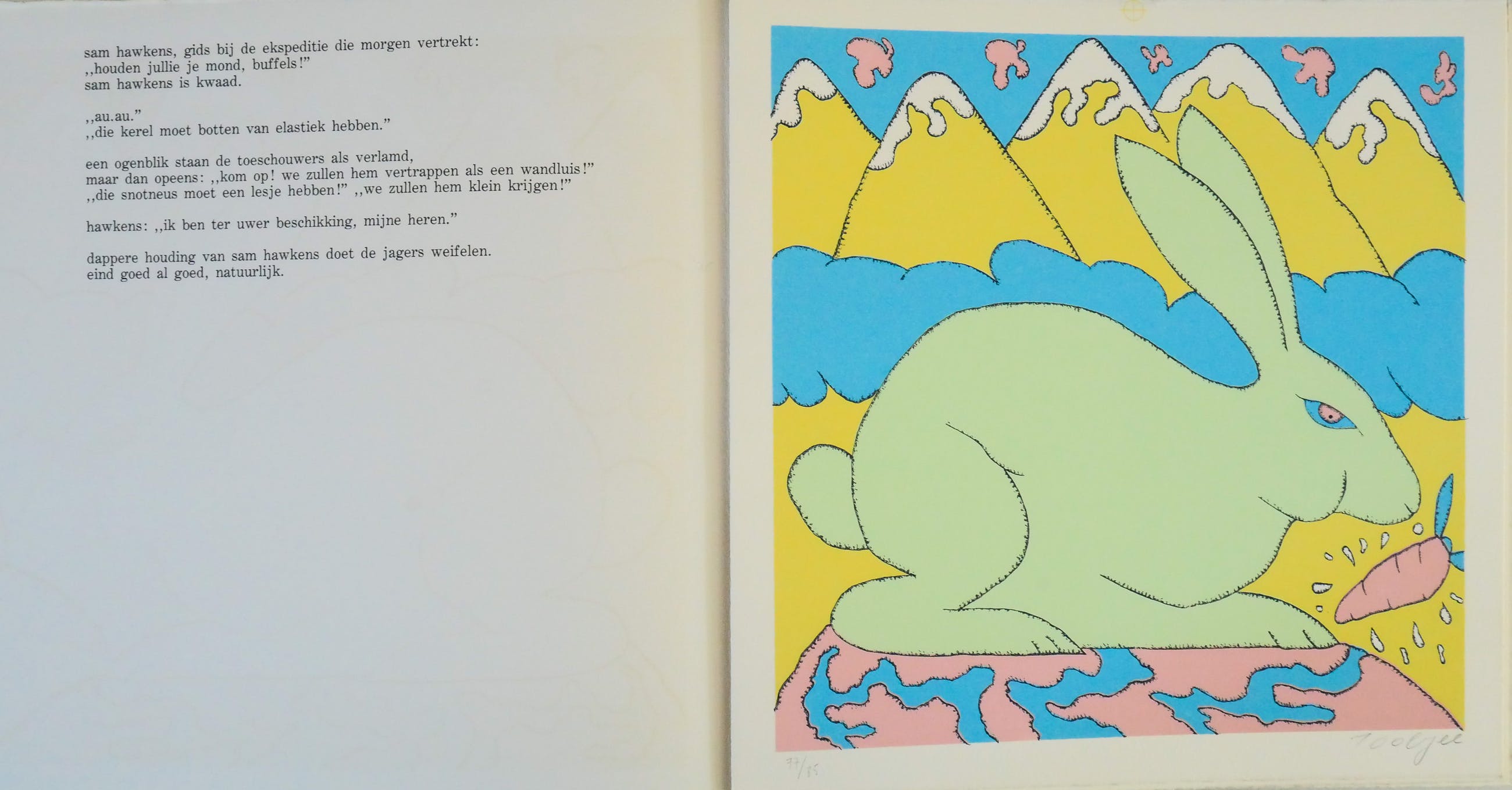 Pjeroo Roobjee gesigneerde en genummerde zeefdruk De zeefdruk zit in een papieren omslag met tekst Uitgever; Galerie de zwarte panter nr. 77/ 85