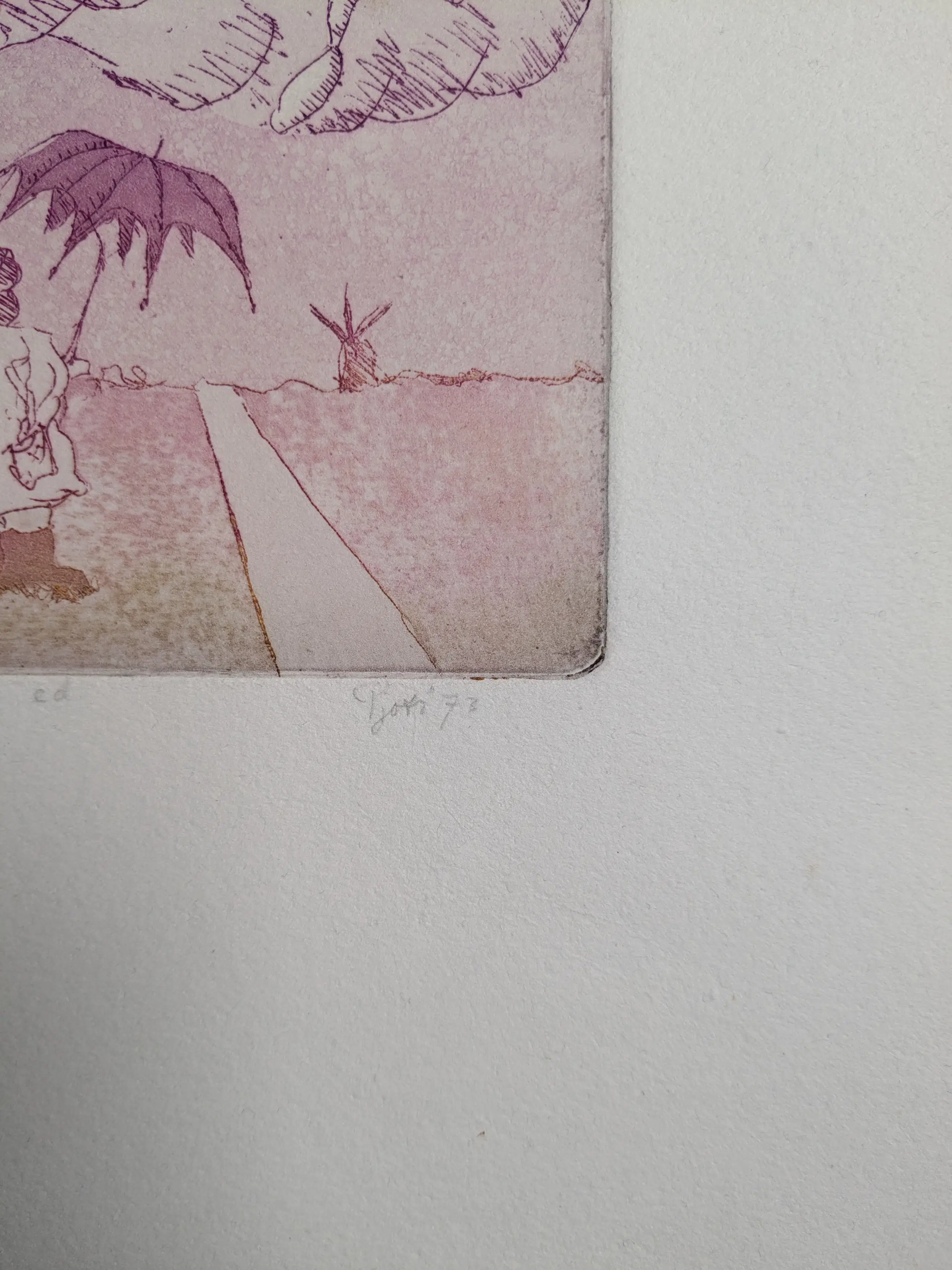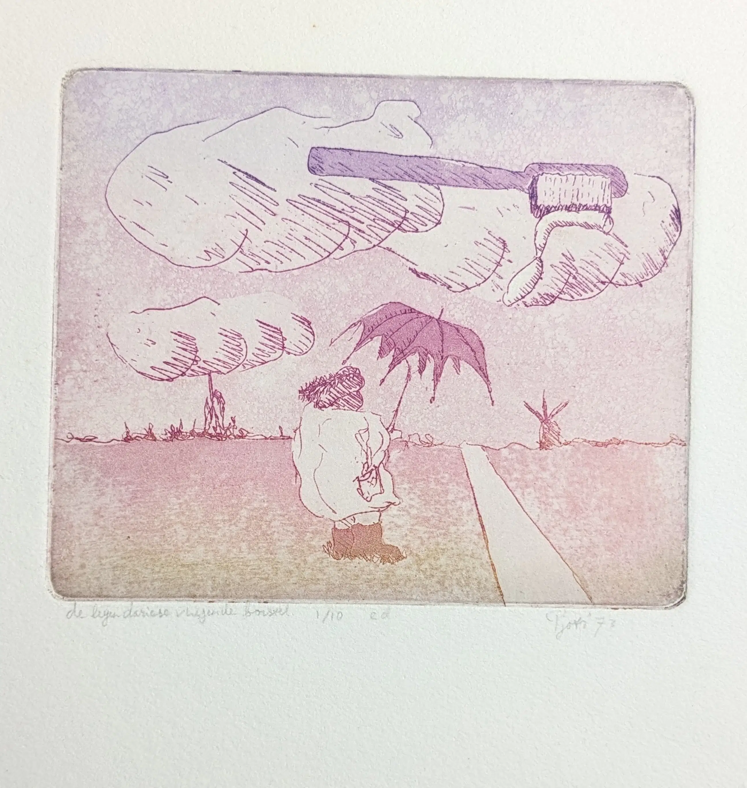 Een grappige ets door Pjotr Van Moock. De ets in kleur is getiteld de legendarische vliegende borstel. De ets is genummerd 1/10 (e.a.?), gedateerd 1973 en gesigneerd in potlood.