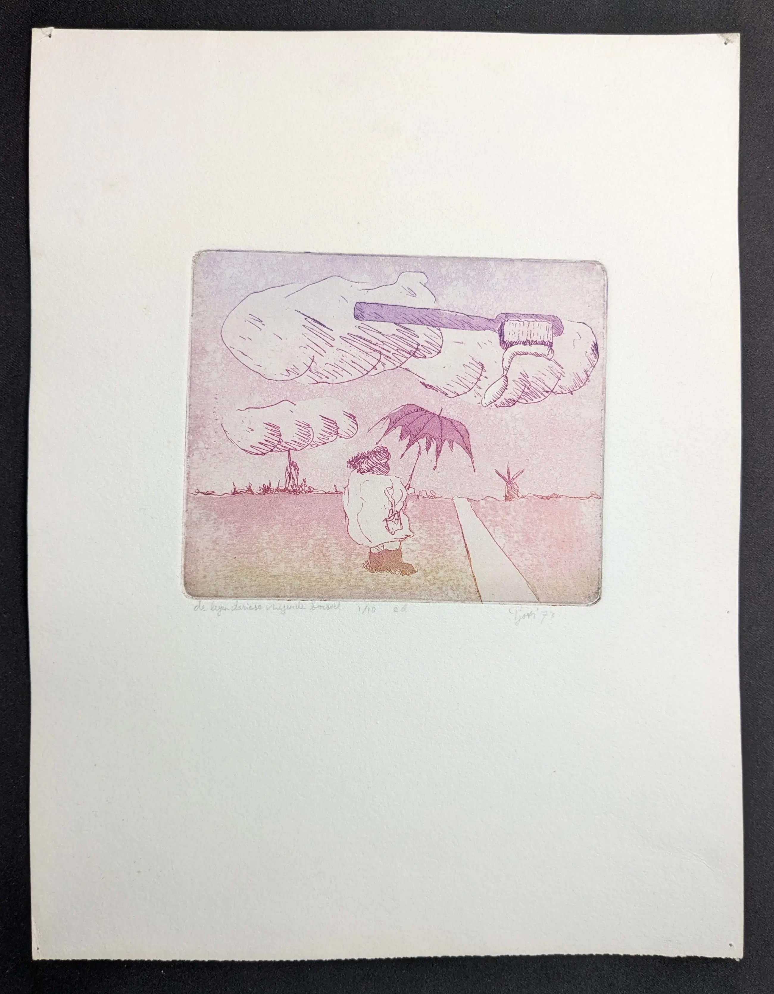 Op de ets staat een surrealistisch landschap afgebeeld. Centraal ligt een enorme vliegende tandenborstel op een wolk. Op de haren van de borstel ligt een portie tandpasta hetgeen de indruk wekt dat de wolken worden gepoetst. Verder staat een figuur met paraplu te kijken naar het tafereel. Een weggetje zorgt voor de diepte in de prent, leidend naar een dorp en een molen. Een grappige conversation piece in zachte kleuren.