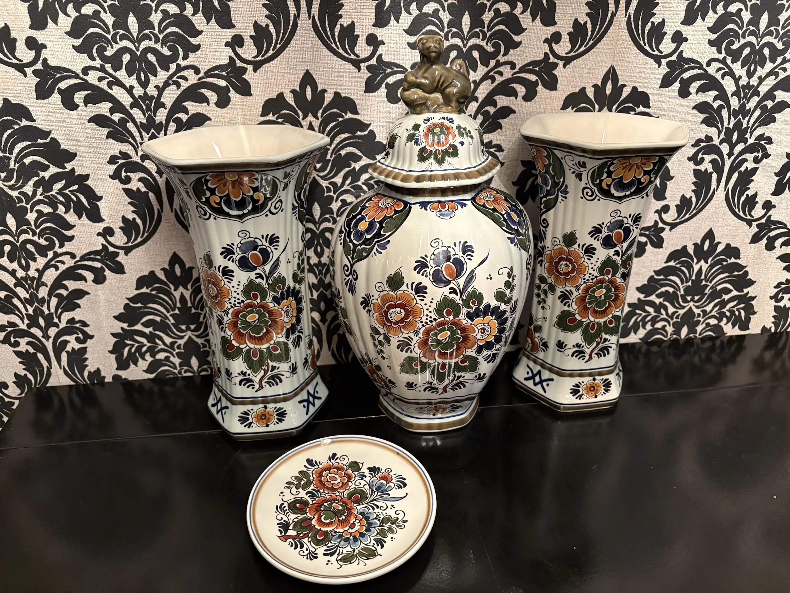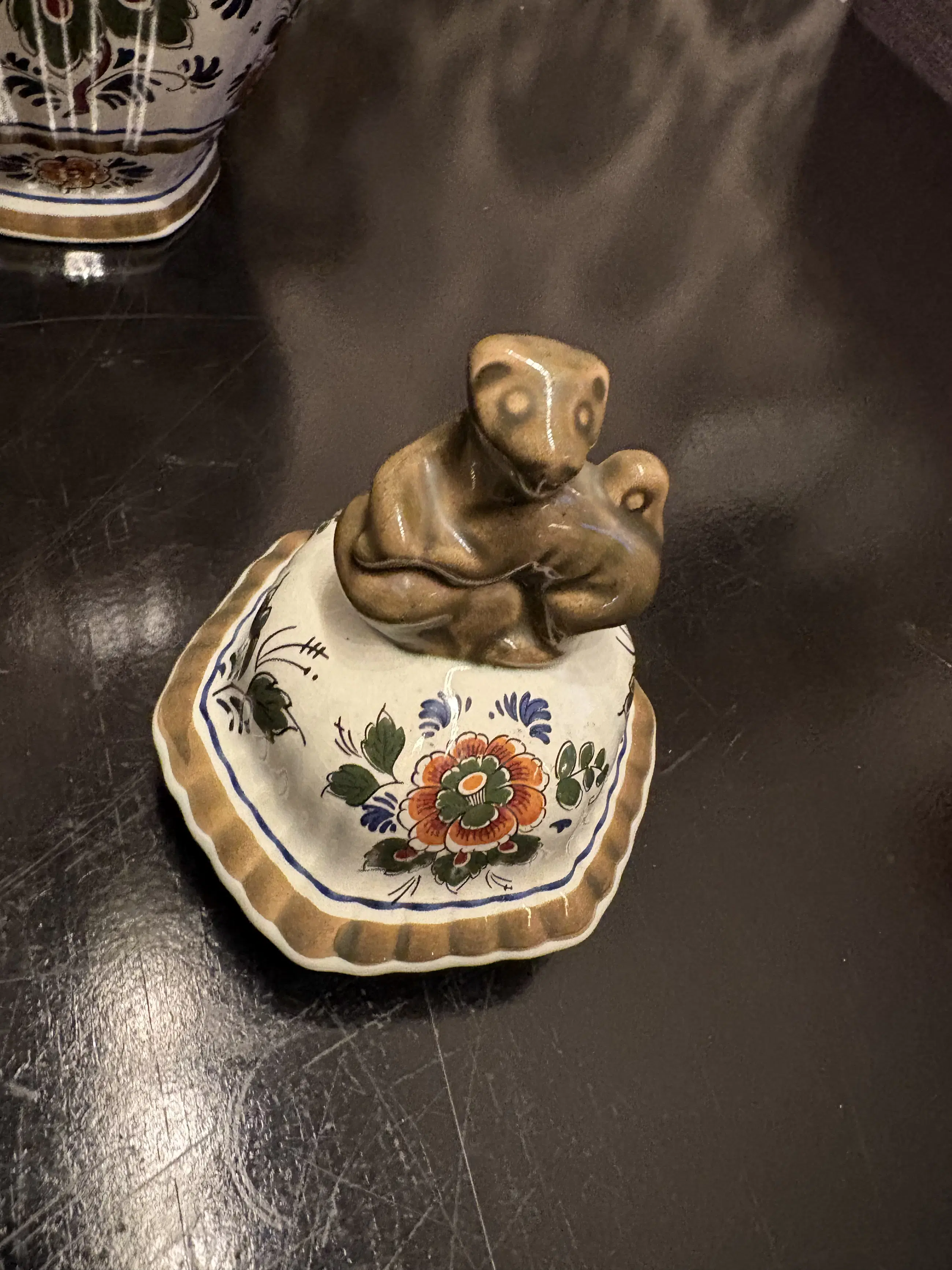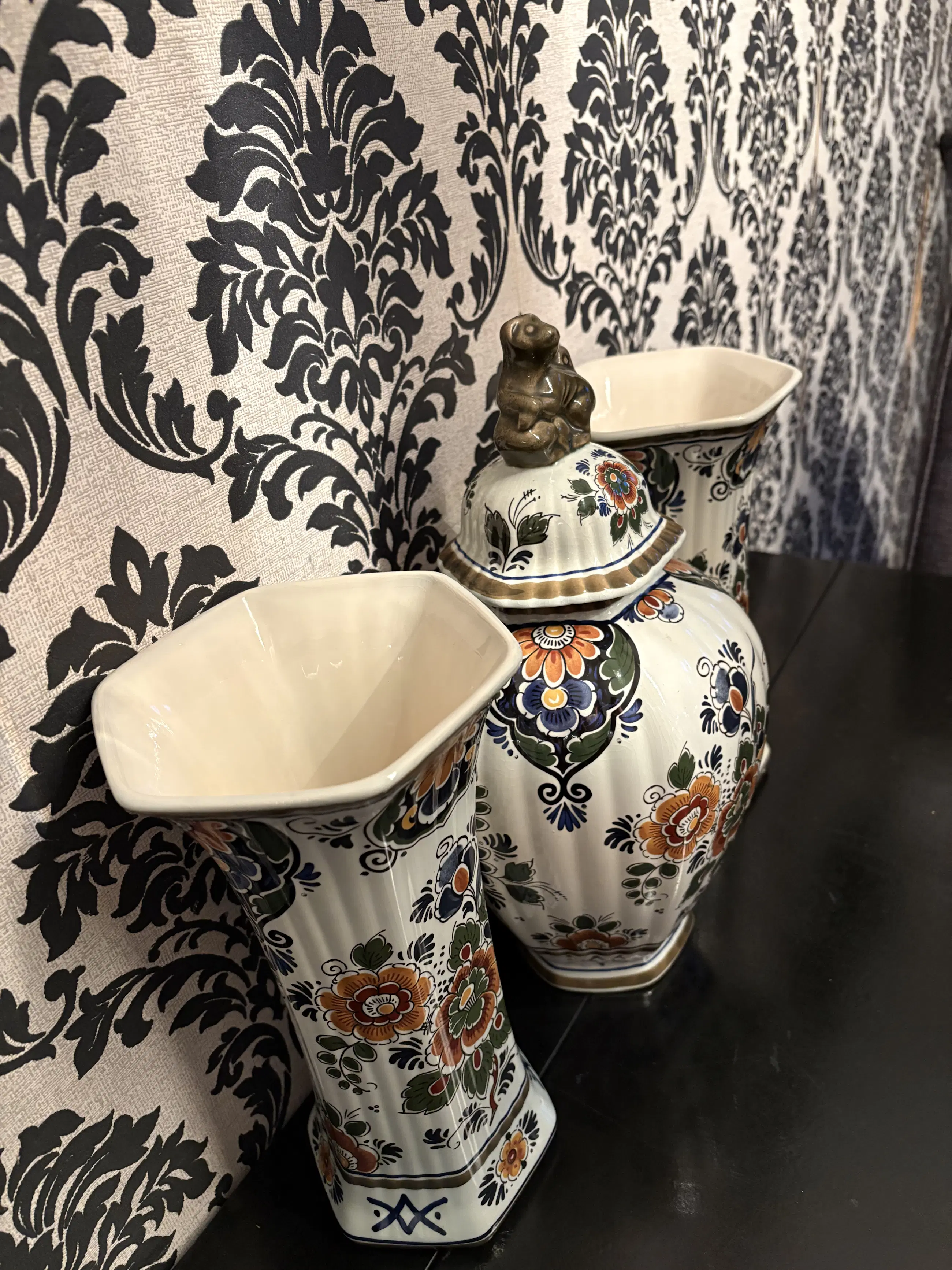 Laat je betoveren door dit uitzonderlijke stuk handgemaakt Delfts aardewerk, een waar juweel van Hollandse traditie. Met zijn verfijnde florale motieven, sculpturale details en een glazuur dat in craquelé schittert als een netwerk van herinneringen, straalt dit object pure ambacht uit.