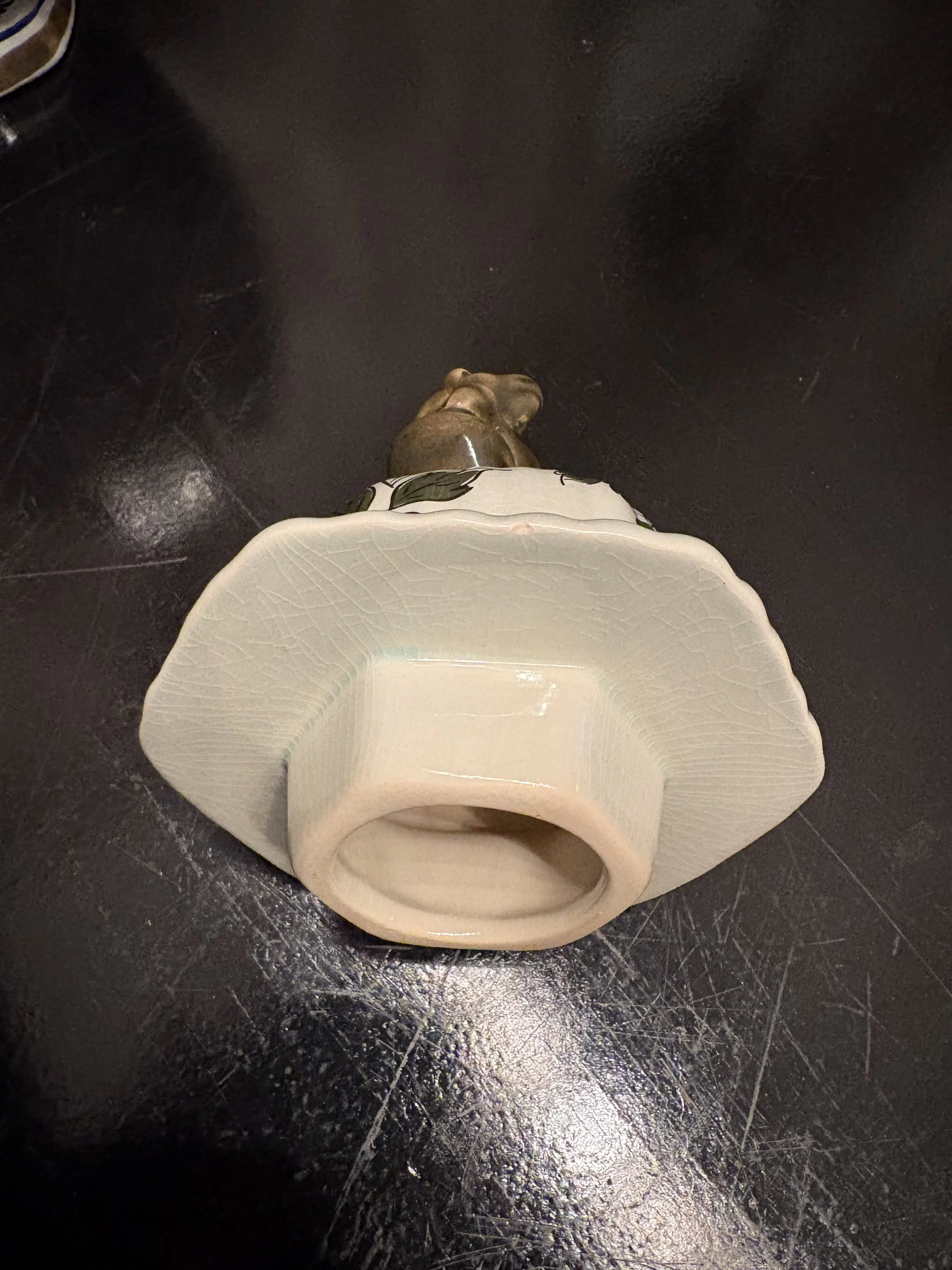 Bovenop prijkt een sierlijk vormgegeven kikker, een speelse knipoog naar de natuur, rustend op een zeshoekige voet met een centrale opening – een ontwerp dat zowel decoratief als functioneel is.