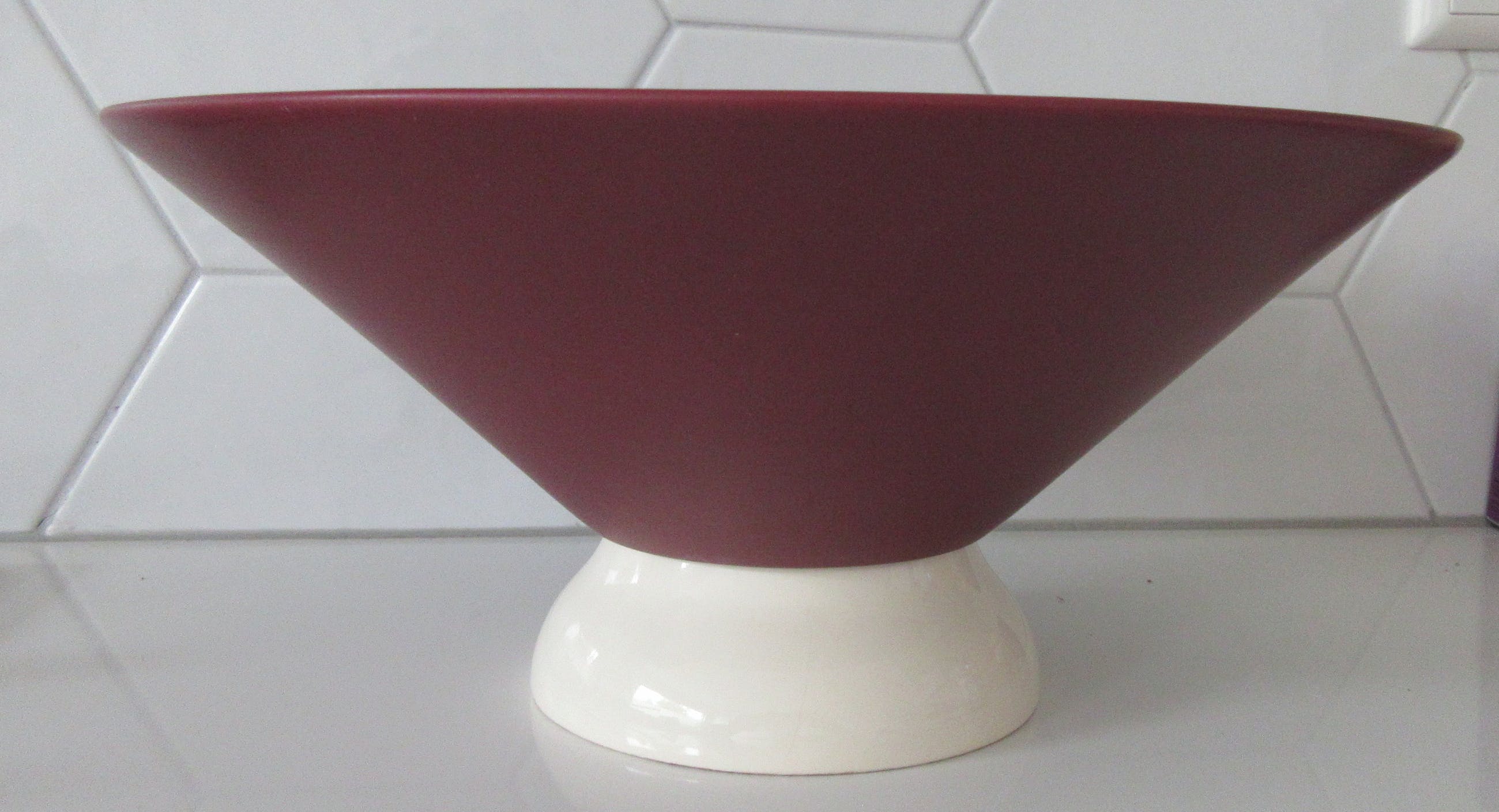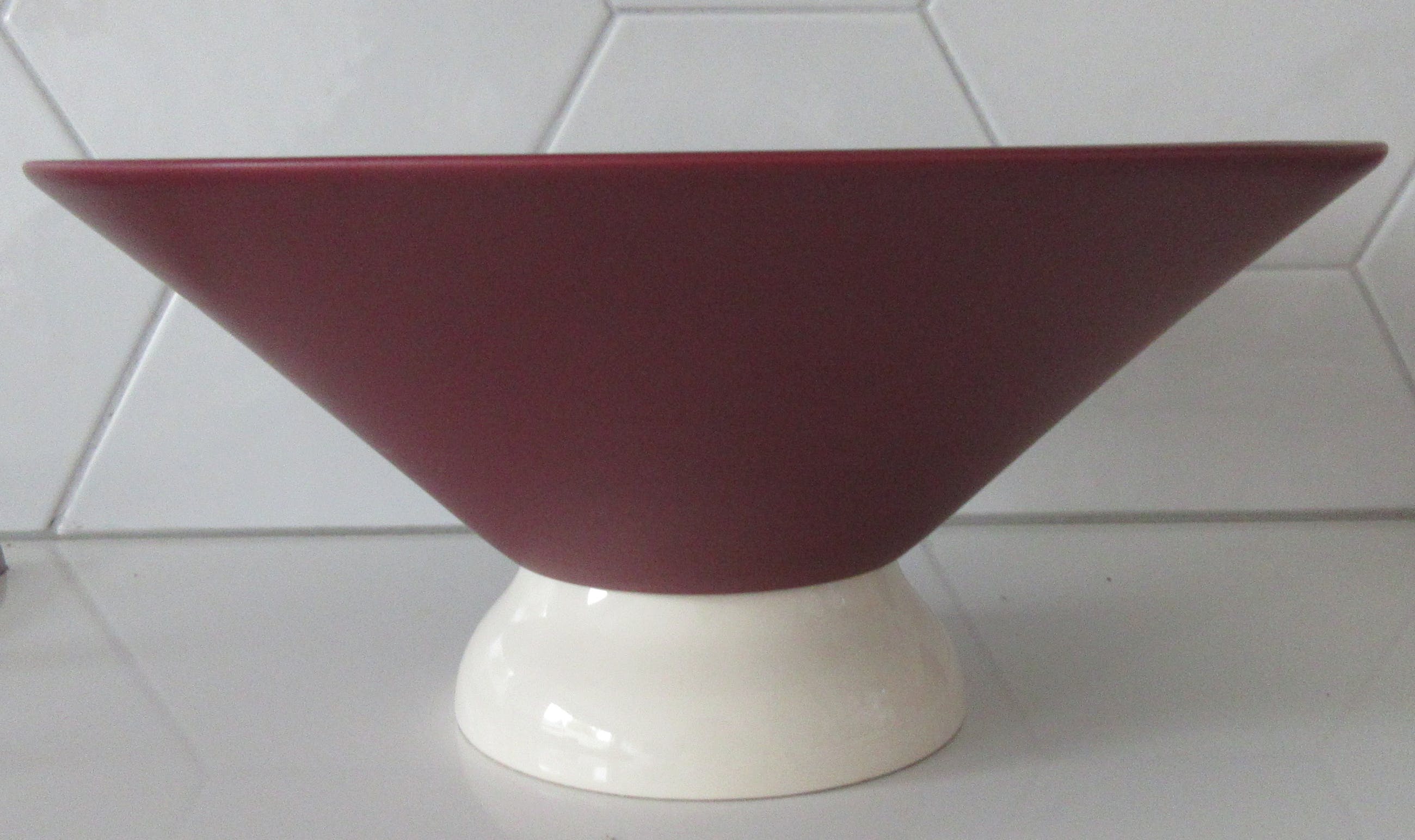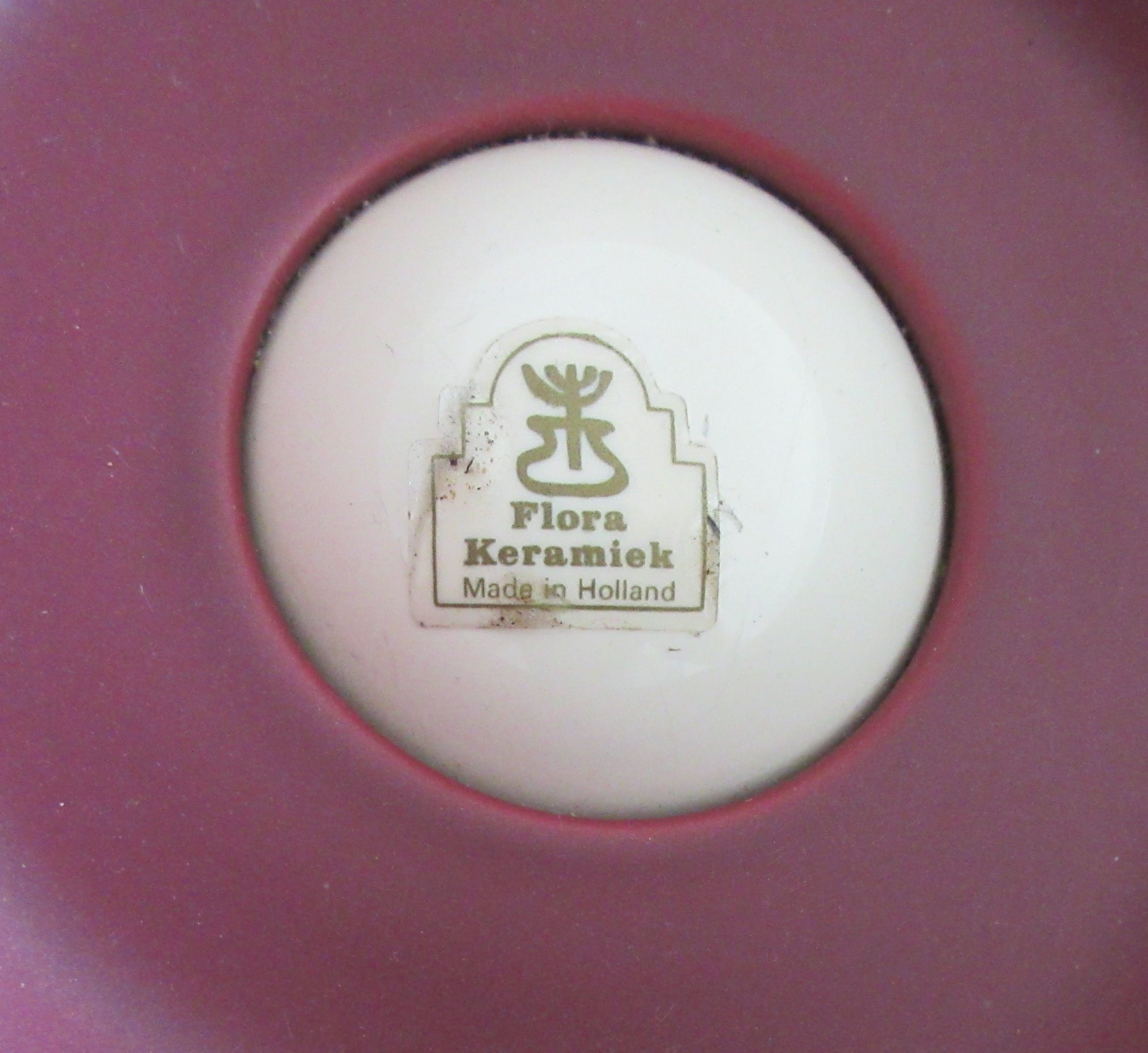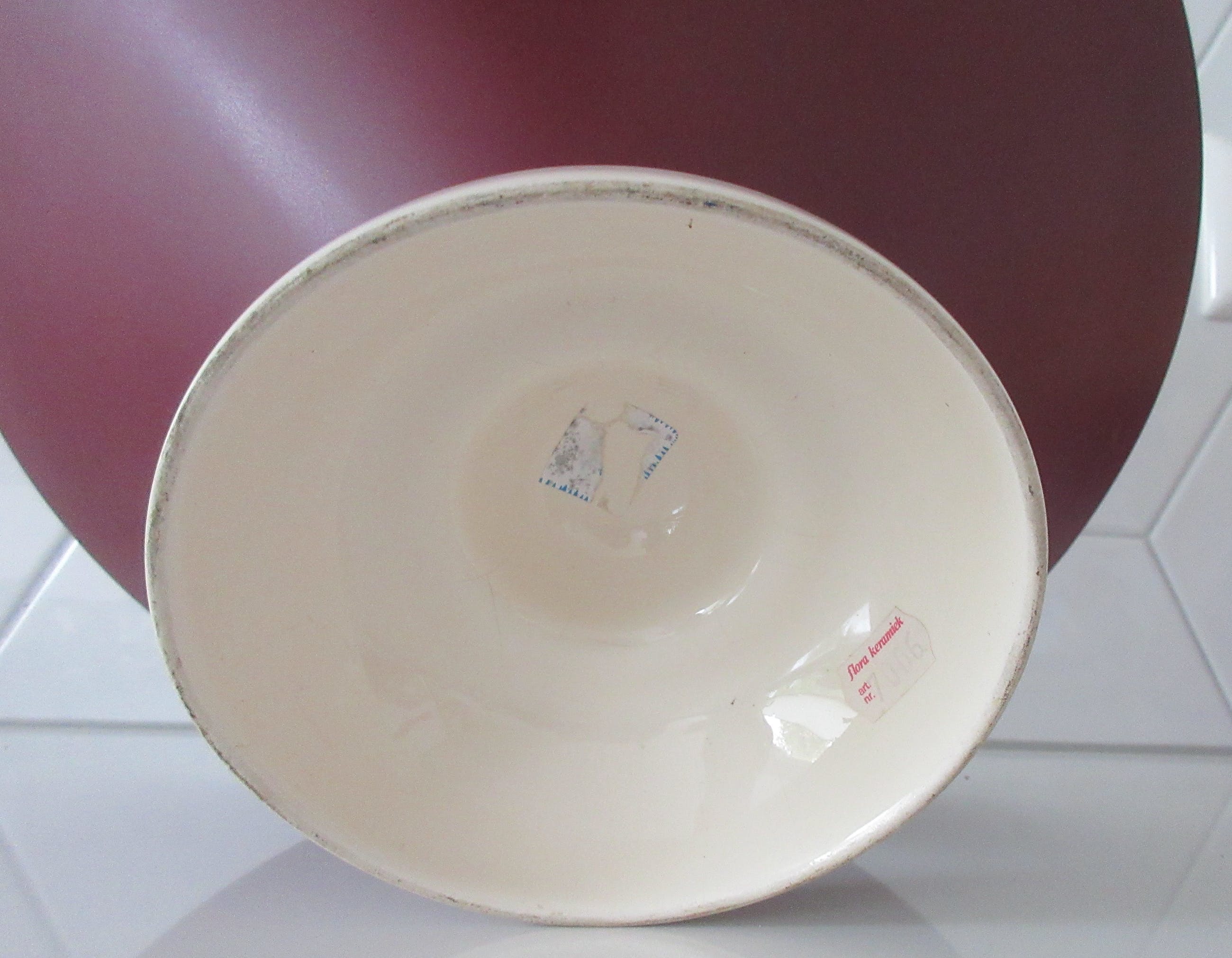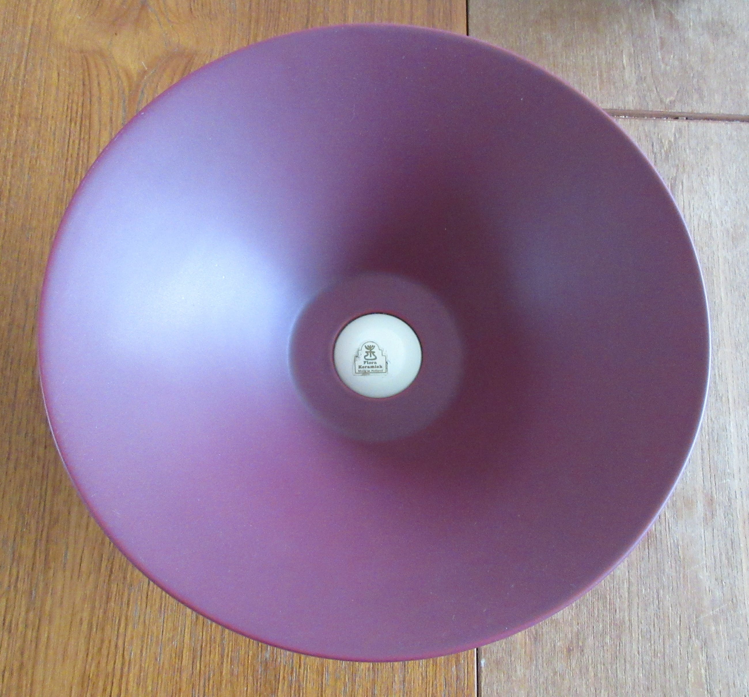 Een relatief laat stuk van plateelbakkerij Flora uit Hardenberg. Mooie grote strakke design fruitschaal duotone in mat paars aubergine en glanzend creme uitgevoerd. Onderdeel van een van de laatste series van Flora; Duet uit 1996. Ontwerper onbekend. Gemerkt aan de binnenzijde met een sticker.