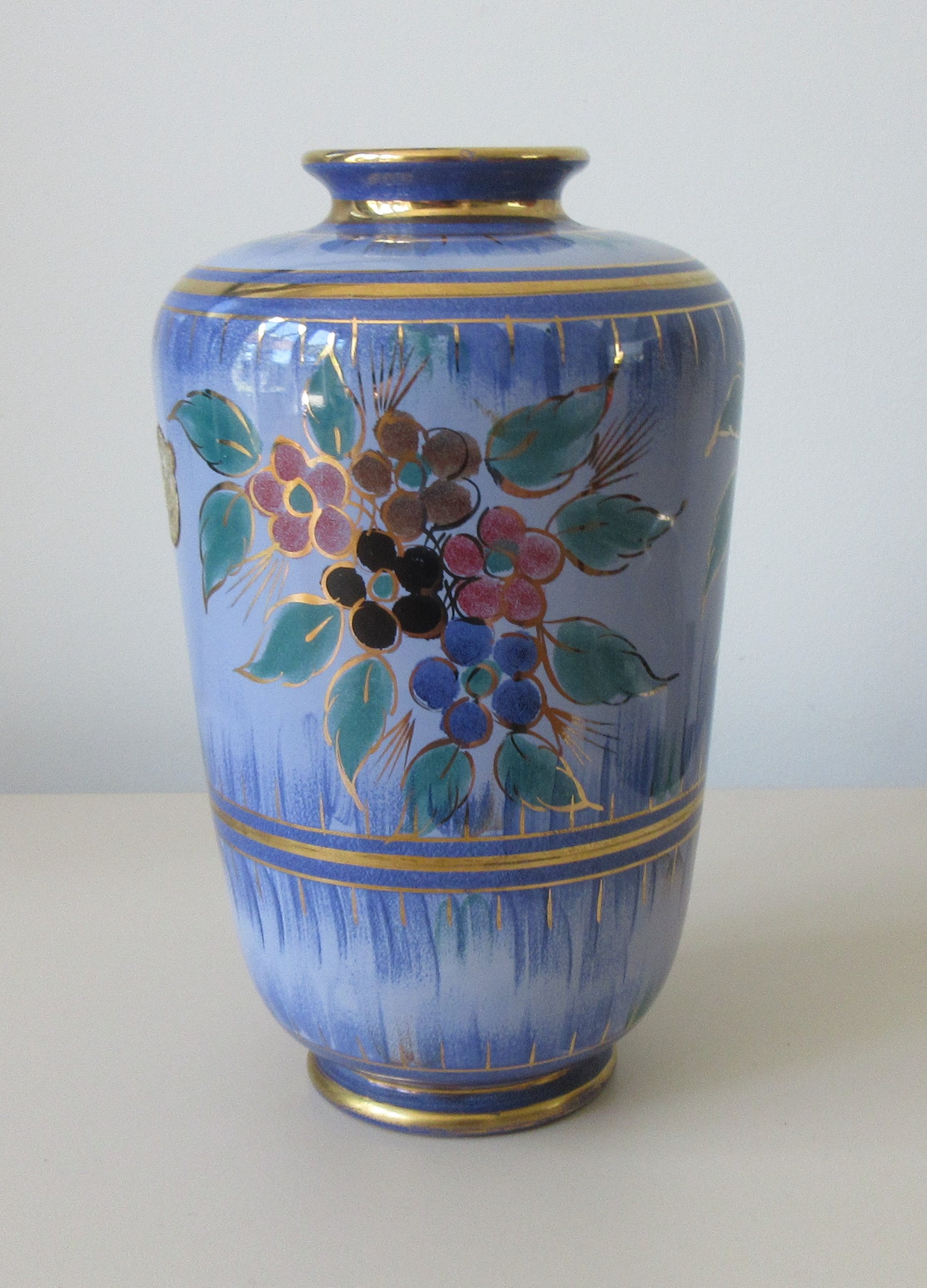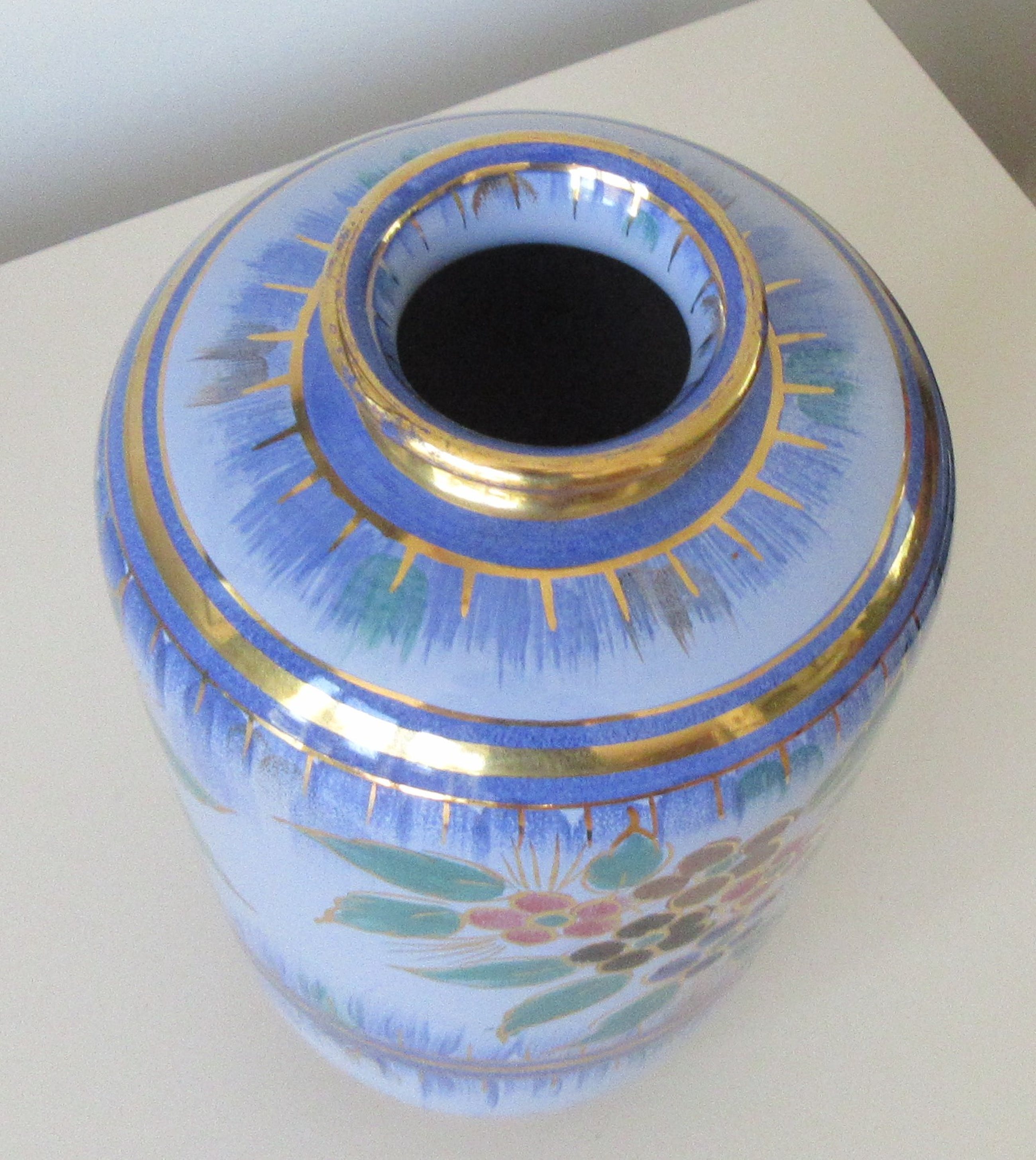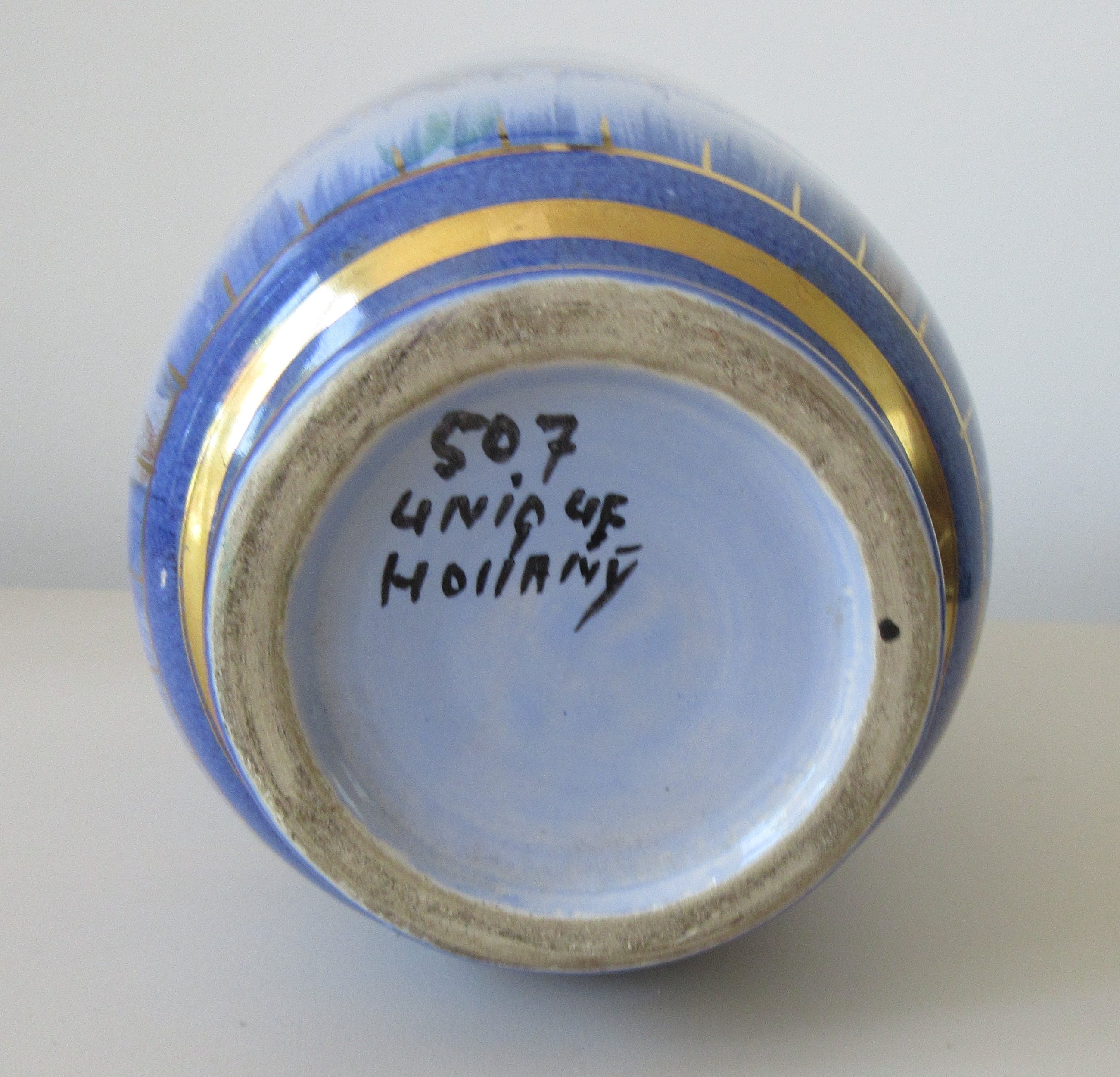 Platelen vaas model 507 met decor Unique uitgevoerd bij plateelbakkerij Flora in Gouda. In zeer goede gebruikte conditie, alleen de vergulde delen hebben wat lichte slijtage. Met de hand genummerd en voorzien van decornaam, gemerkt met originele merksticker (zeldzaam).
