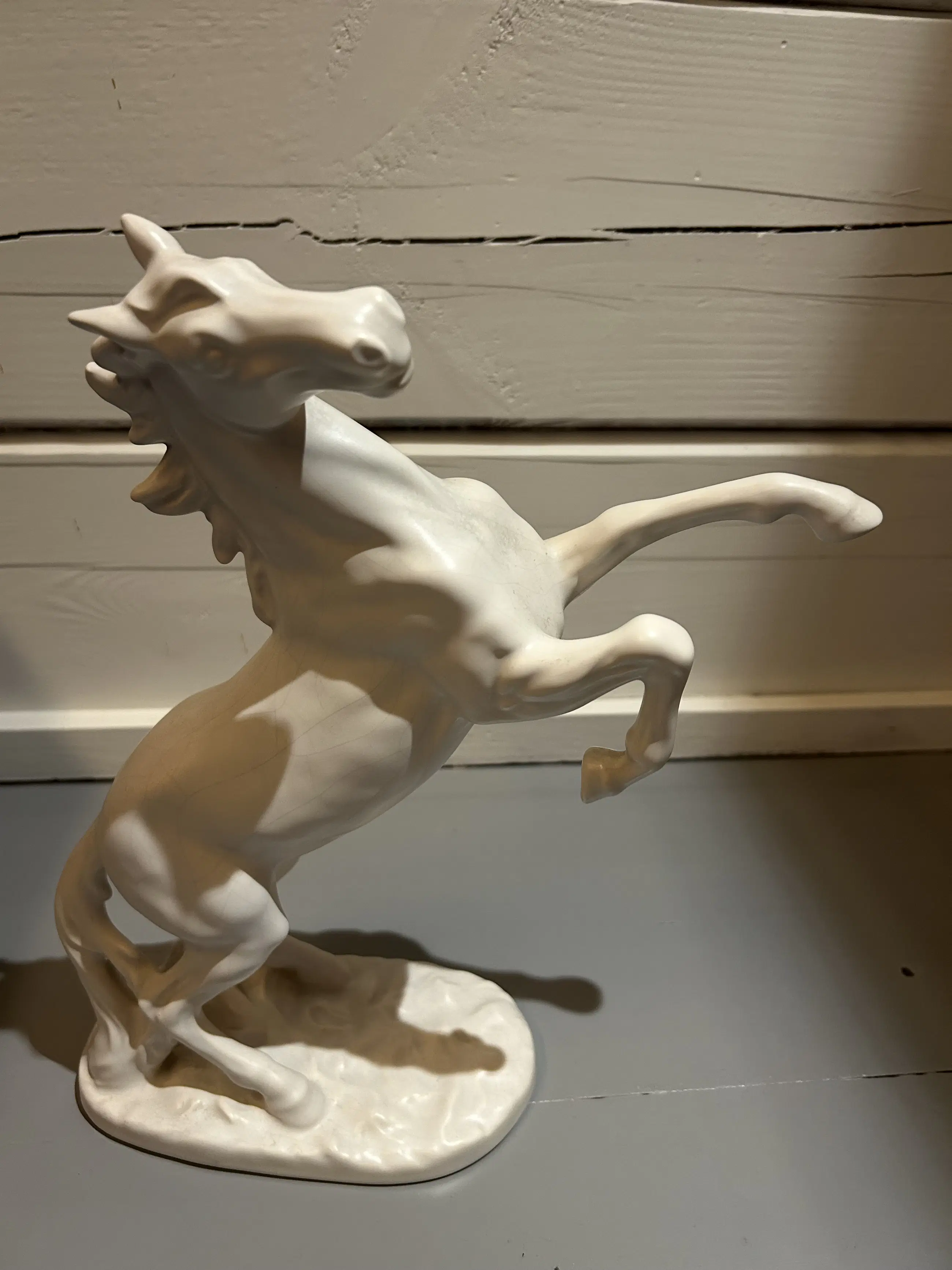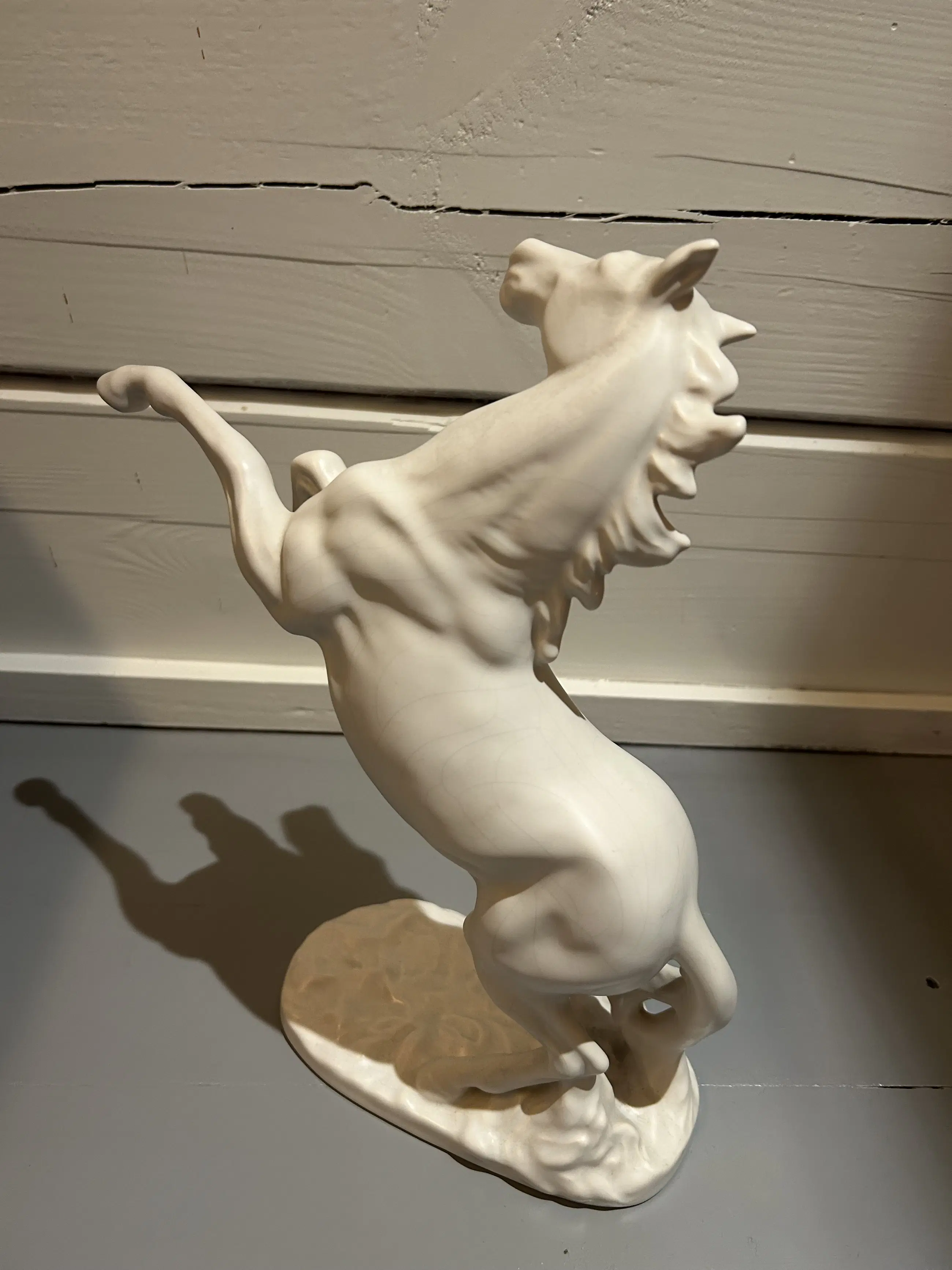 Een prachtig wit beeld van een steigerend paard. Altijd in vitrine kast gestaan. Alle kanten mooi om te zien (en gaaf).