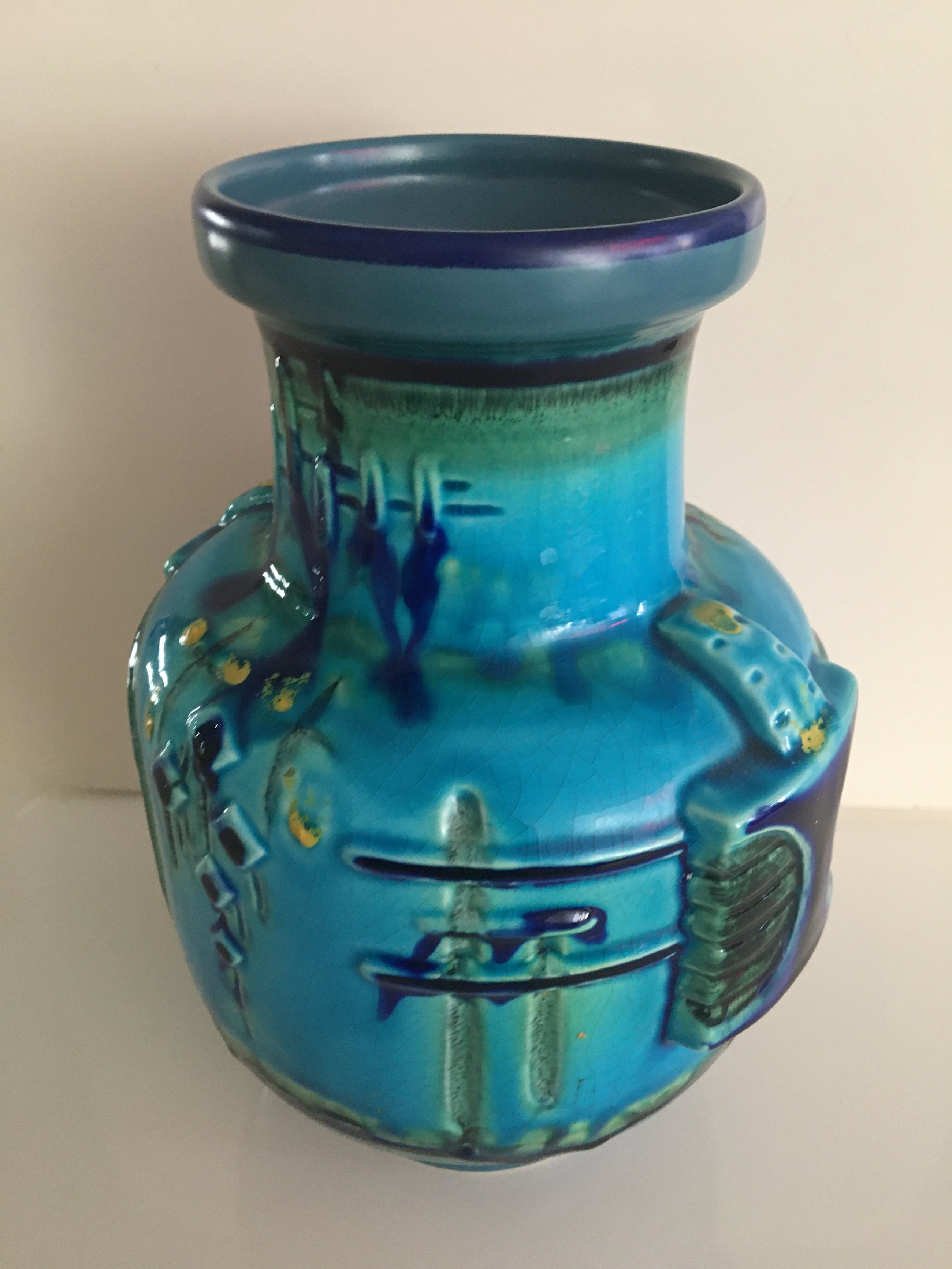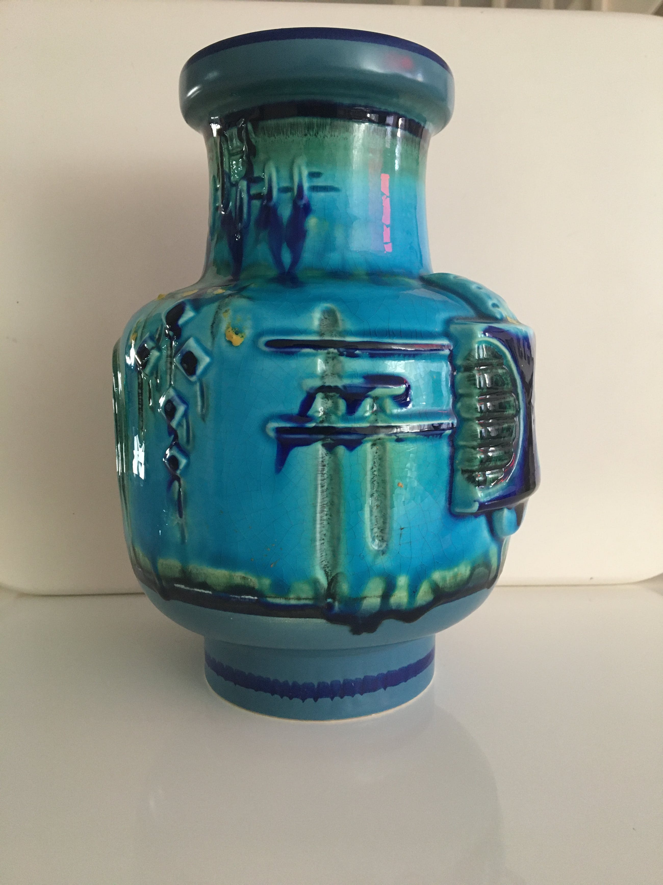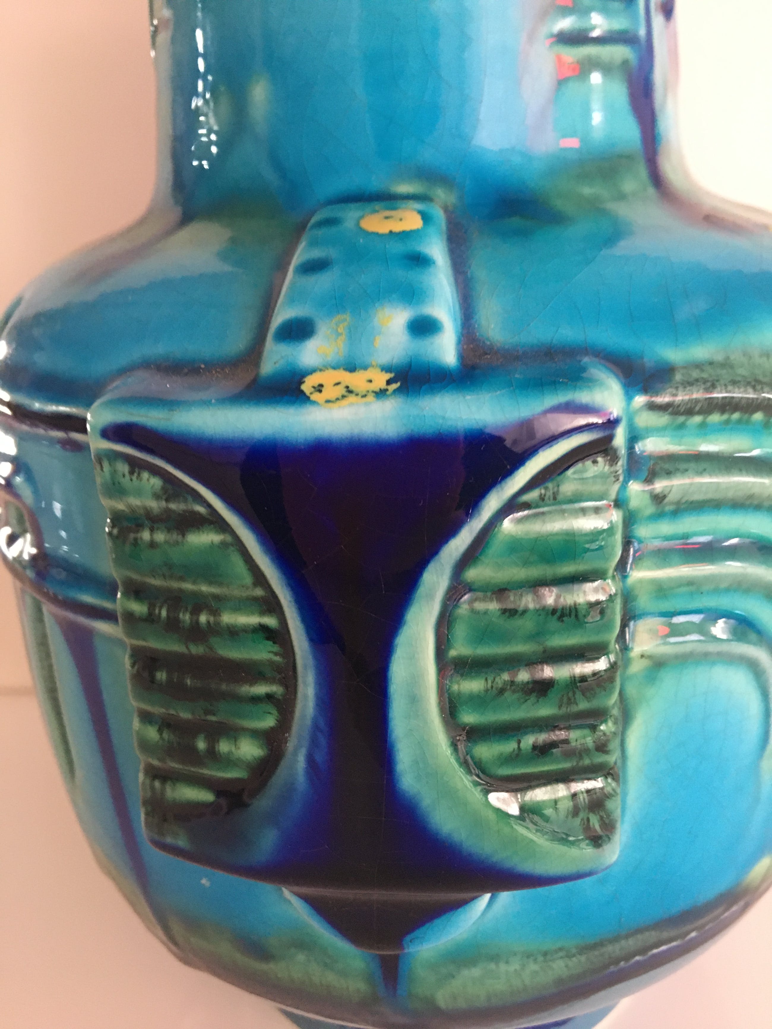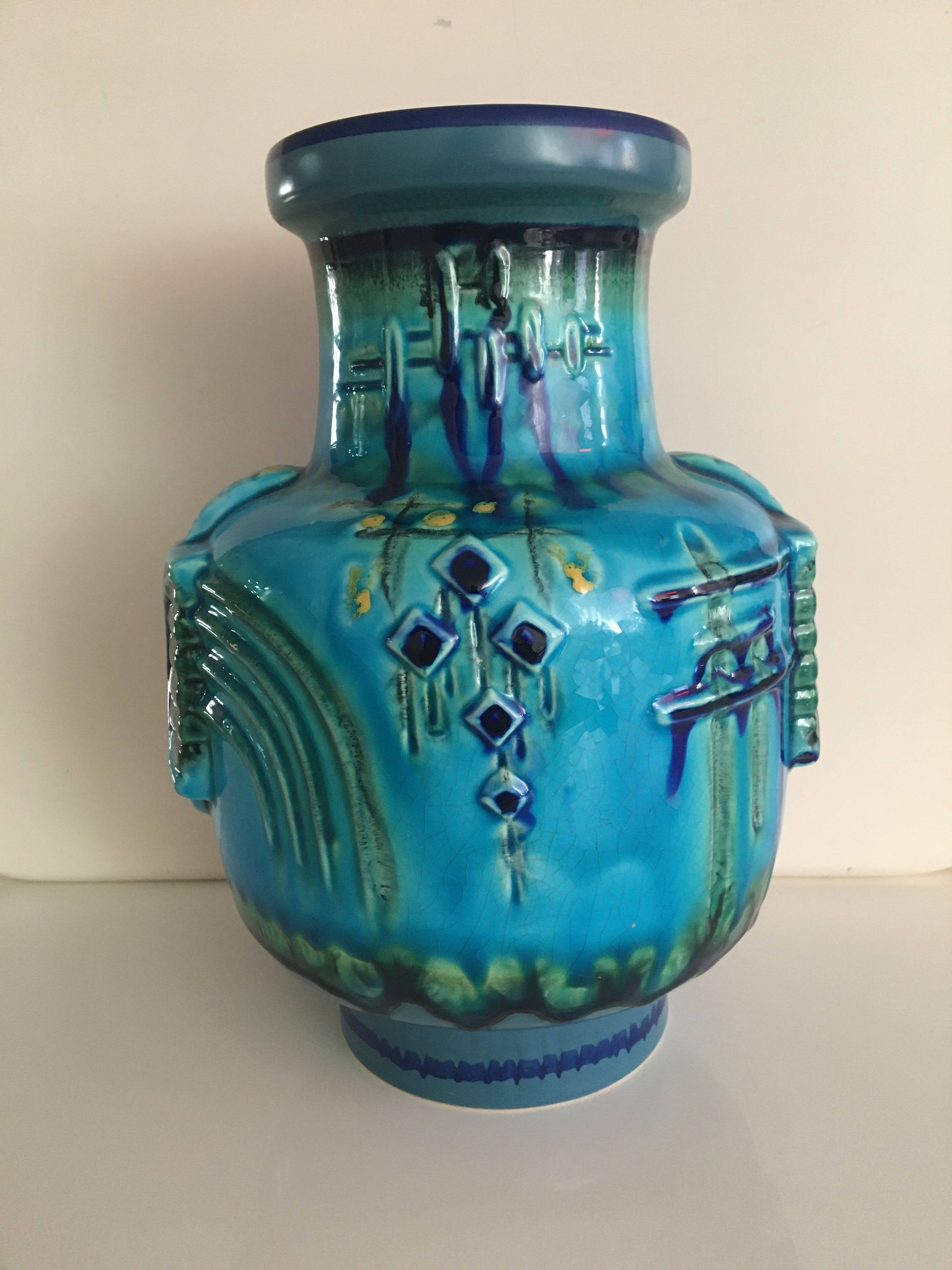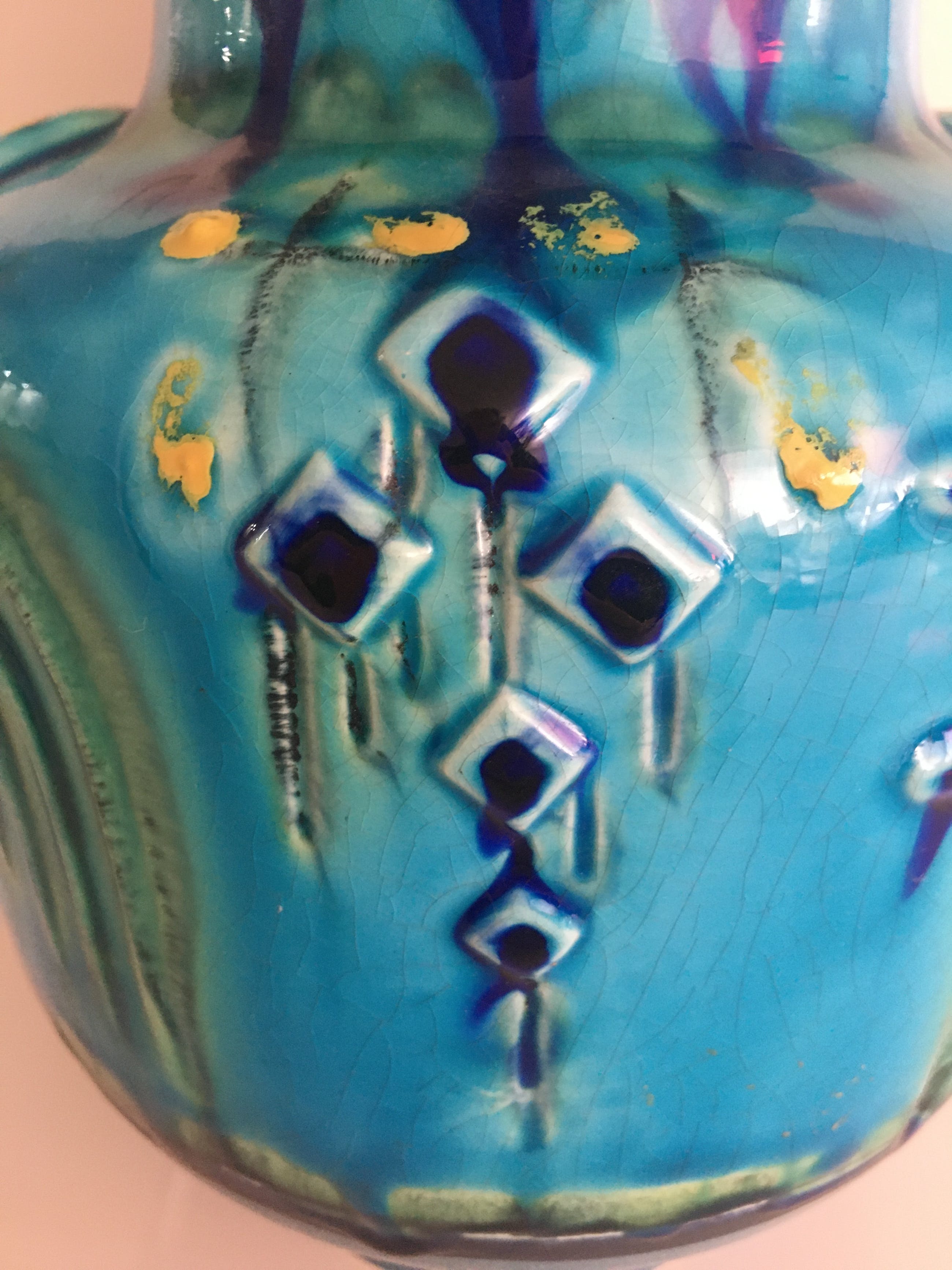 Vaas met prachtige turquoise kleuren met groen en kobalt. Plateel craquelé FAENZA serie. Onderaan gemerkt : Flora Holland 926.