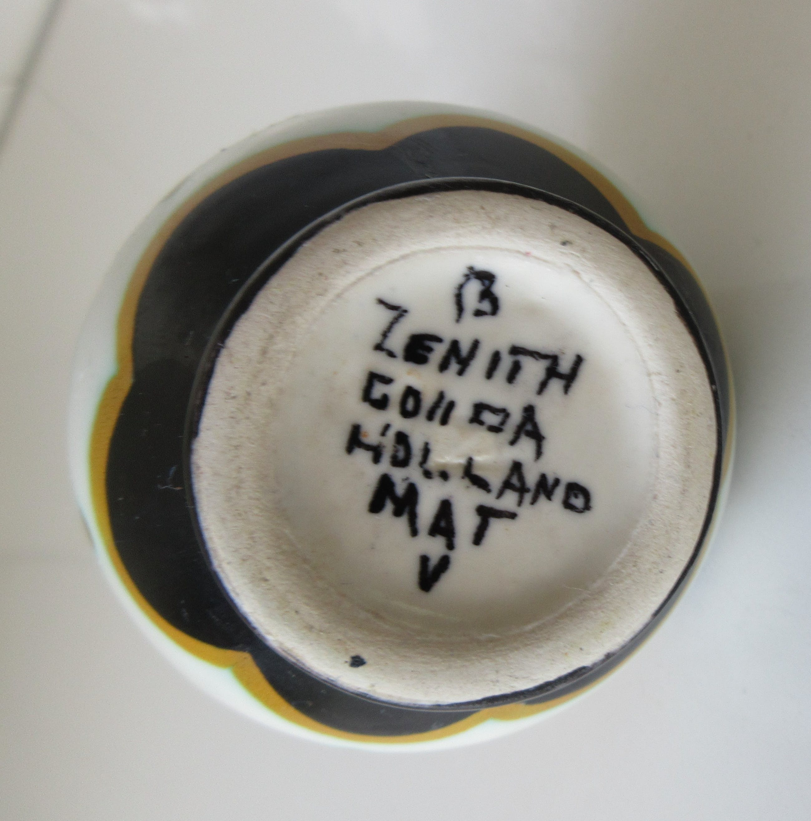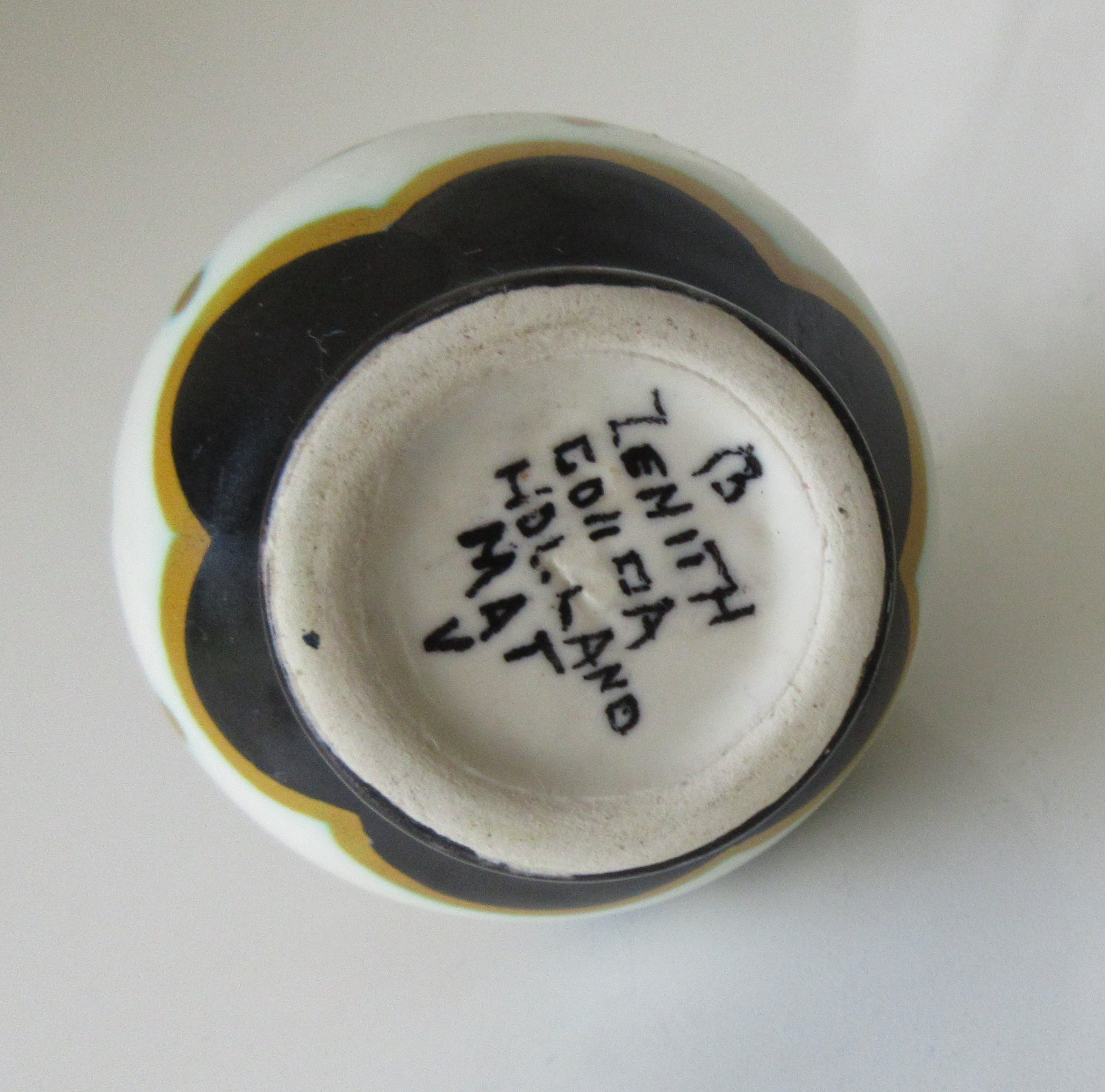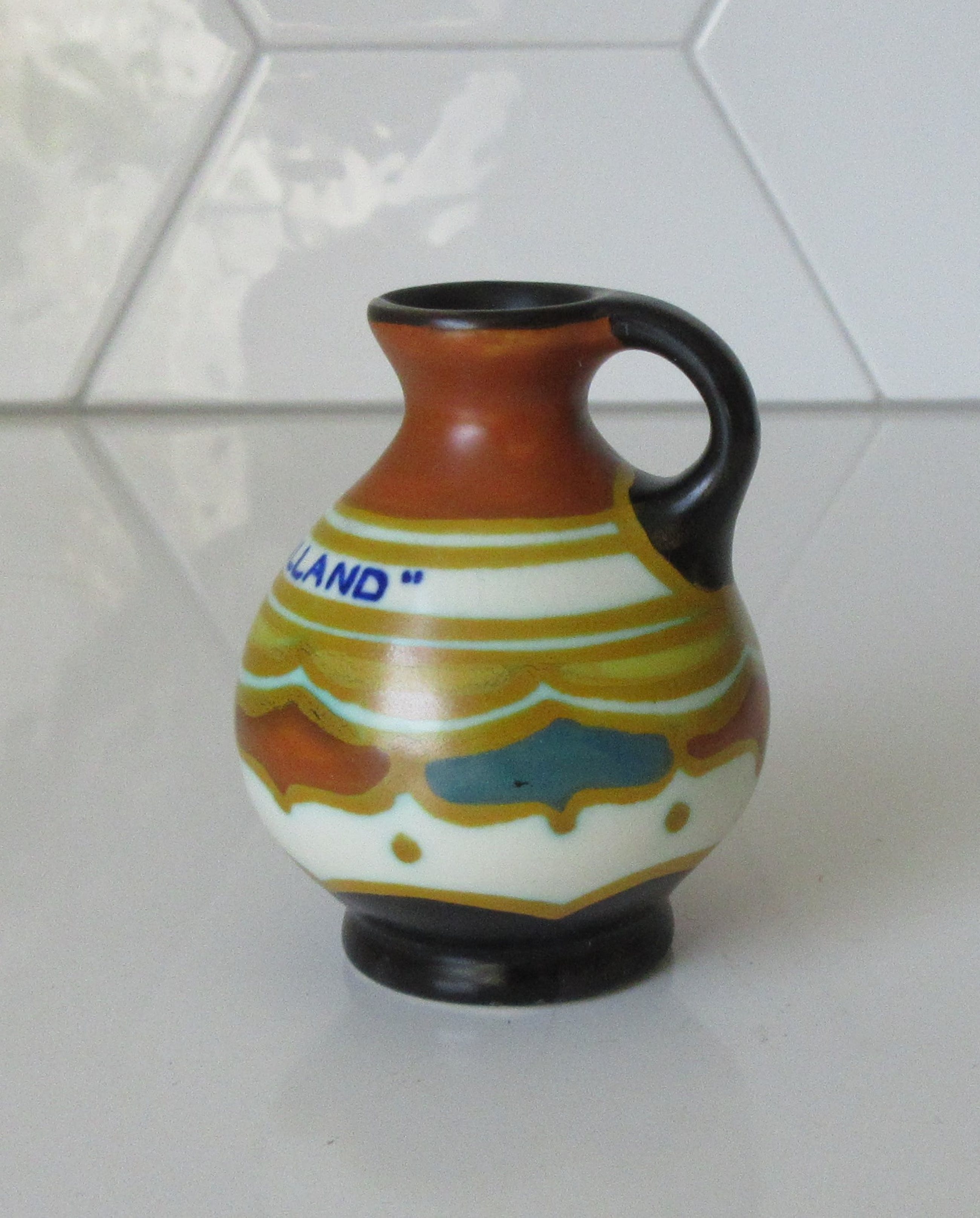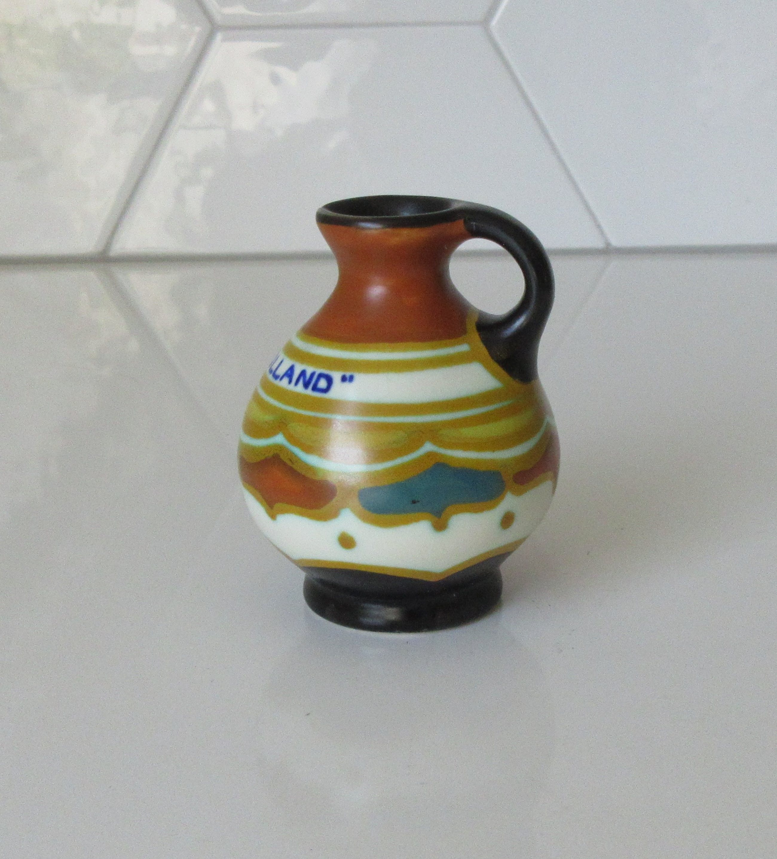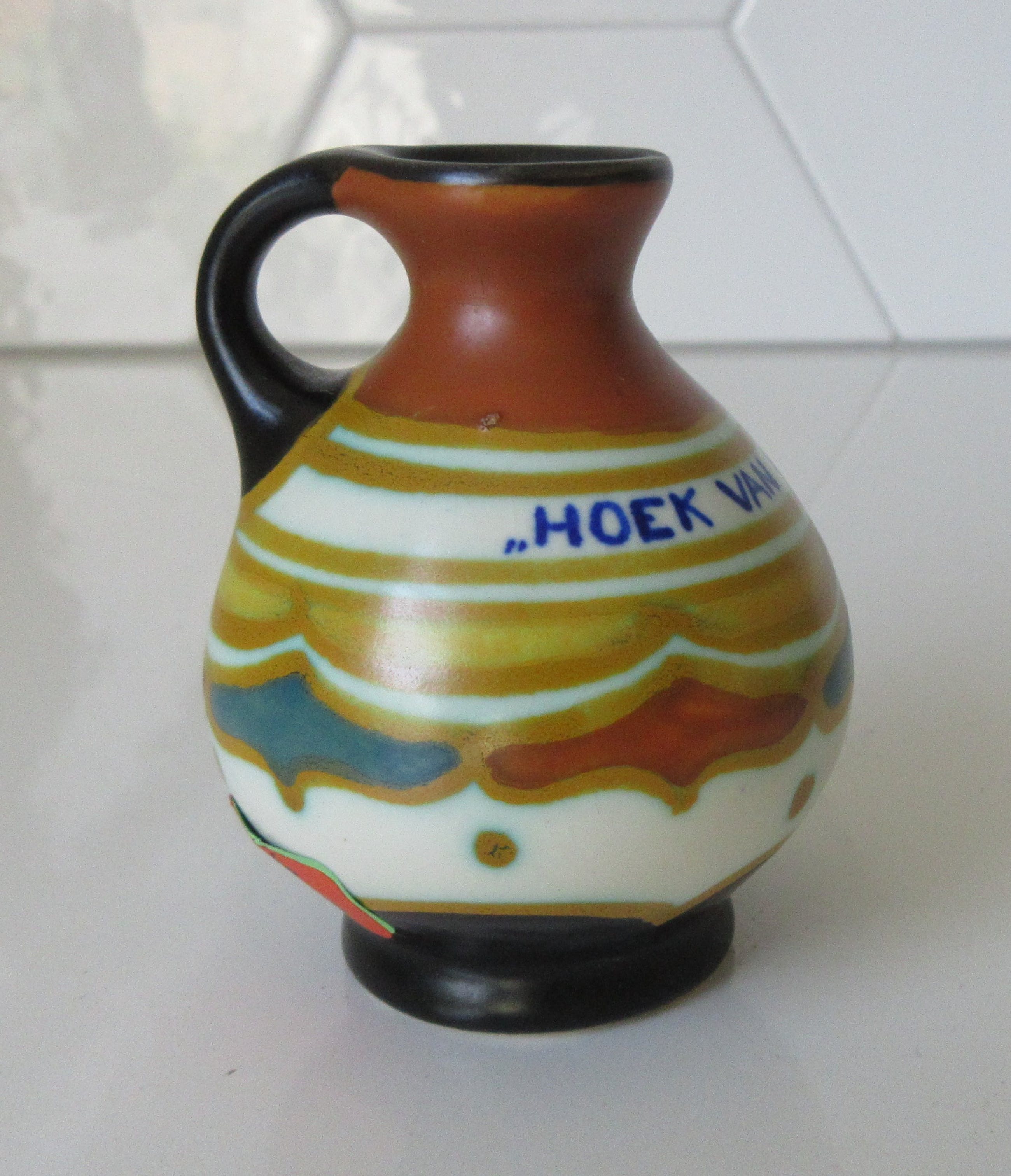 Bibelot platelen kannetje met mat decor uitgevoerd bij plateelbakkerij Zenith uit Gouda. Deze Bibelot is gemaakt voor het toerisme in de jaren'20-'30 voor Hoek van Holland. In perfecte onbeschadigde conditie en met de hand gesigneerd aan de onderzijde.