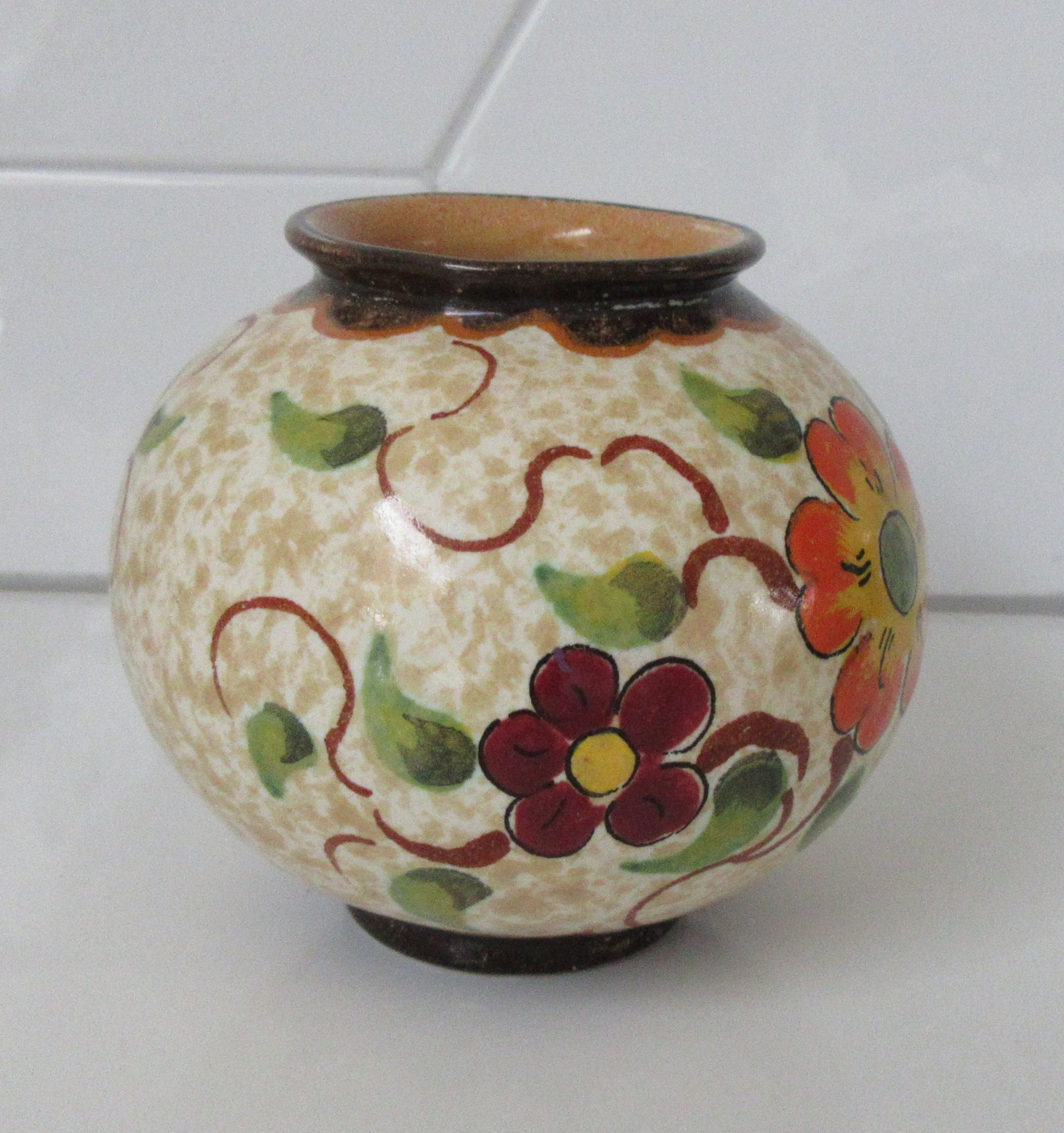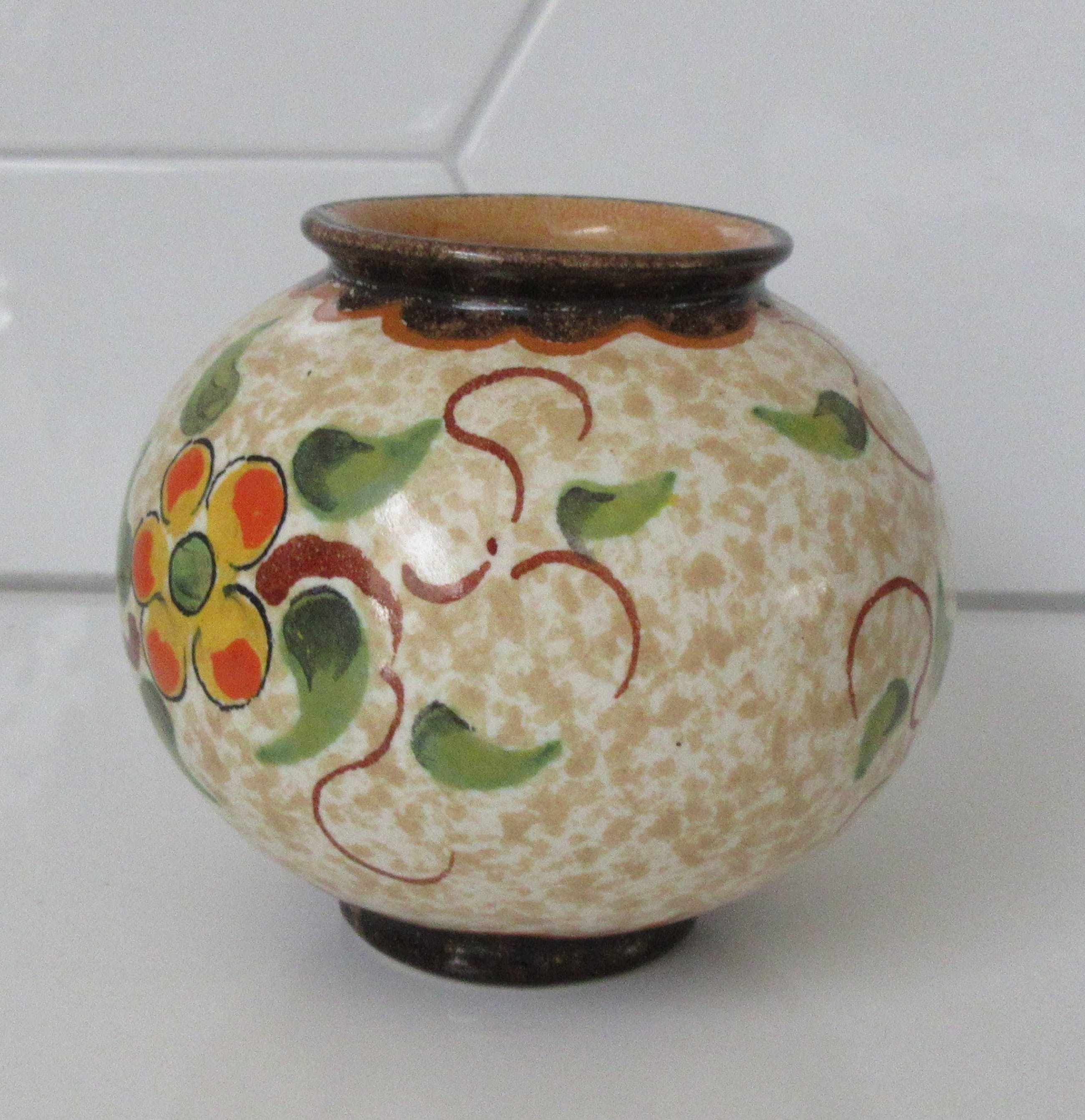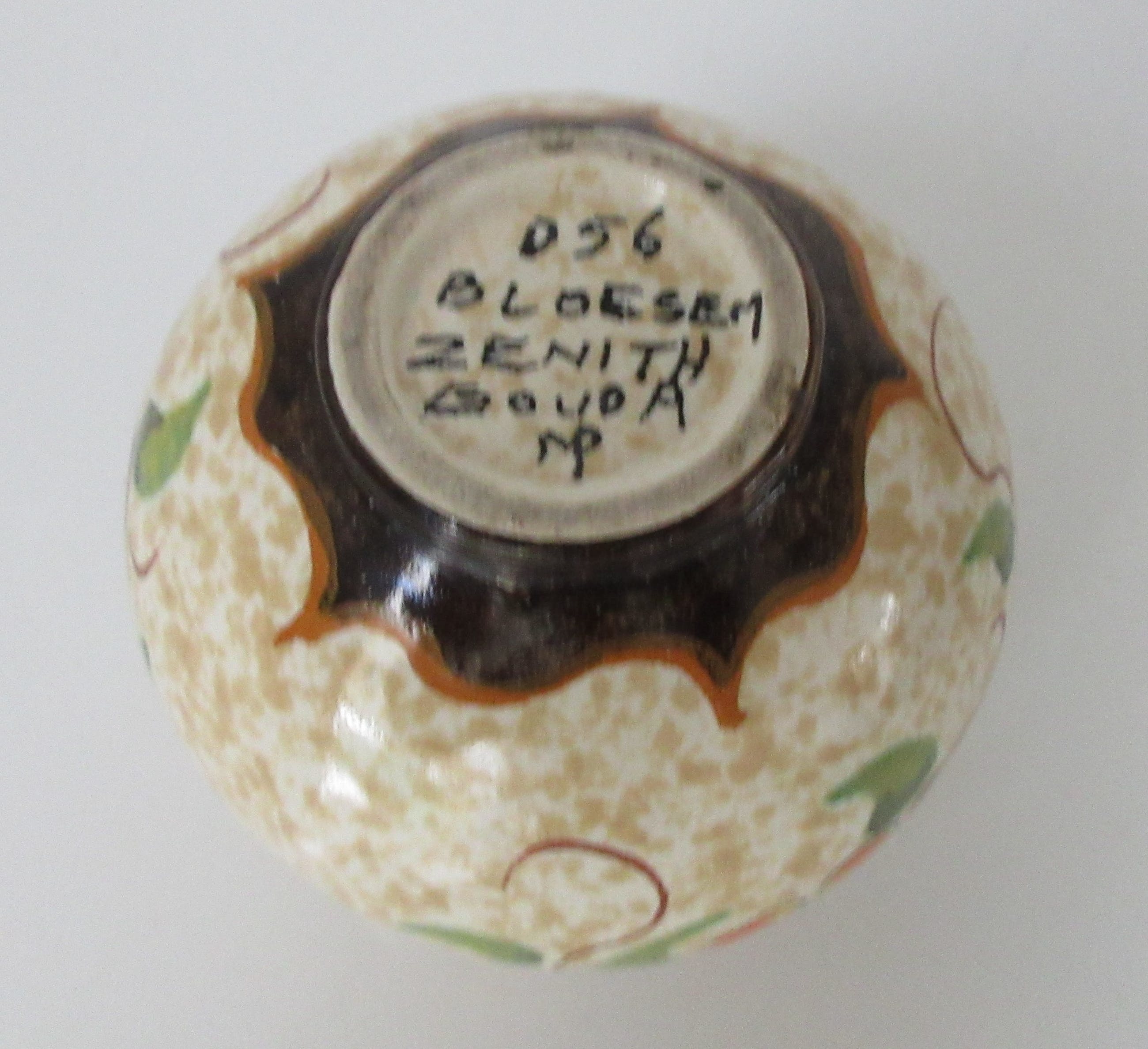 Klein platelen Bolvaasje decor Bloesem, uitgevoerd bij plateelbakkerij Zenith uit Gouda. Met de hand gemerkt, gesigneerd en genummerd aan de onderzijde.