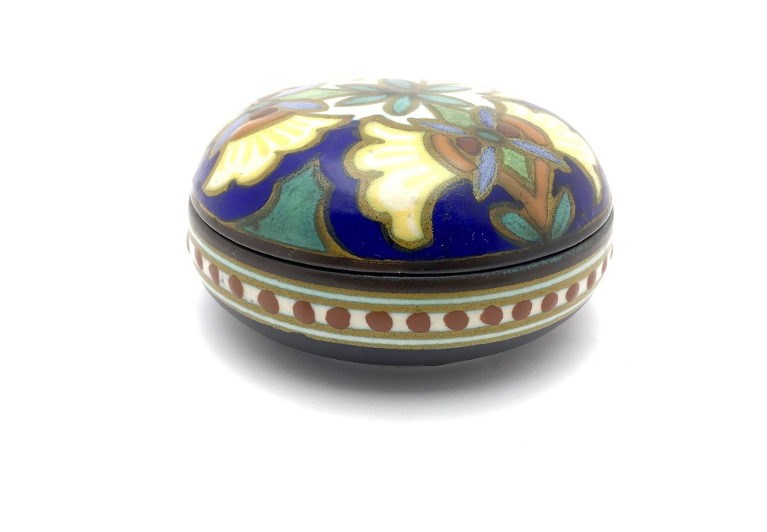 Zeer decoratief en goed ontworpen Plateelbakkerij Zuid Holland dekselschaal met polychroom decor madeleine uit 1929.