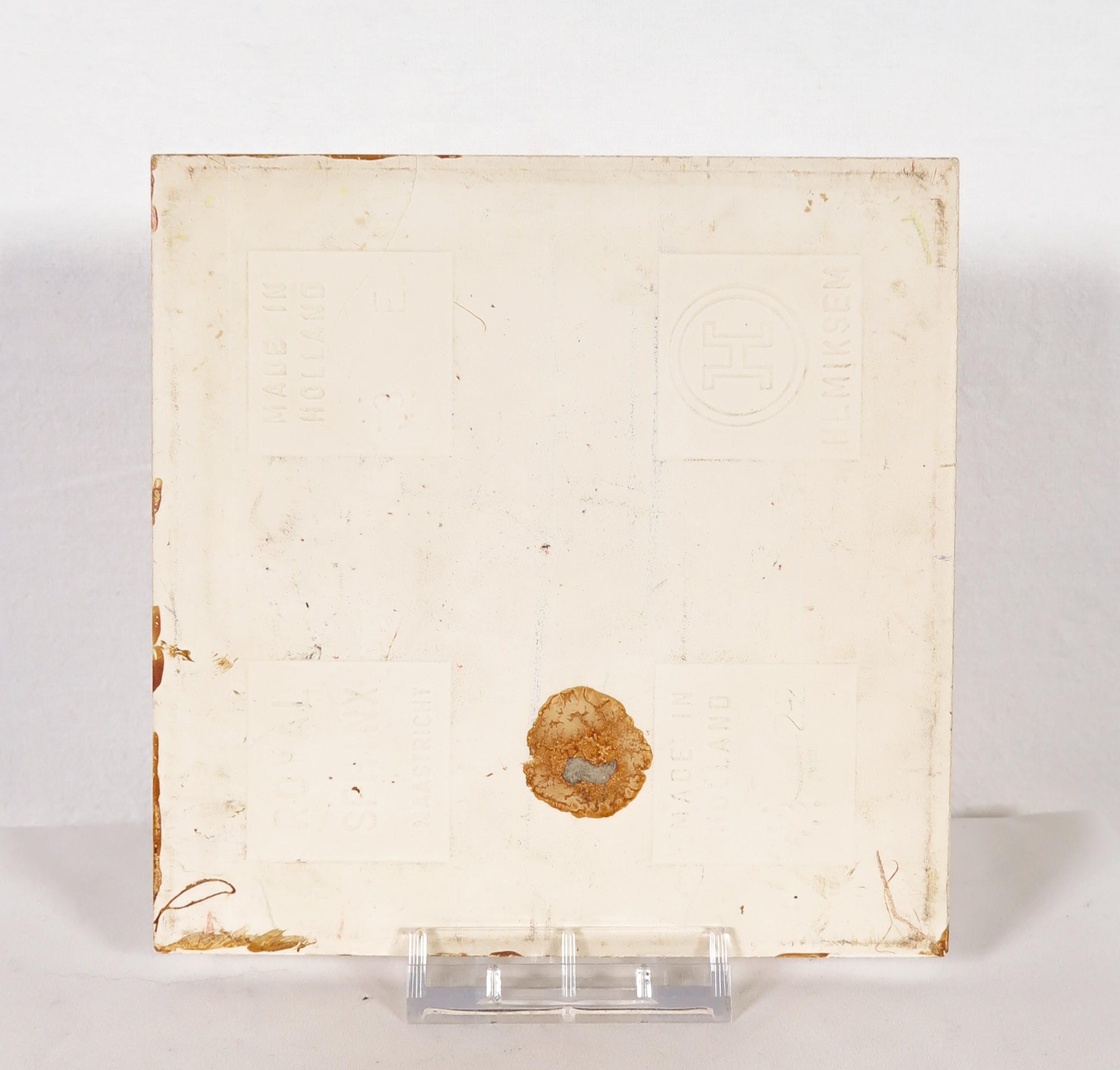 | An sich goede conditie: Kruik/fles heeft craquelé in het glazuur. Aan de kant van de oranjeboom zit een voelbare scheur in het glazuur. De bordjes en de tegel hebben gebruikssporen. | |||||||||||
