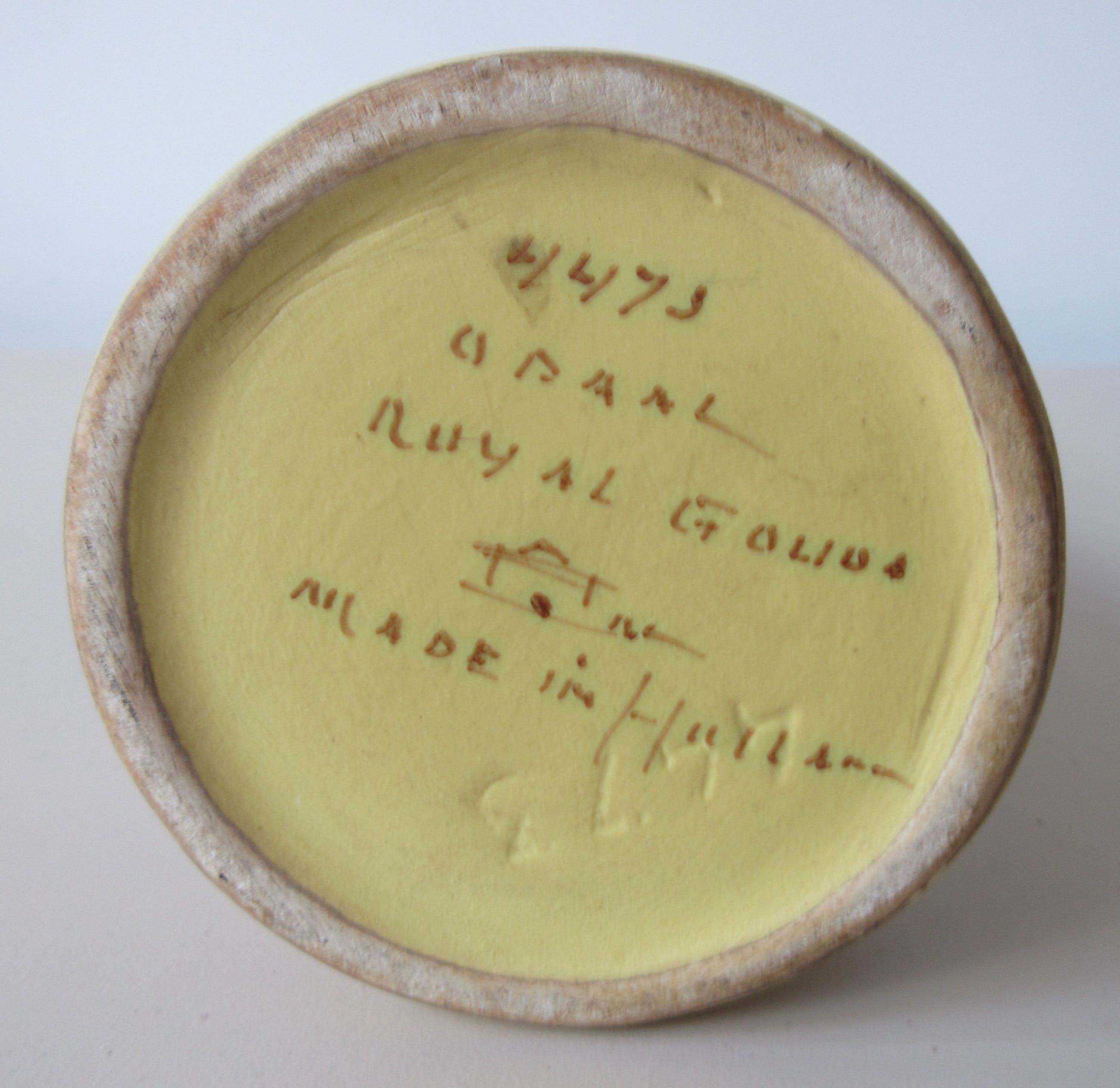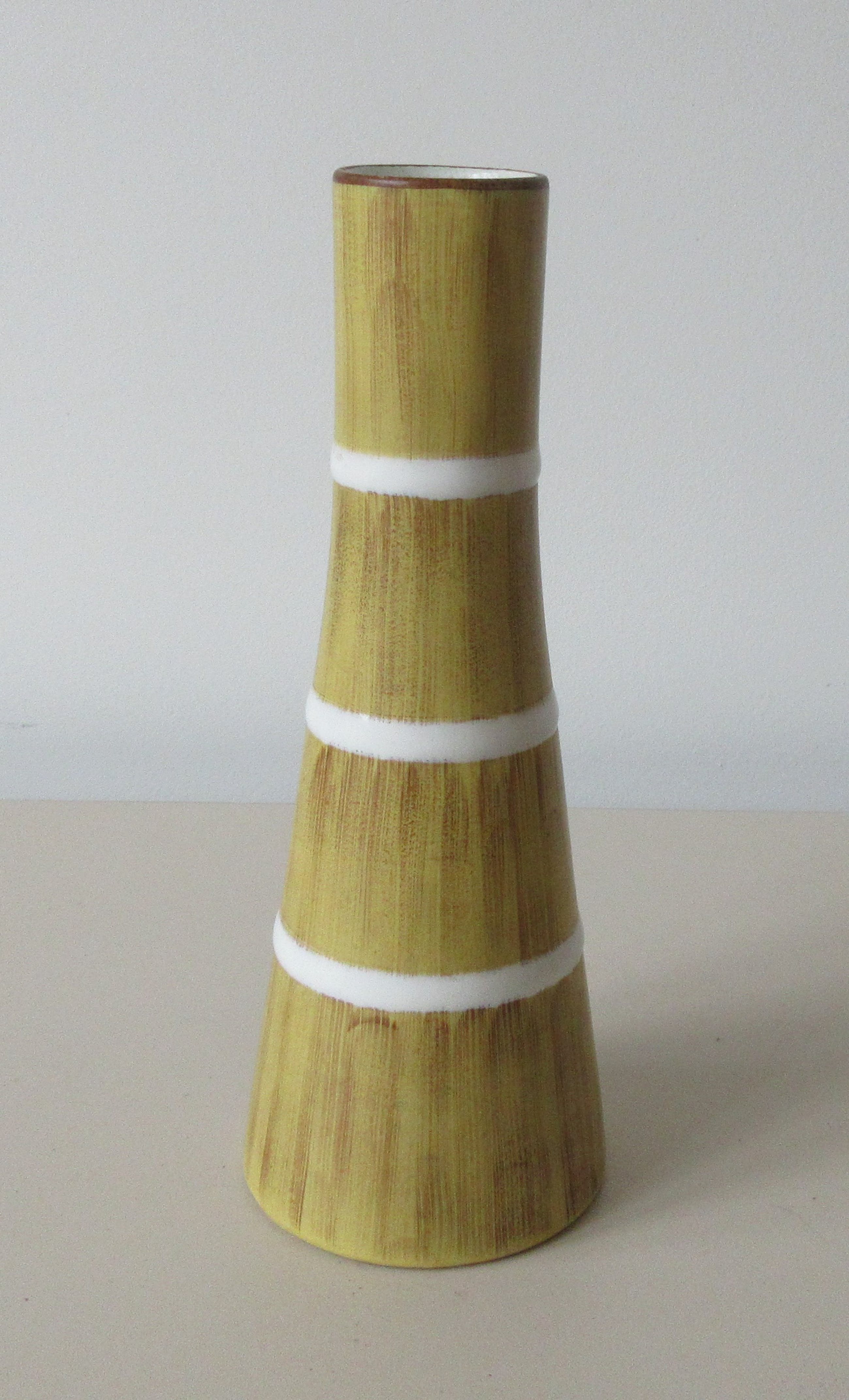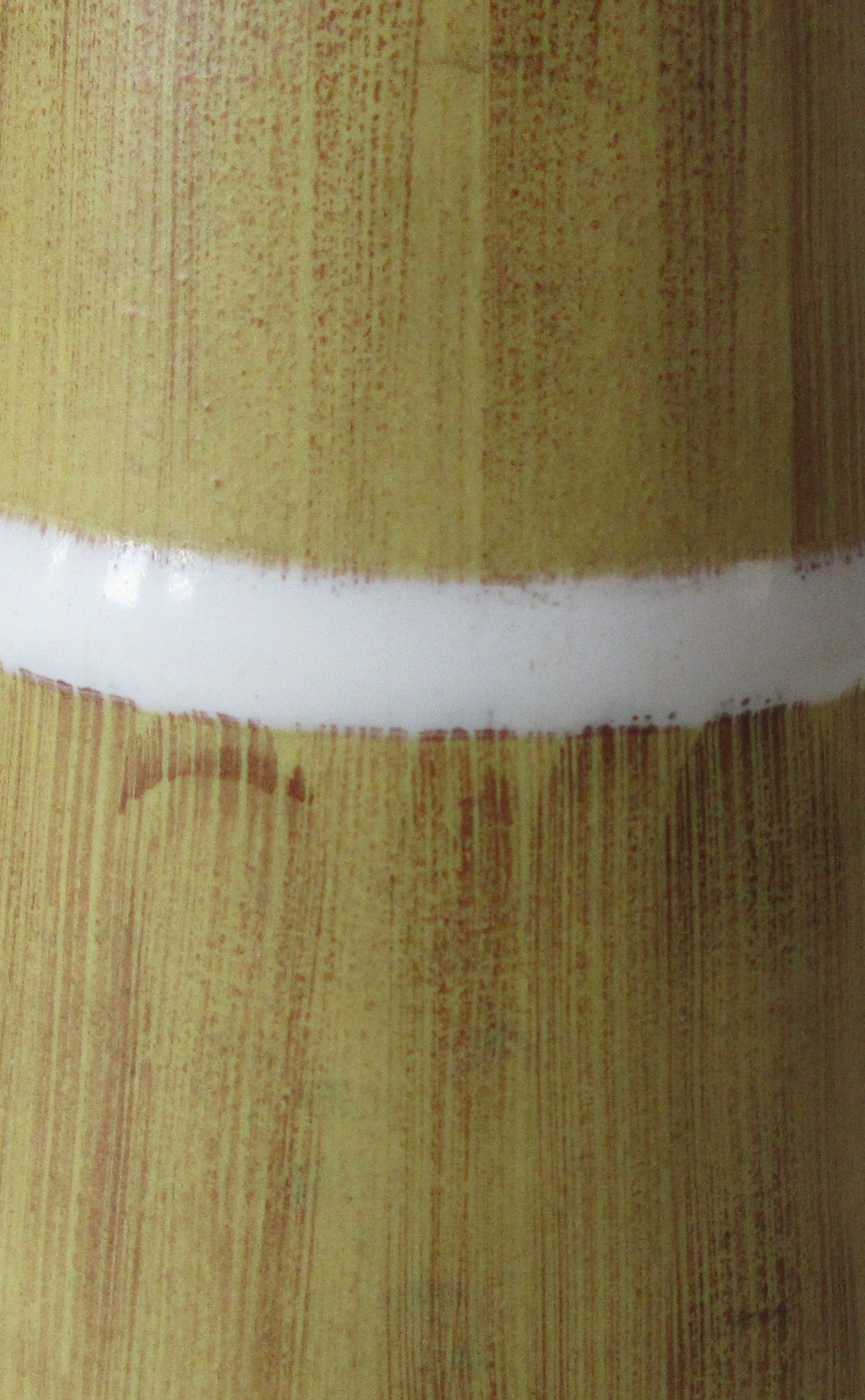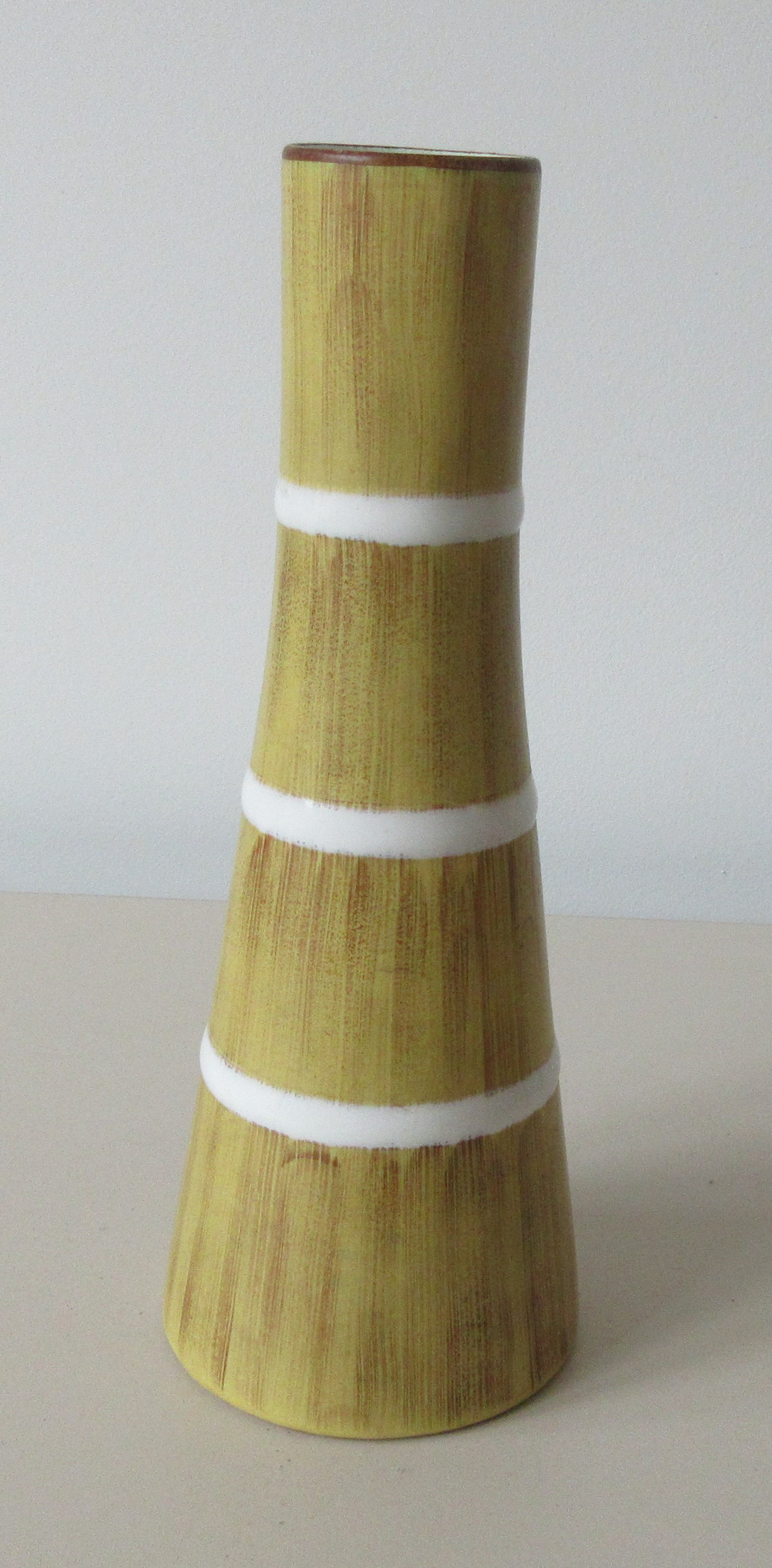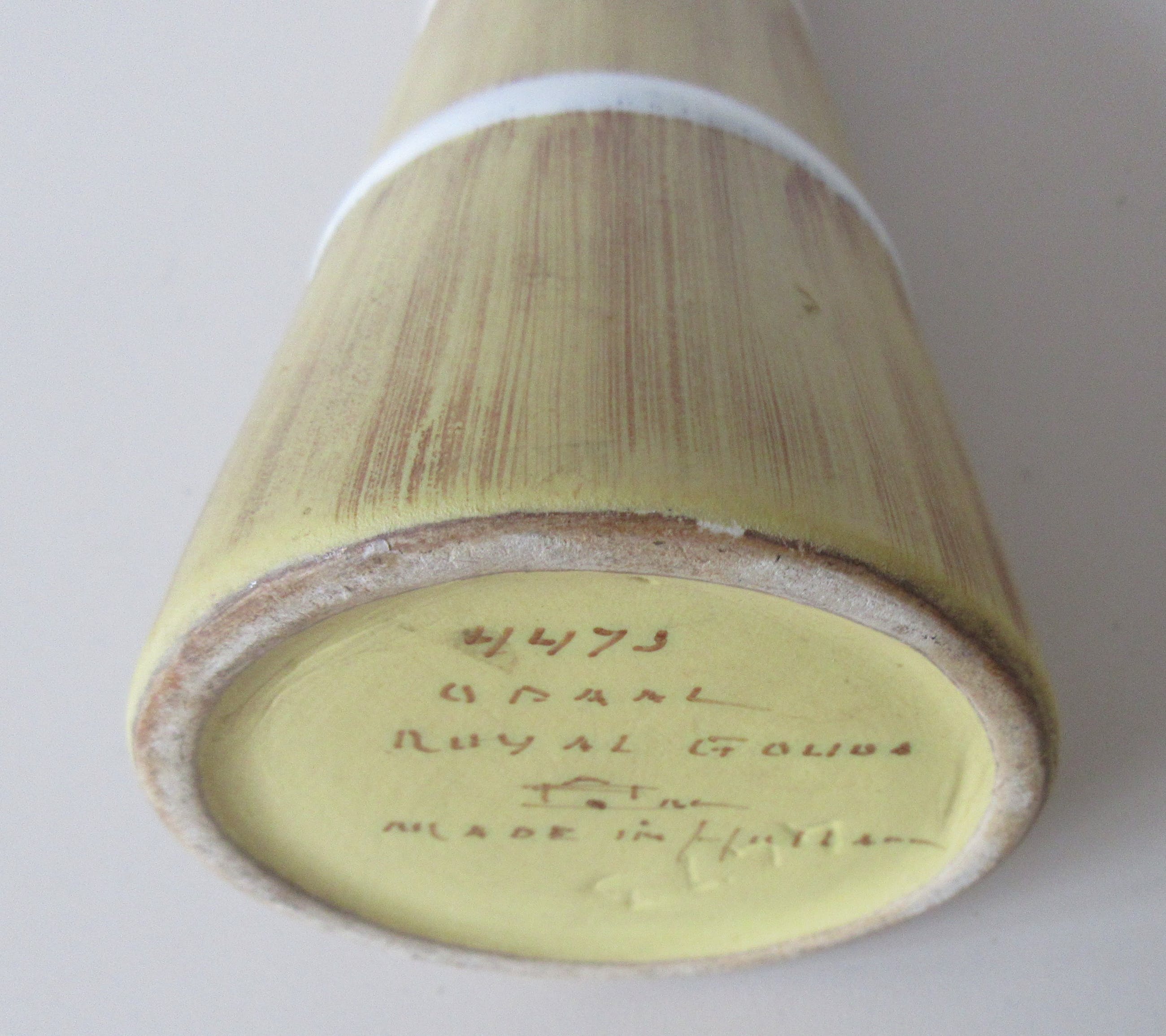Fifties platelen vaasje met faux bamboe decor Opaal van plateekbakkerij Zuid Holland uit Gouda. Met de hand gedecoreerd en met de hand gemerkt. Gemaakt in het 2e deel van de jaren'50.