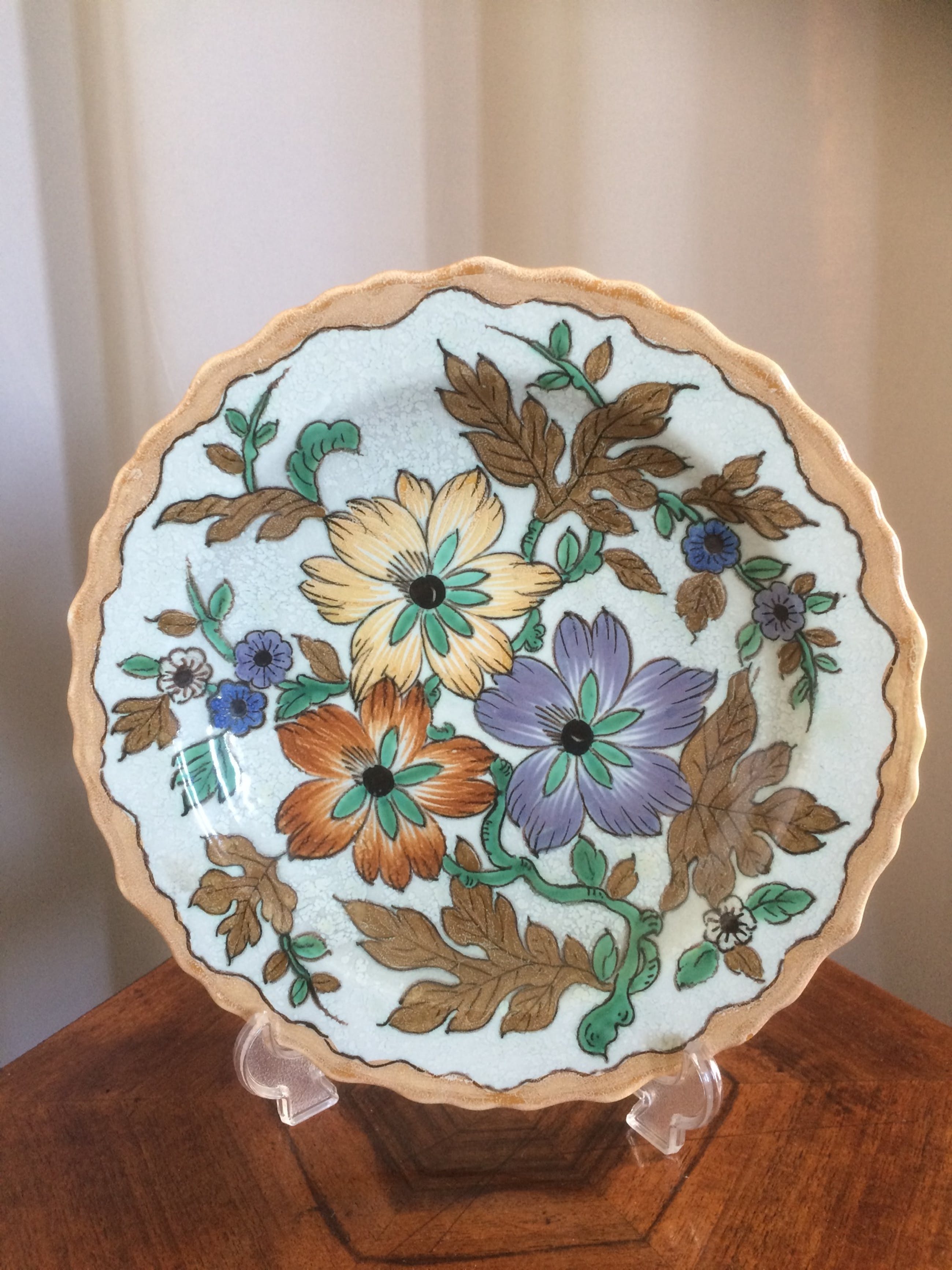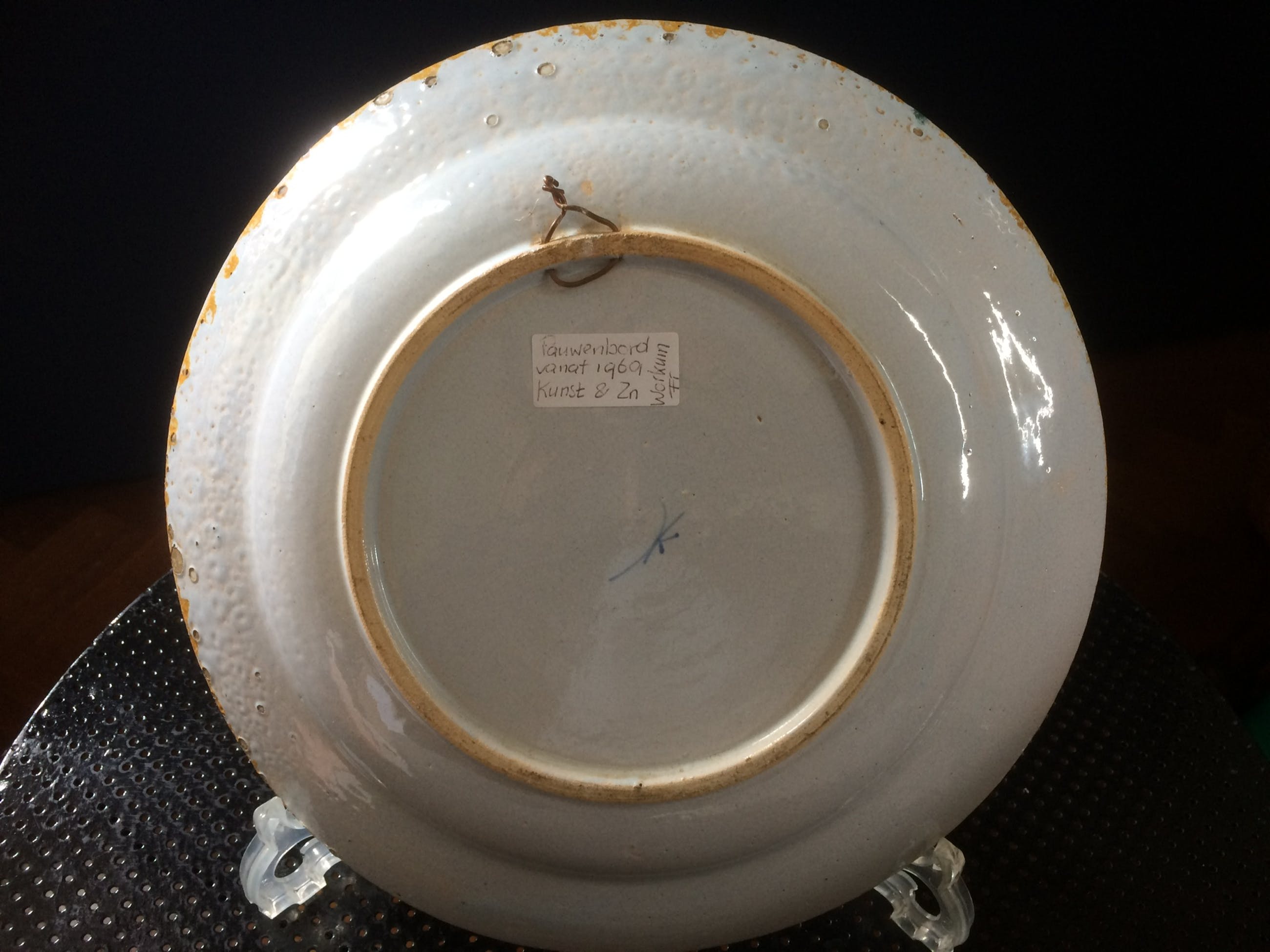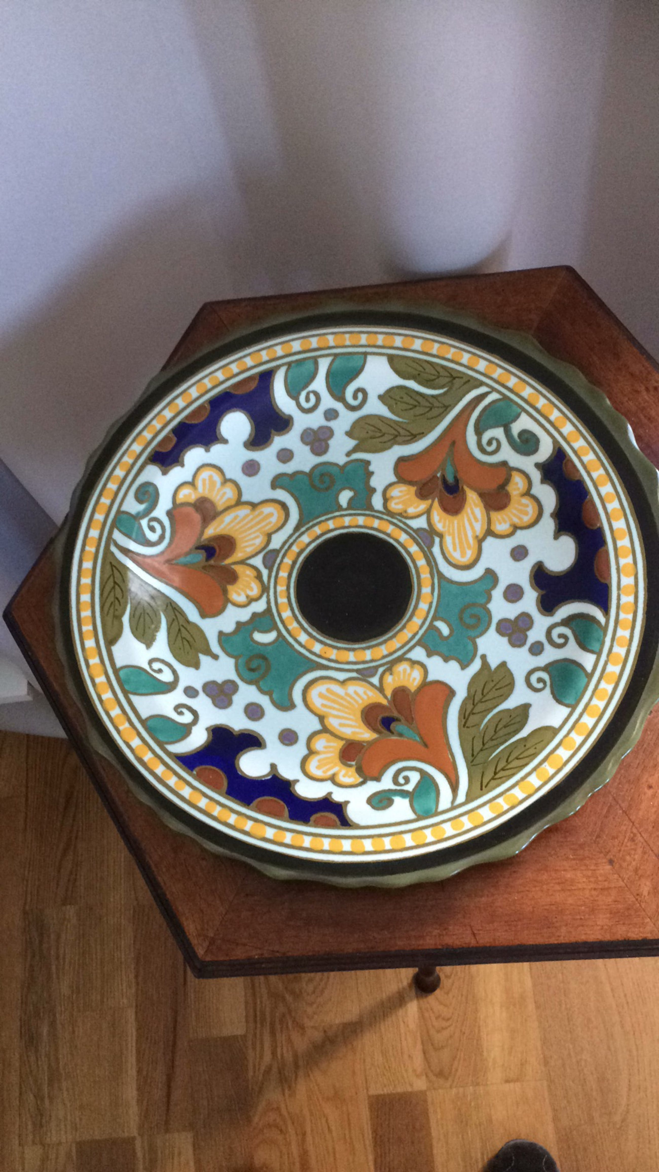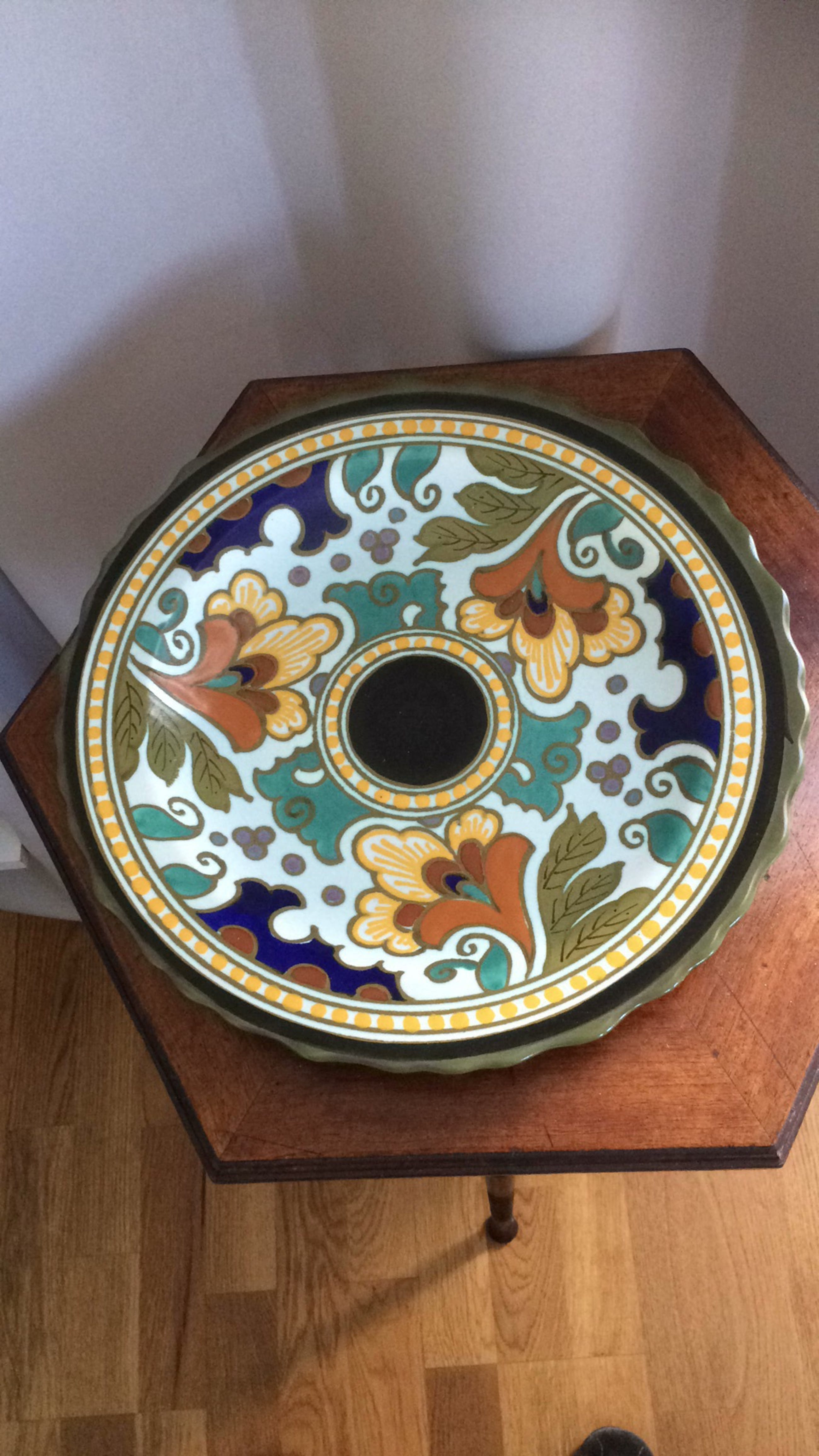 Wandbord van Gouds plateel met fraai bloem-decor. Conditie is MINT!! Zie voor signering en decor-omschrijving foto achterzijde. Aangetekende/verzekerde verzending . Kosten koper: Nederland € 10,-; naar buitenland: zie de internationale verzekerde pakketpost-tarieven. Op afspraak is contactloos ophalen in Rotterdam mogelijk !