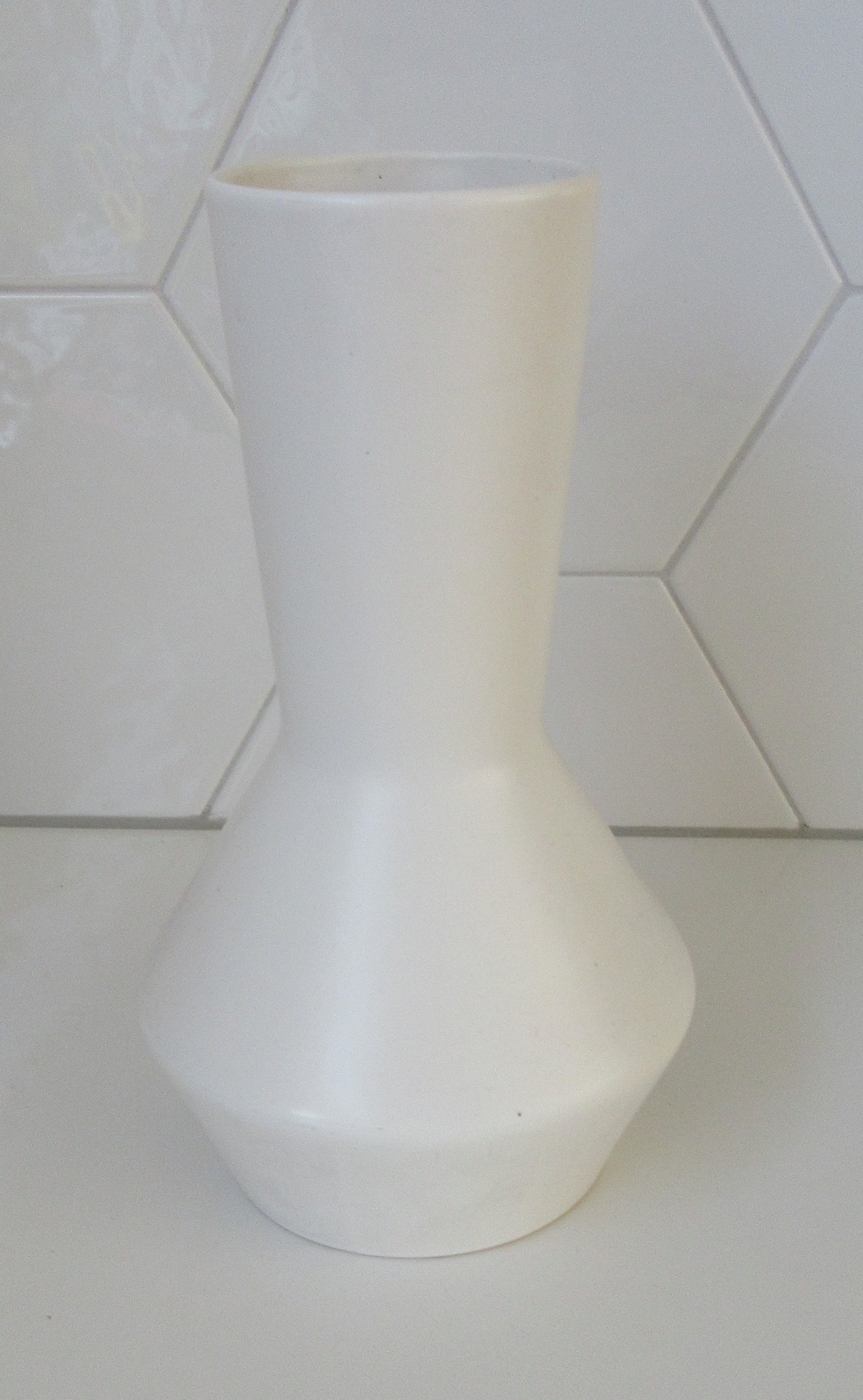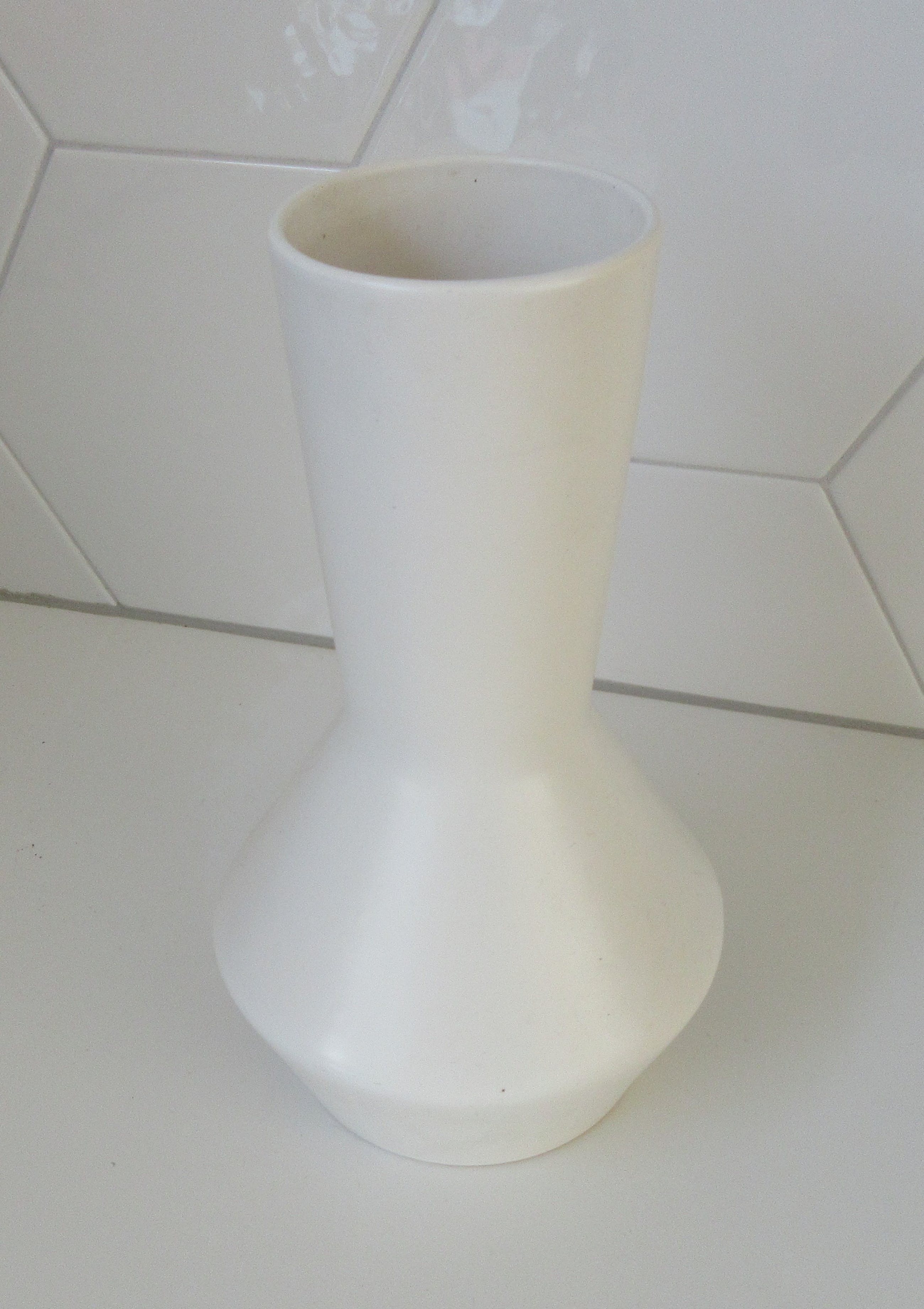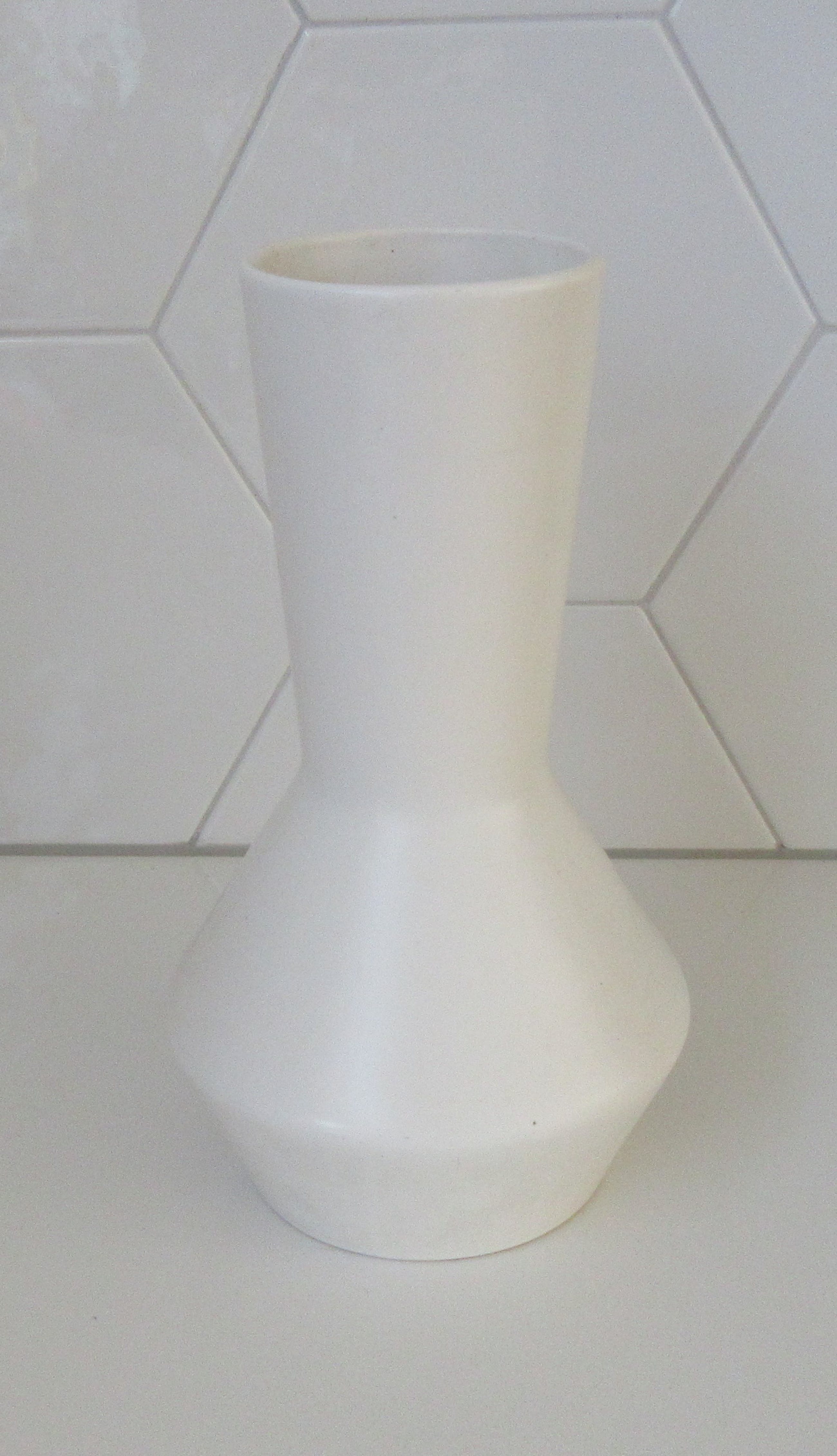 Gestileerde mat witte platelen vaas, uitvoering Plazuid Gouda. In prima conditie. Met de hand gemerkt aan de onderzijde.