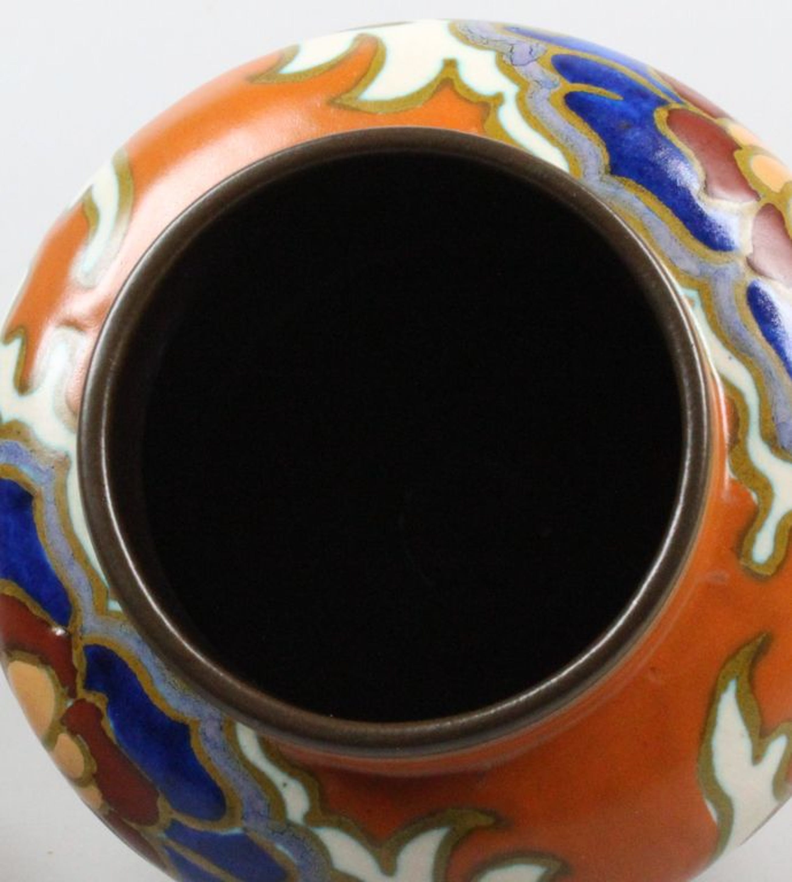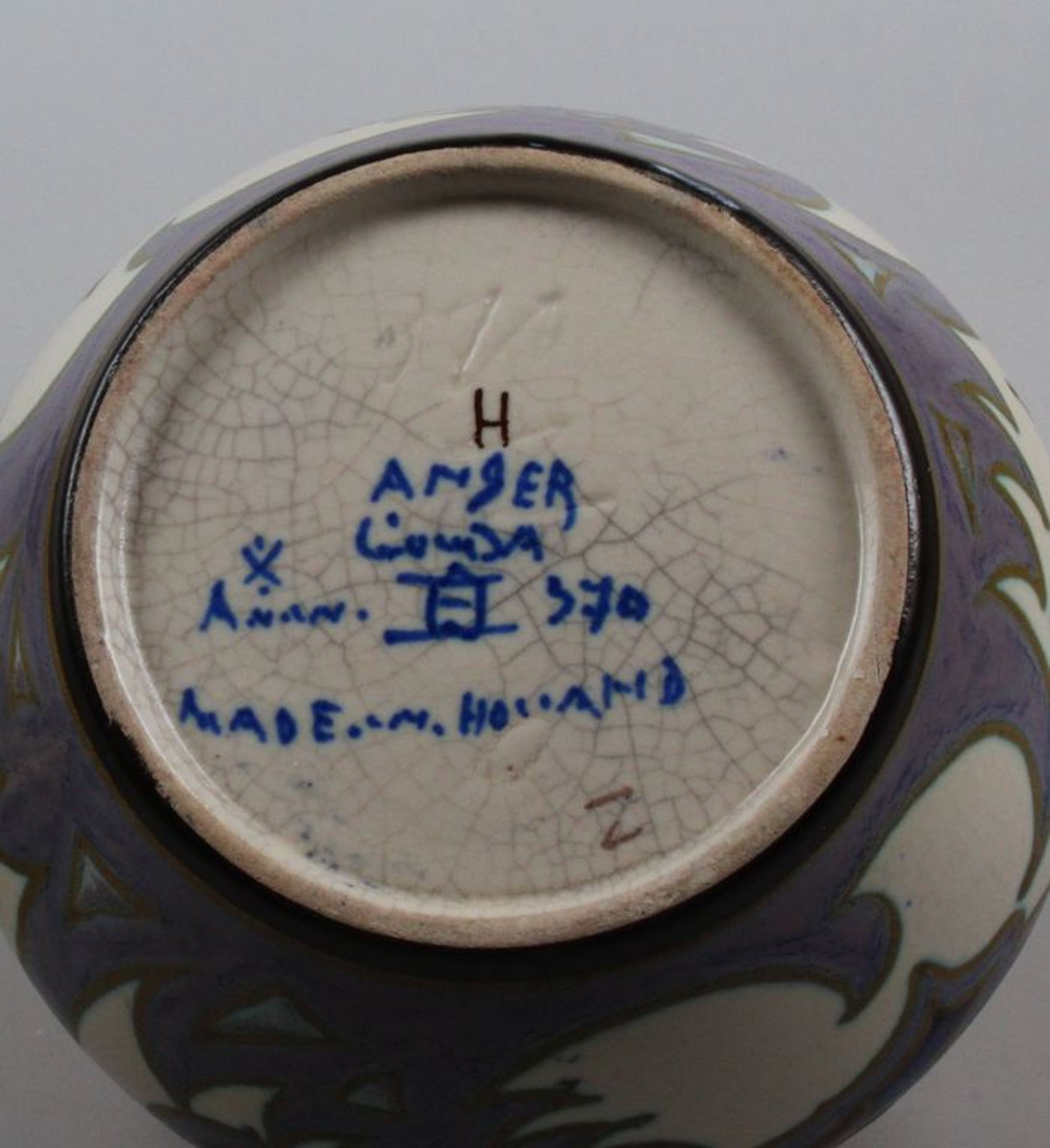 Gouds platelen rozensteker met originele metalen rastertje. Plateelbakkerij Zuid-Holland Gouda, decor Anjer. Hoogte 10 cm. In uitstekende conditie en gemerkt.1926.
