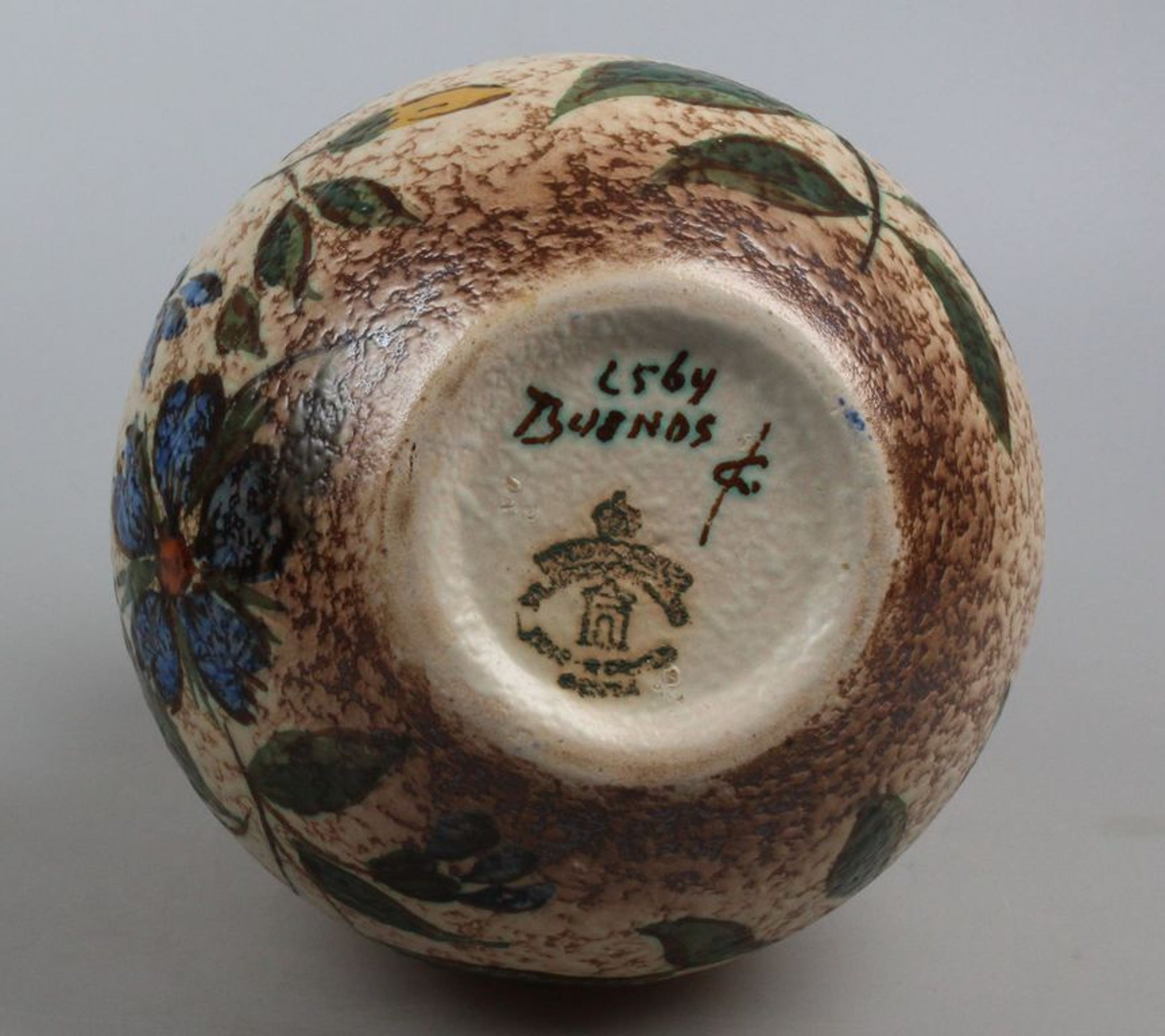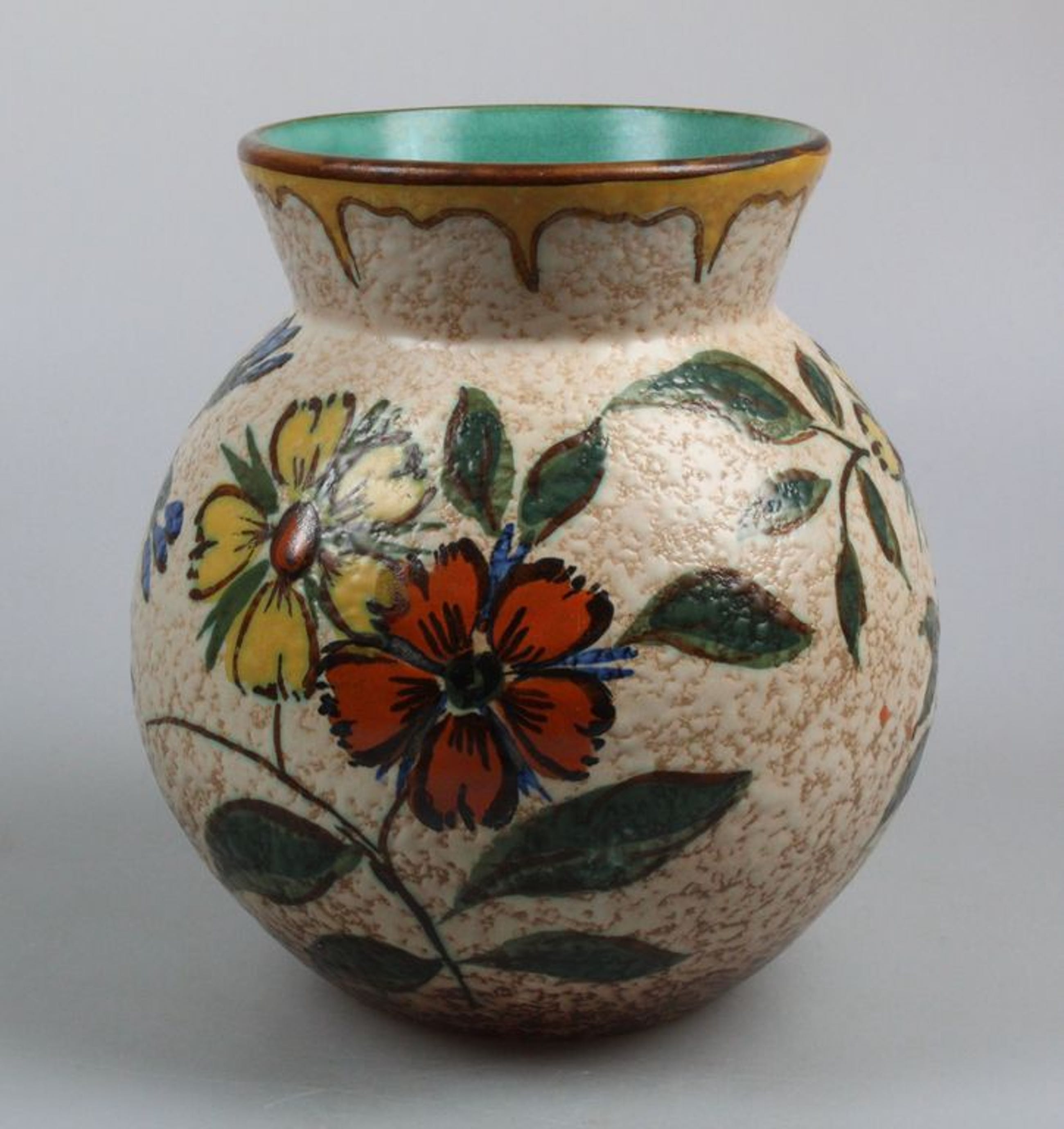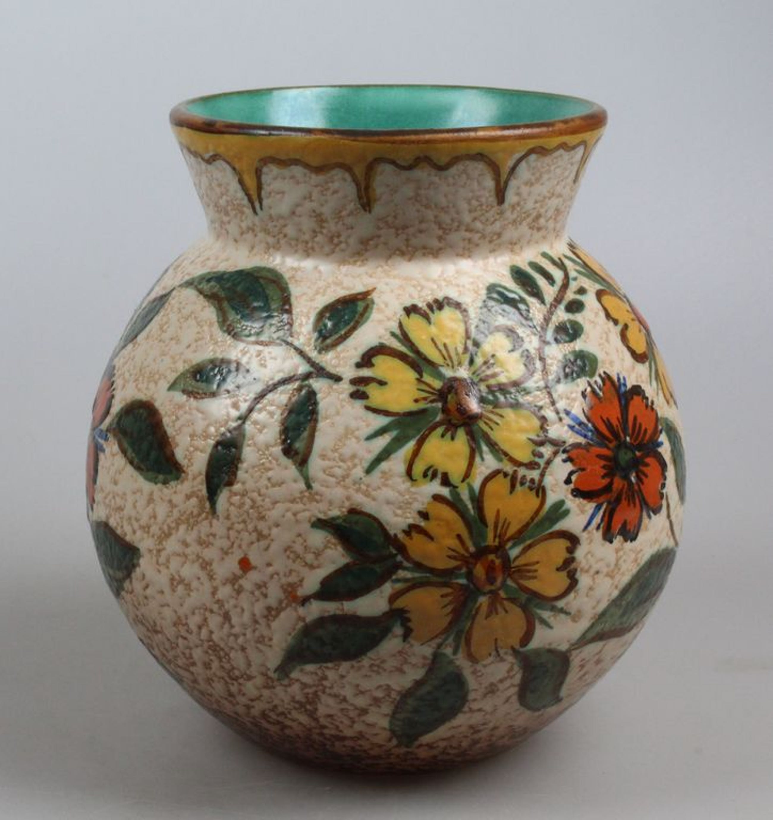 Platelen vaas met decor "Buenos", Plateelbakkerij Zuid-Holland. Jaren'40-'50. Hoogte 14 cm. In uitstekende conditie. Gemerkt.