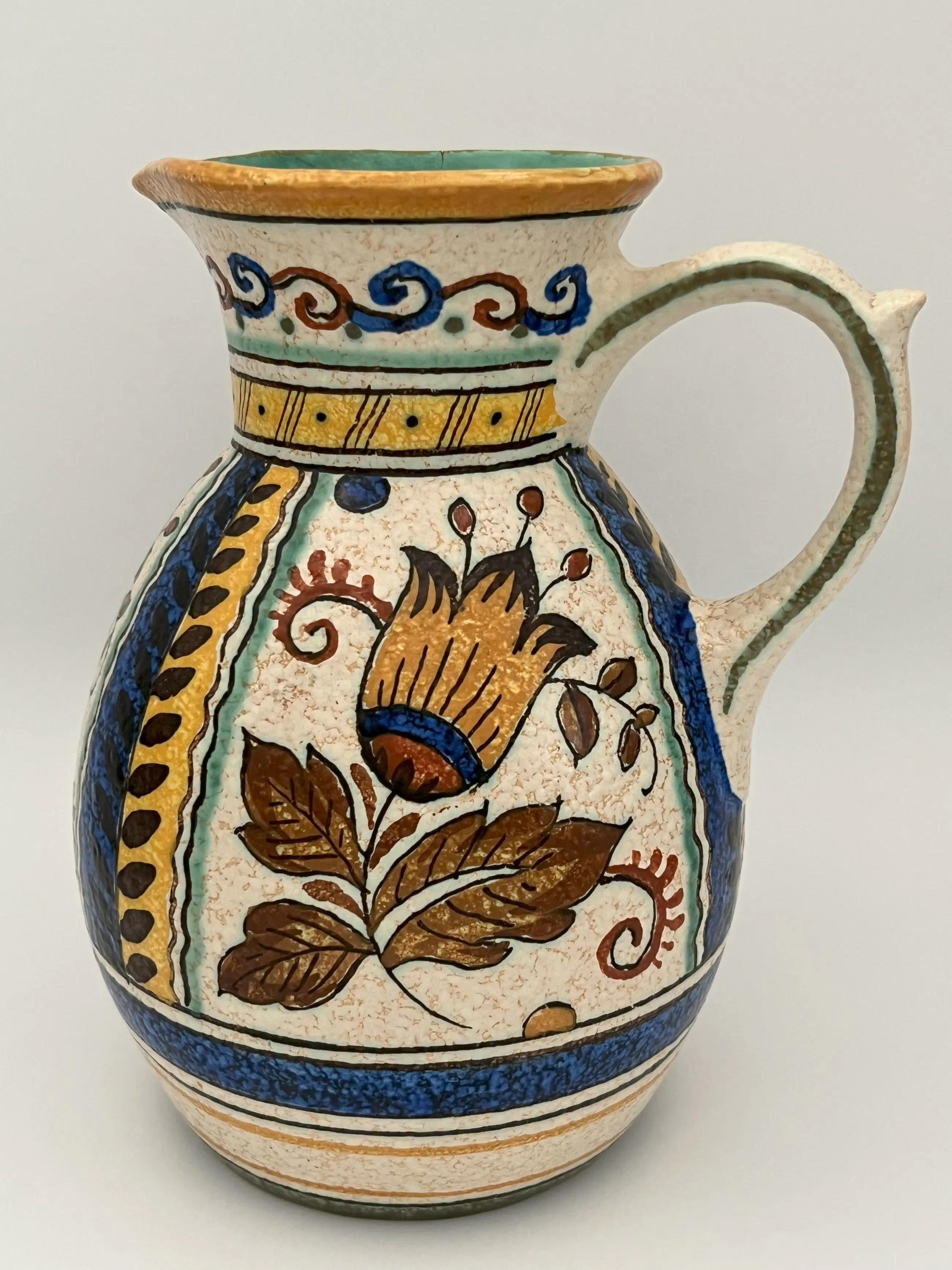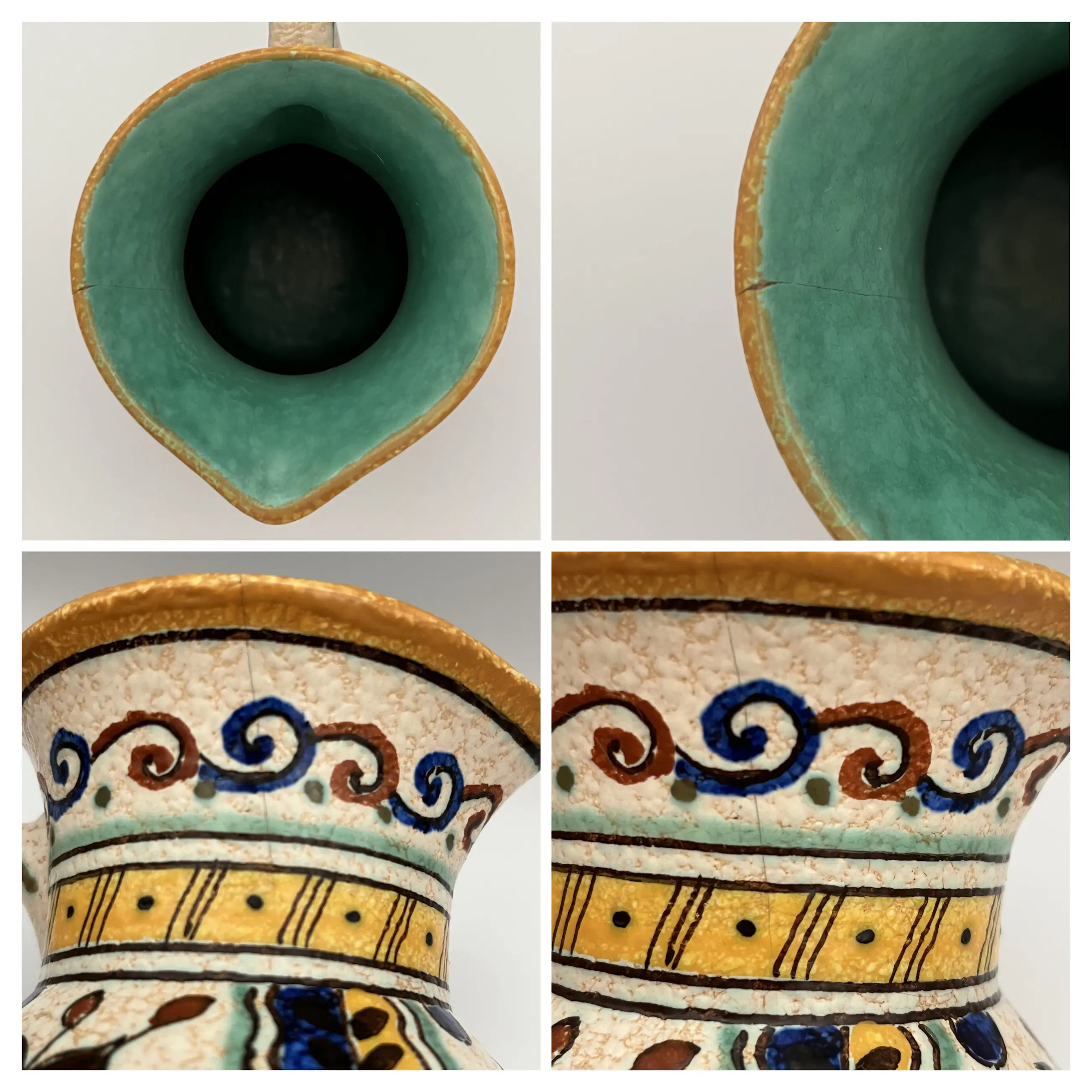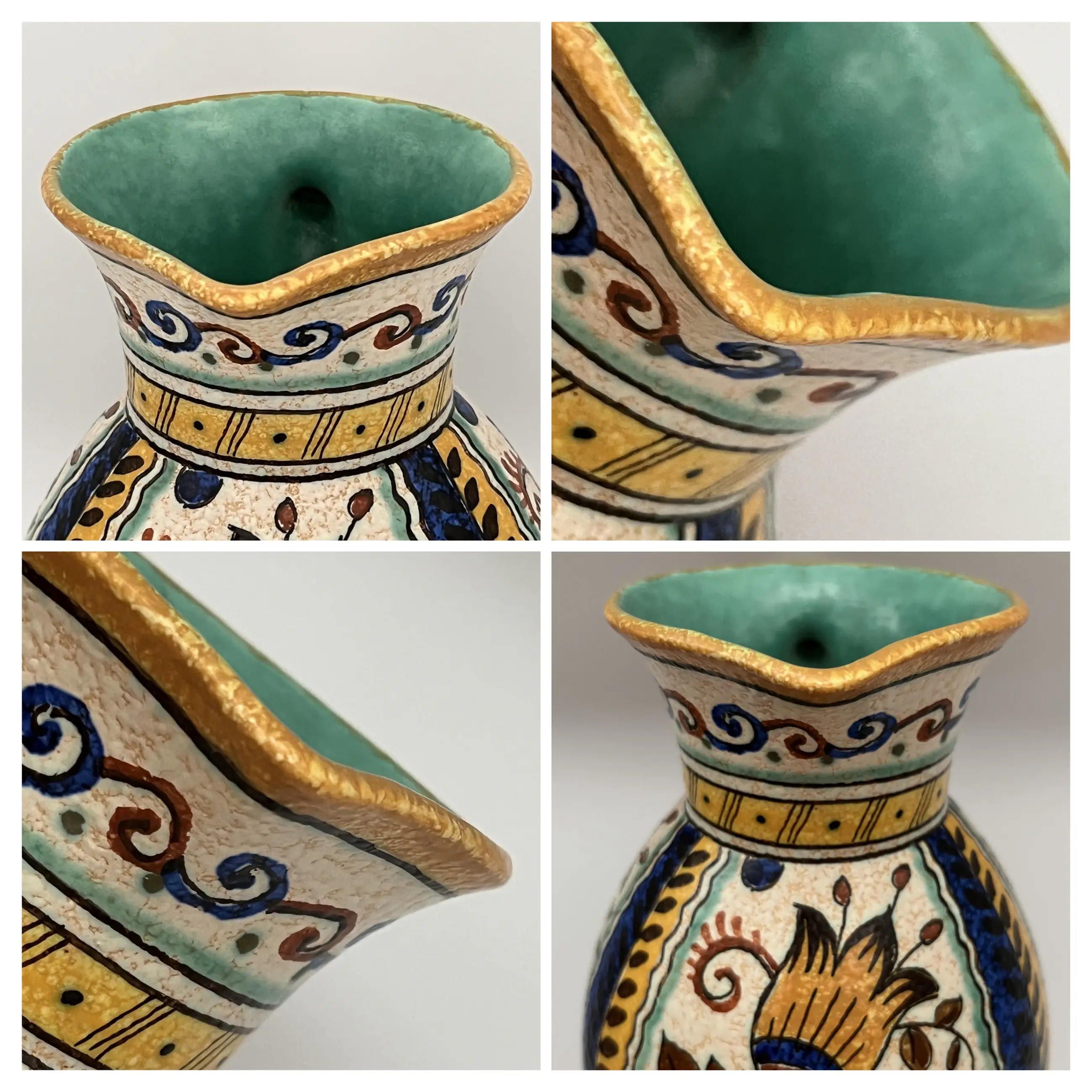 Dit nieuwe matte glazuur werd voor het eerst getoond in 1910 op de Leipziger Messe en vervolgens in 1915 op de World's Fair in San Francisco, VS. Het bleek een groot succes en er werden tot de sluiting van de pottenbakkerij in 1968 producten met matte glazuur gemaakt. Hier wordt een grote kan in matte glazuur aangeboden in het ontwerp ‘JOMA’, met levendige blauwe accenten en prachtige herfstkleuren van geel, rood, groen,bruin en ivoor. De binnenkant van de kan is levendig turkoois. Er zit een kleine chip aan de bovenkant van de rand van de mond, met een haarscheurtje van ongeveer 4,8 cm. (Foto 10 collage)