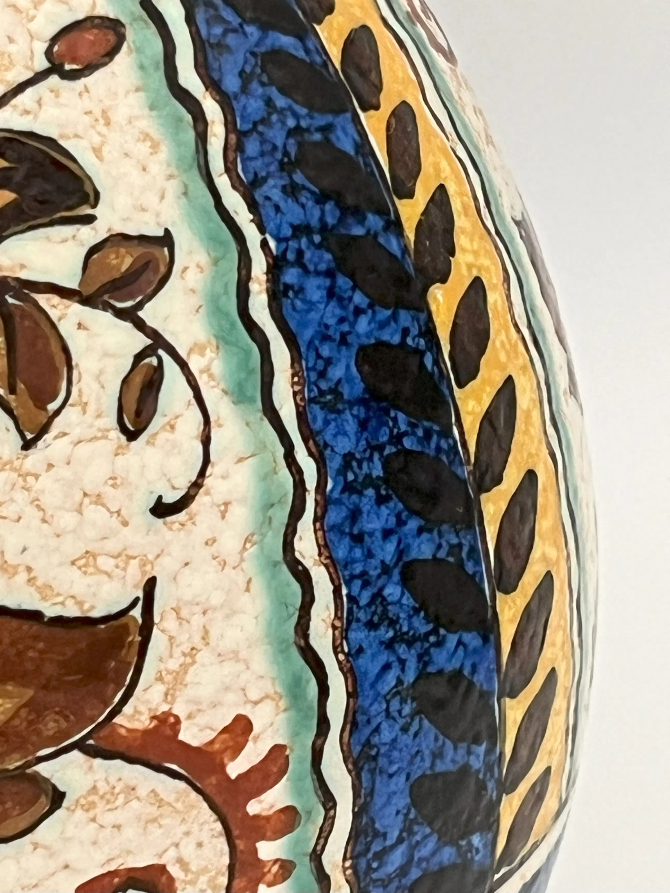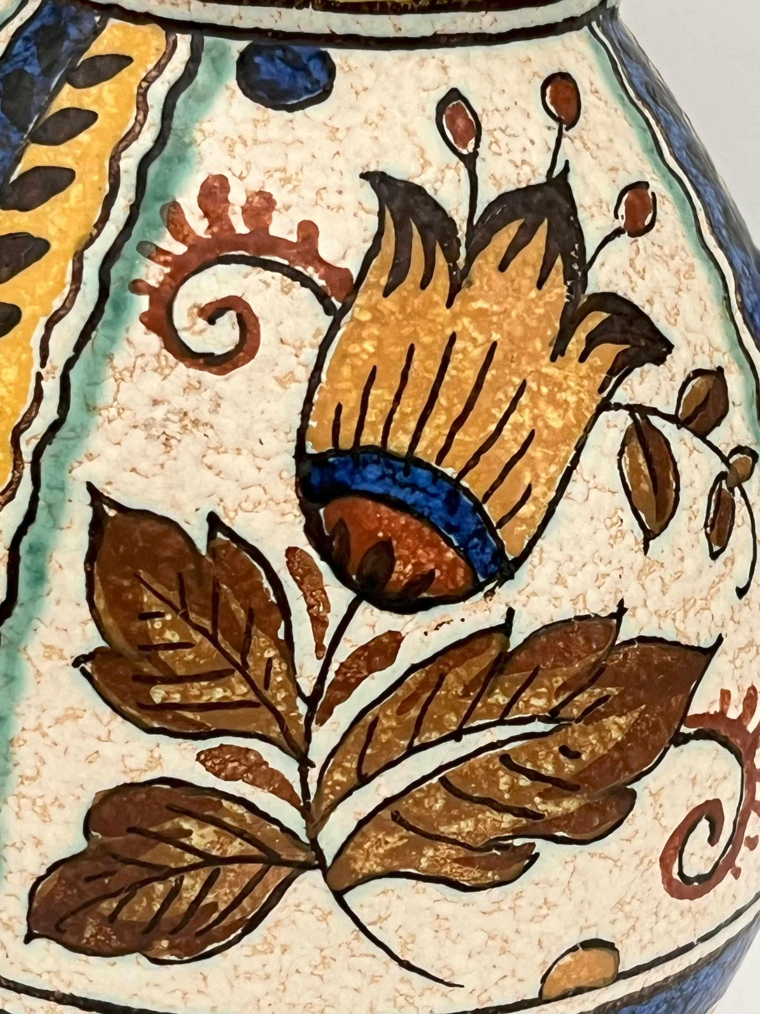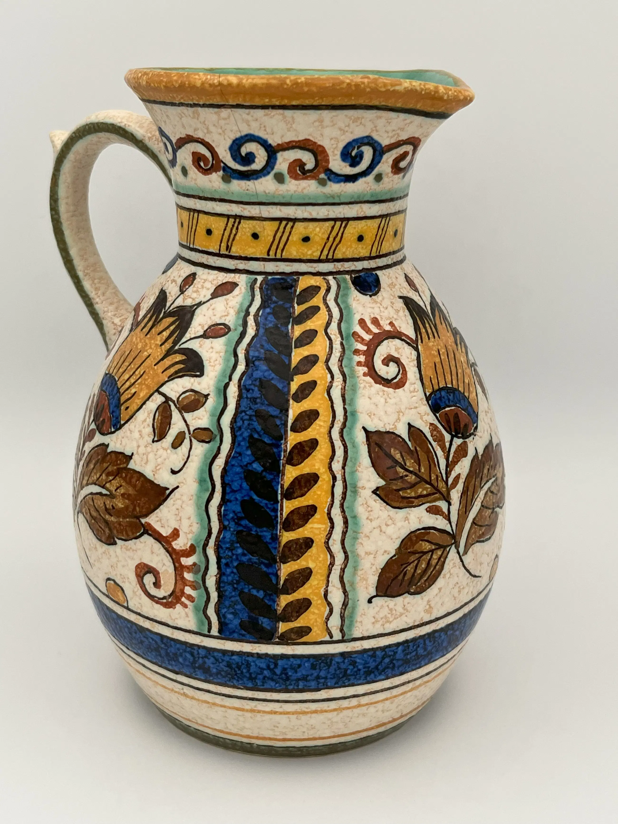 Dit nieuwe matte glazuur werd voor het eerst getoond in 1910 op de Leipziger Messe en vervolgens in 1915 op de World's Fair in San Francisco, VS. Het bleek een groot succes en er werden tot de sluiting van de pottenbakkerij in 1968 producten met matte glazuur gemaakt. Hier wordt een grote kan in matte glazuur aangeboden in het ontwerp ‘JOMA’, met levendige blauwe accenten en prachtige herfstkleuren van geel, rood, groen,bruin en ivoor. De binnenkant van de kan is levendig turkoois. Er zit een kleine chip aan de bovenkant van de rand van de mond, met een haarscheurtje van ongeveer 4,8 cm. (Foto 10 collage)