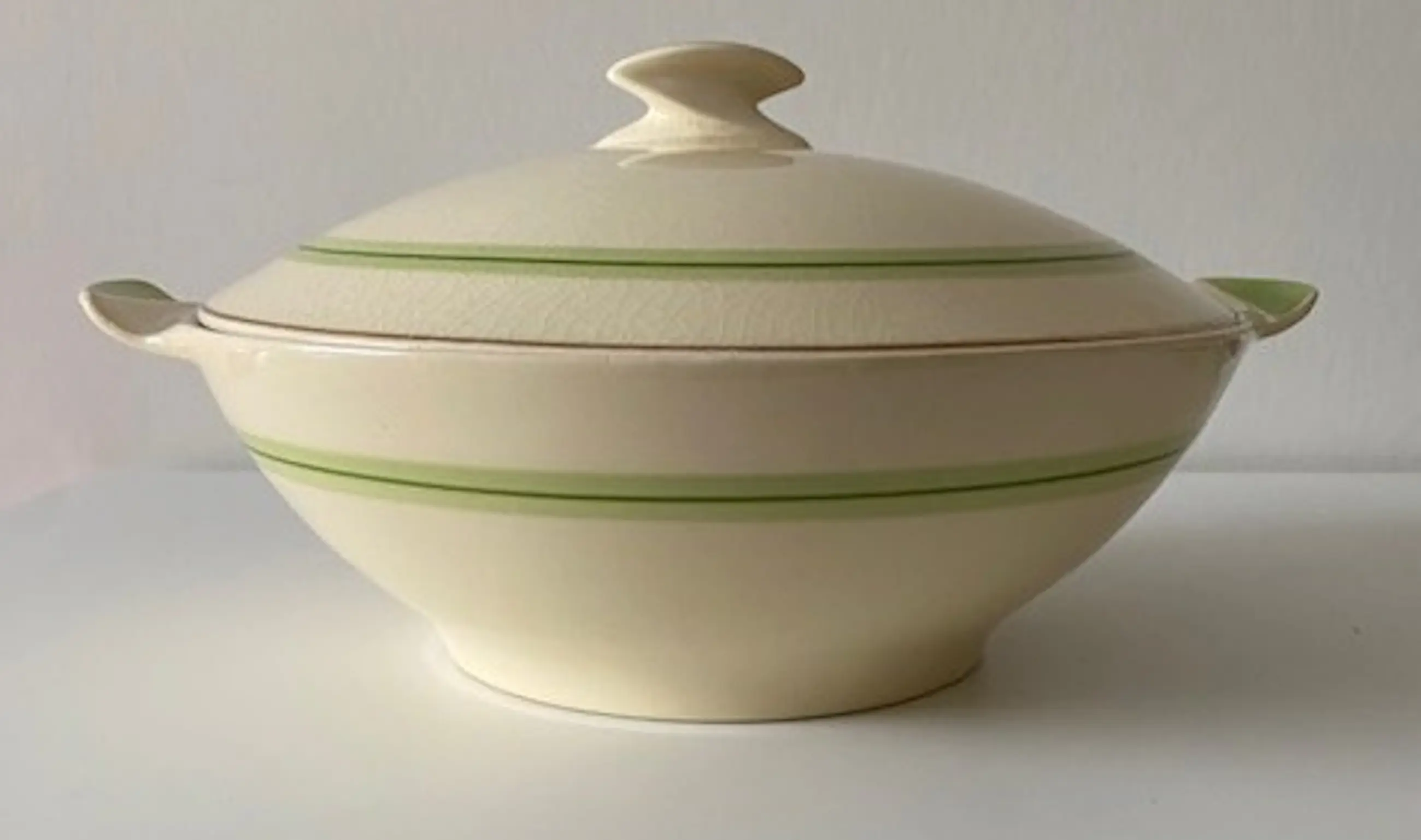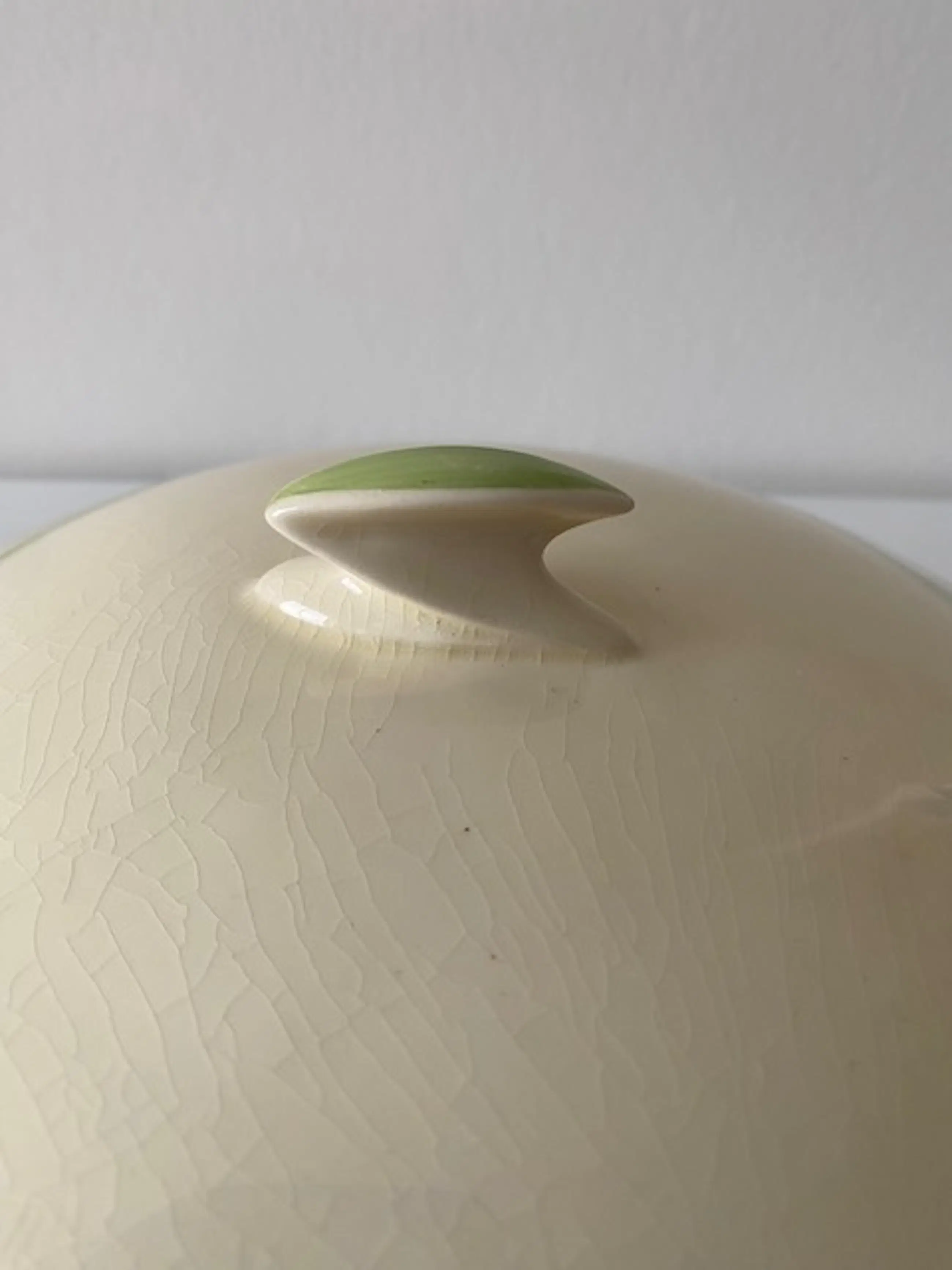 Deksel kleuren groen/goud, handgrepen schaal groen / schaal groene band.