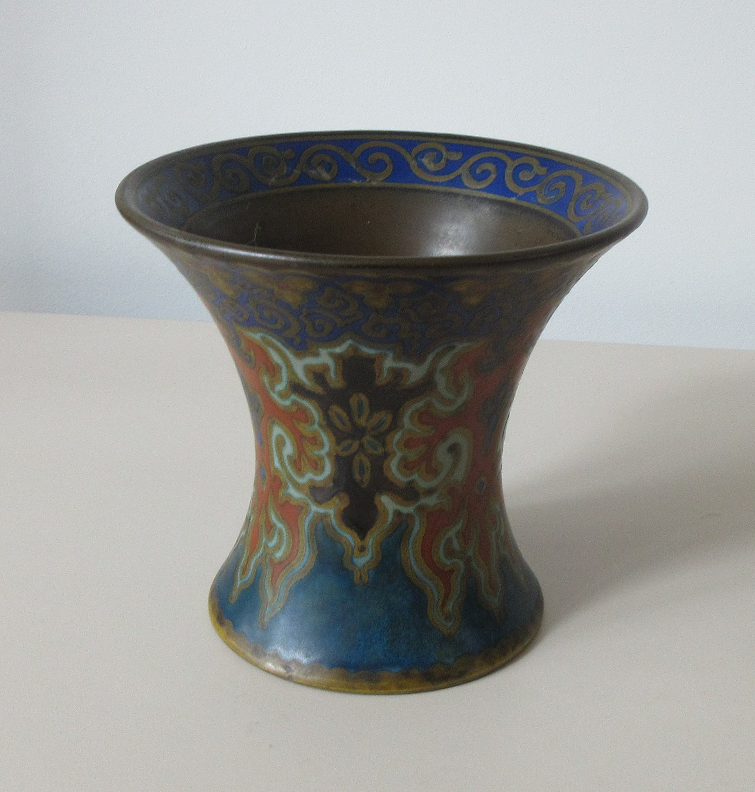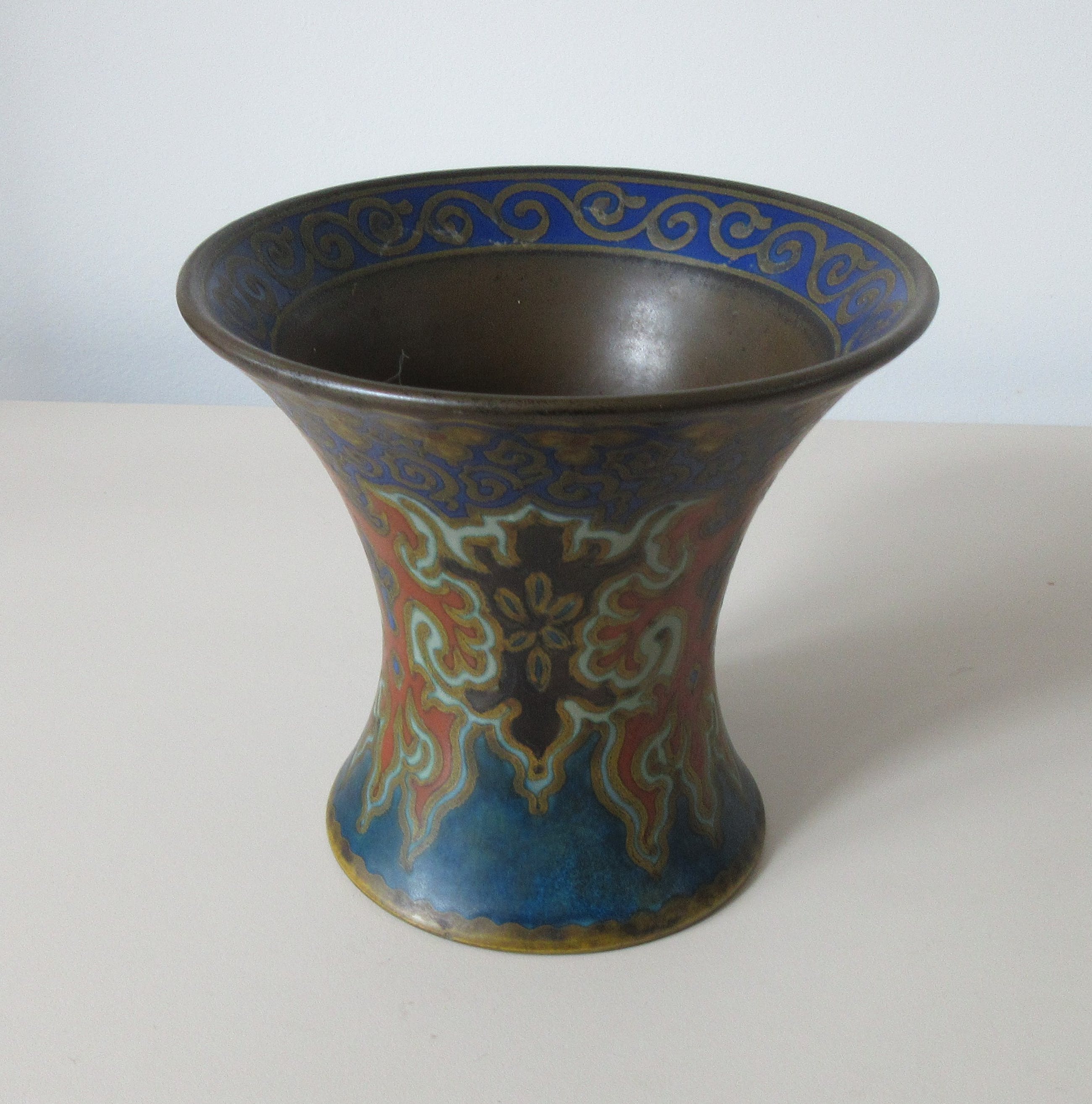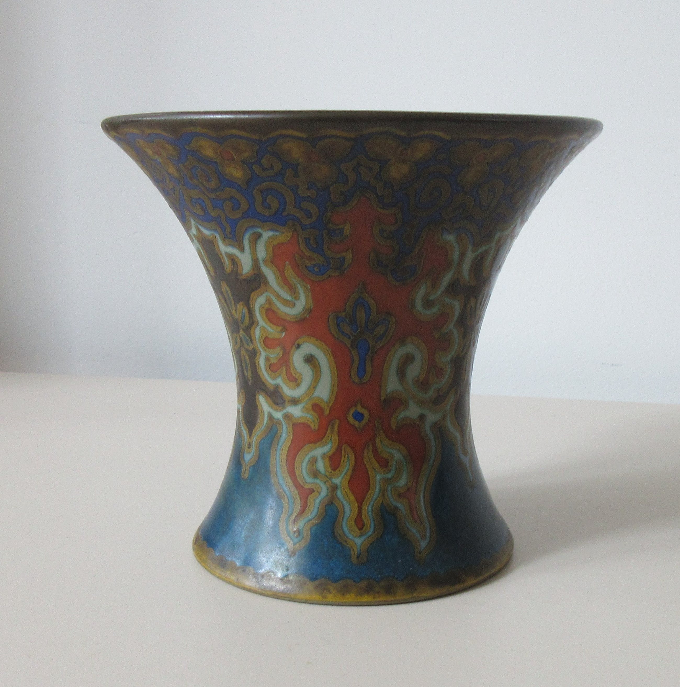 Mat platelen vaasje decor M109 van plateelbakkerij Zuid Holland. in perfecte conditie en gemerkt aan de onderzijde.