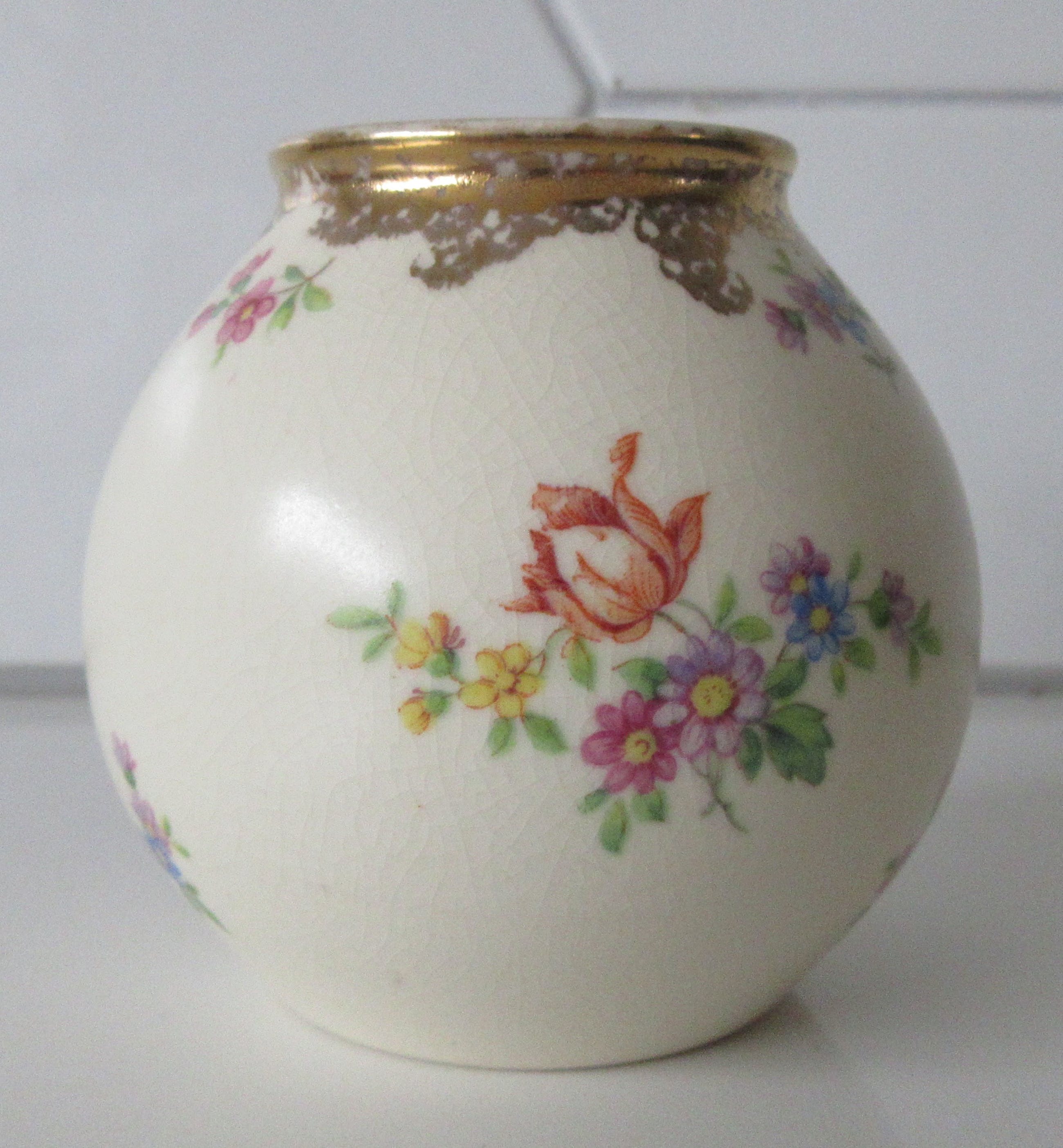 Miniatuur platelen bolvaasje met floraal decor van Plateelbakkerij Zuid Holland uit Gouda. Gemerkt op de bodem.