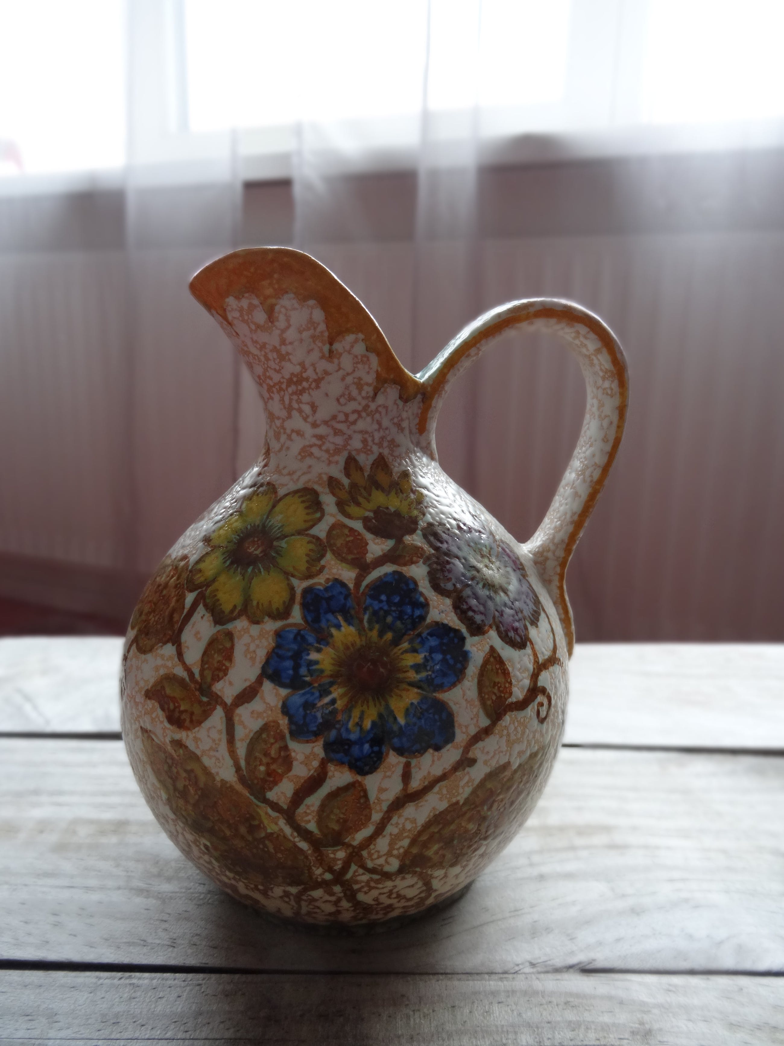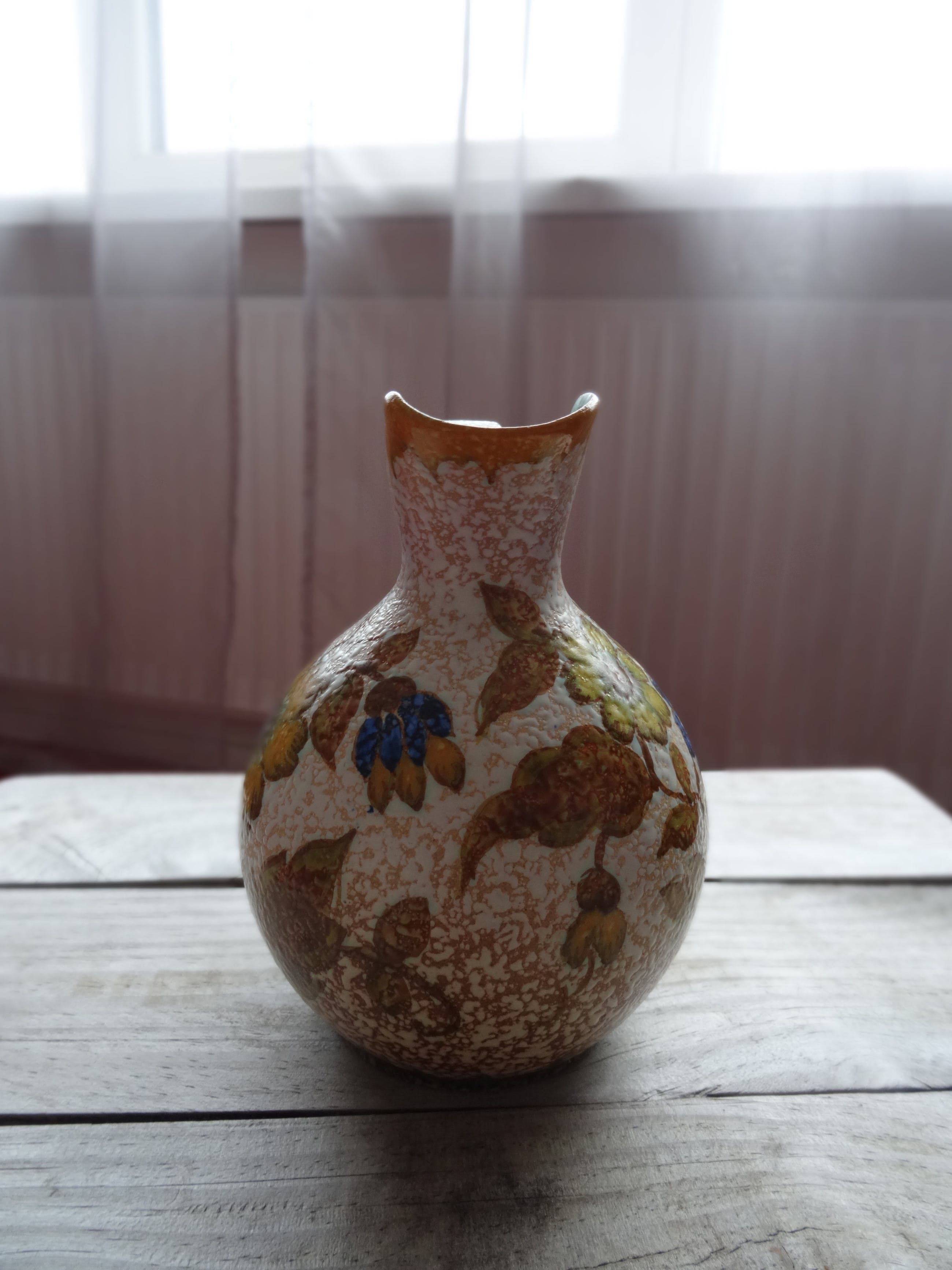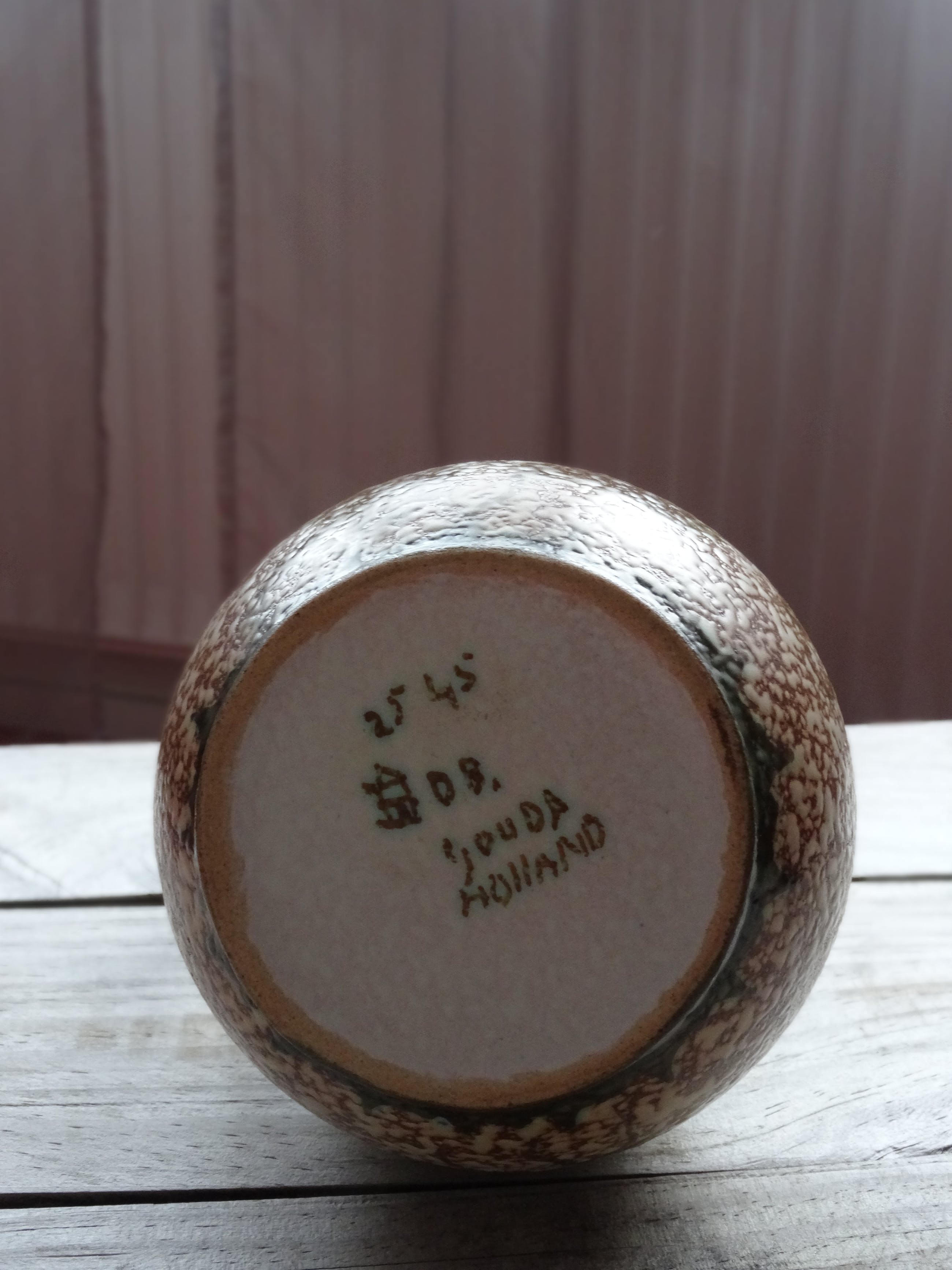 Een mooi vaasje in ongeschonden staat, zonder breuk of chips. Het vaasje heeft een reliëf. De opening is 3 cm. De buik rond is 38 cm. Zie foto's voor een indicatie