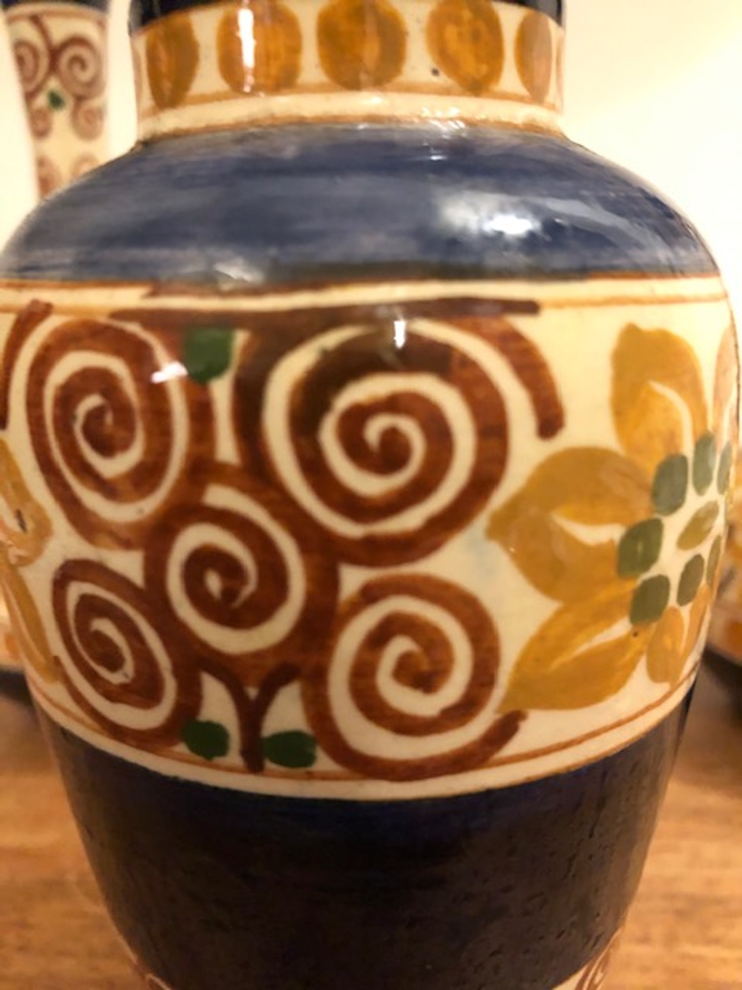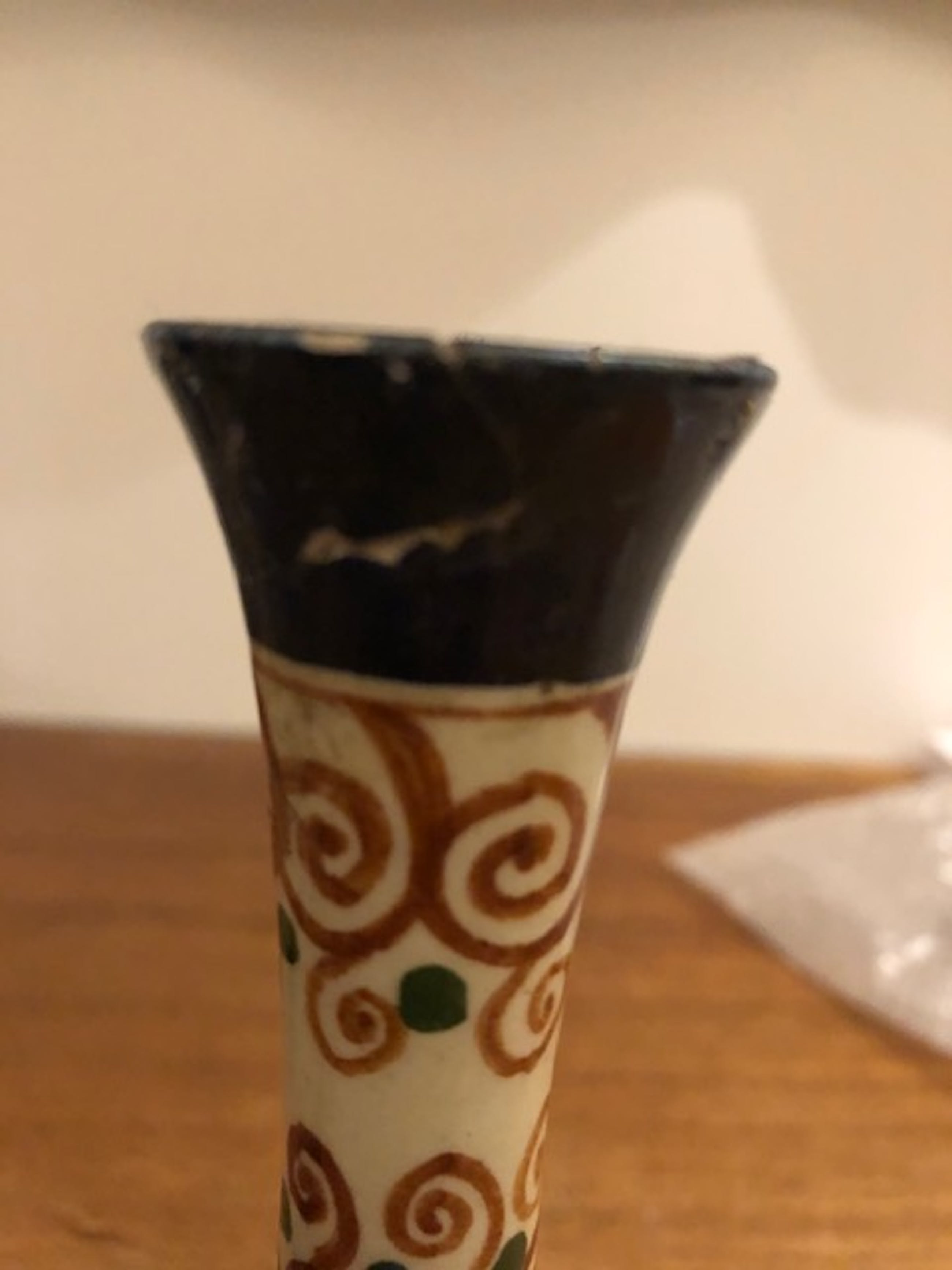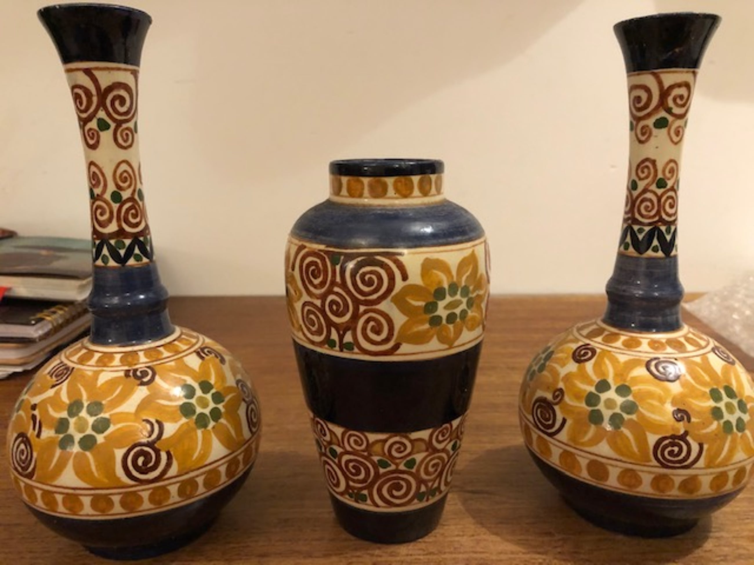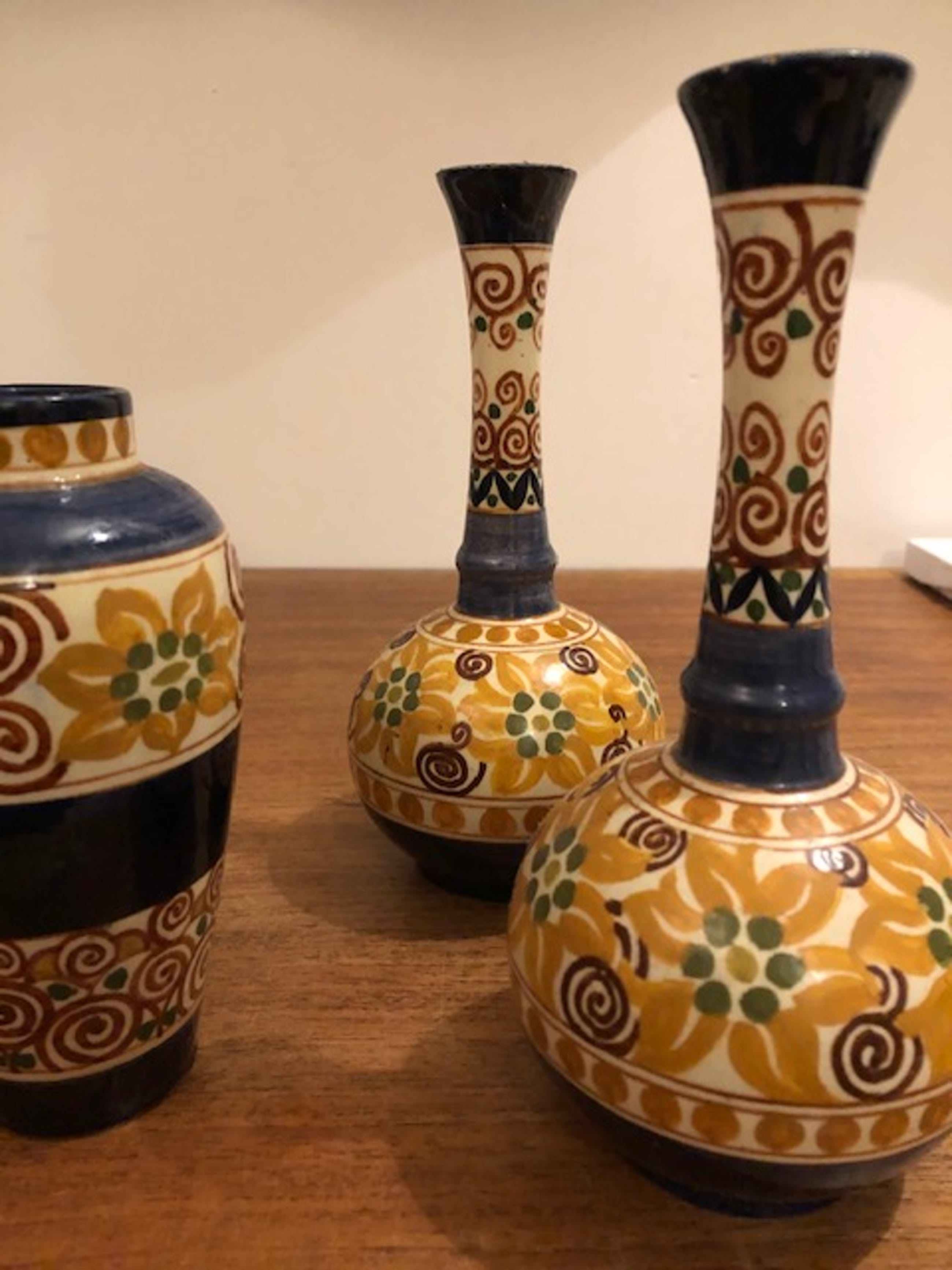 3 unieke vaasjes van de Rozeboom (Den Haag)Het zijn bijzondere vaasjes. 1 vaasje heeft een lichte beschadiging (zie laatste foto), verder zo goed als nieuw. Ze hebben versieringen met een mooie kleurtoon. Te mooi om separaat te verkopen. Doordat de bakkerij maar kort heeft bestaan zijn producten van de Rozeboom erg zeldzaam.