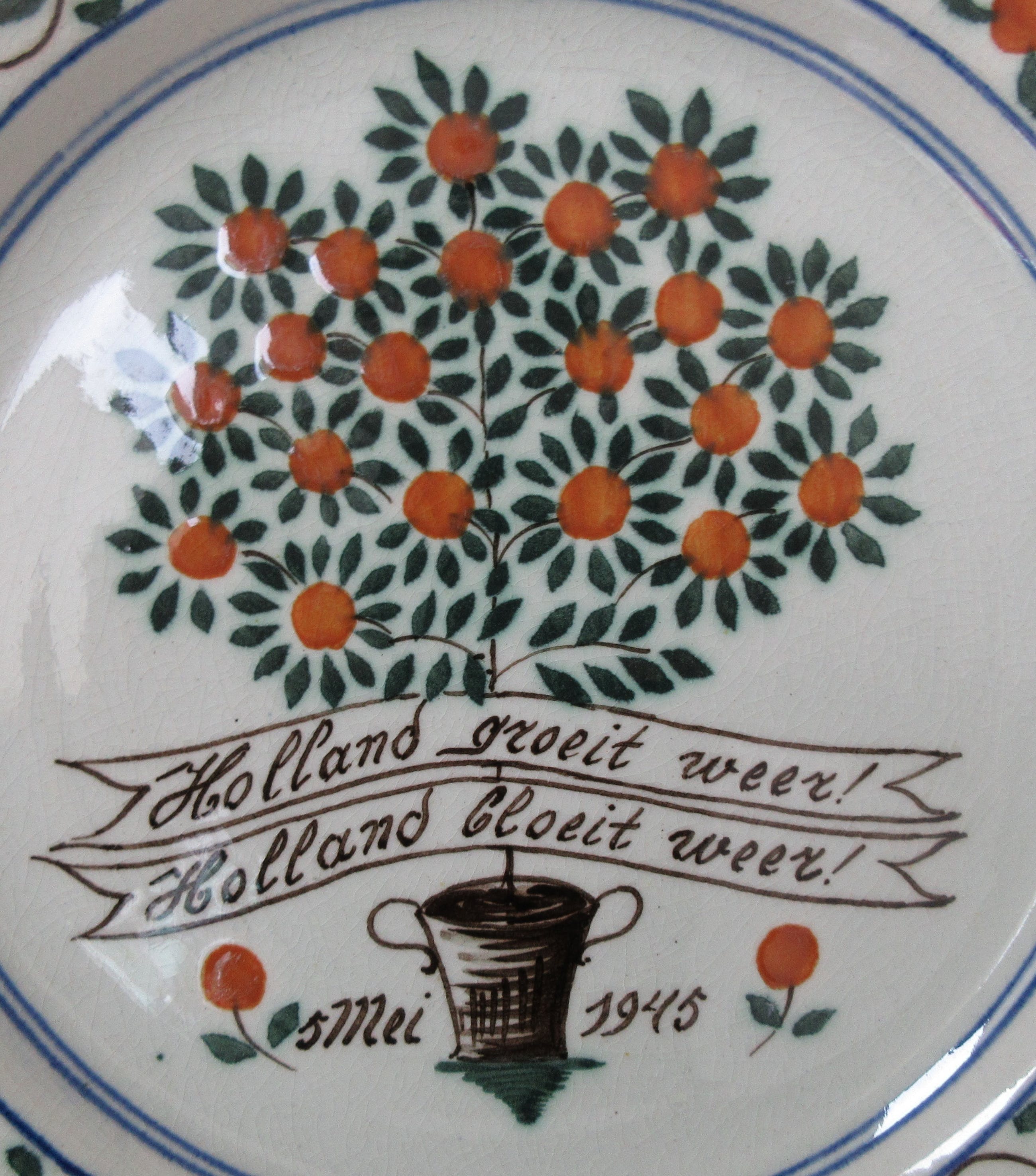 Platelen bevrijdingsbord "Holland groeit weer!" "Holland bloeit weer!" gemaakt bij plateelbakkerij Zuid Holland in Gouda. Hand gedecoreerd decor van "Appeltjes van Oranje" en in het midden een sinaasappelboom in een pot. Aan de achterzijde met de hand voorzien van blindmerk.