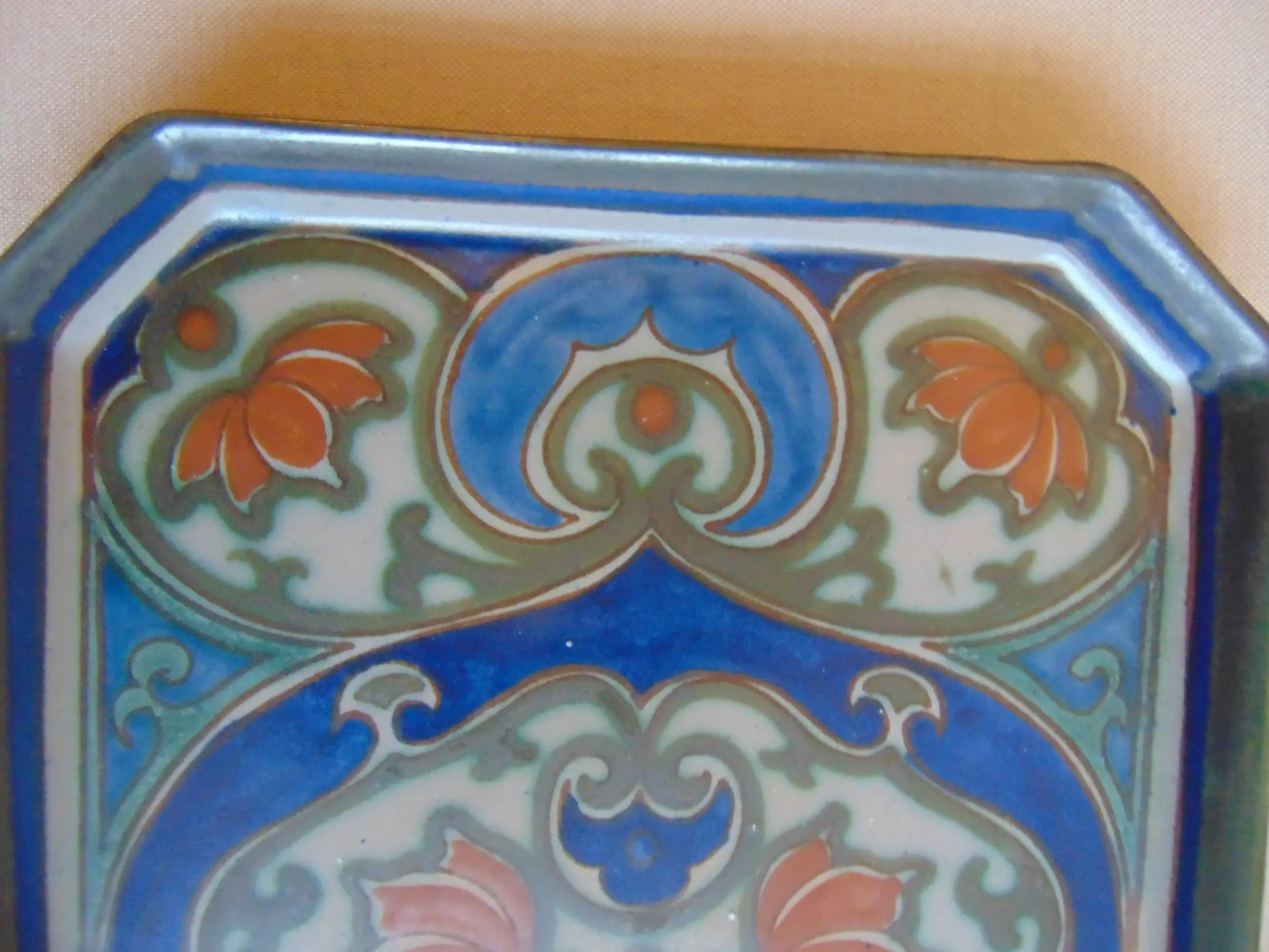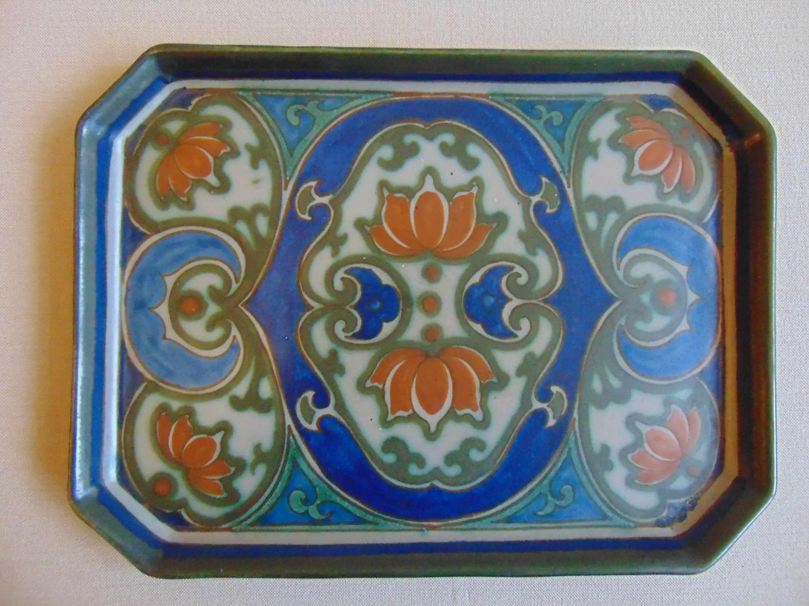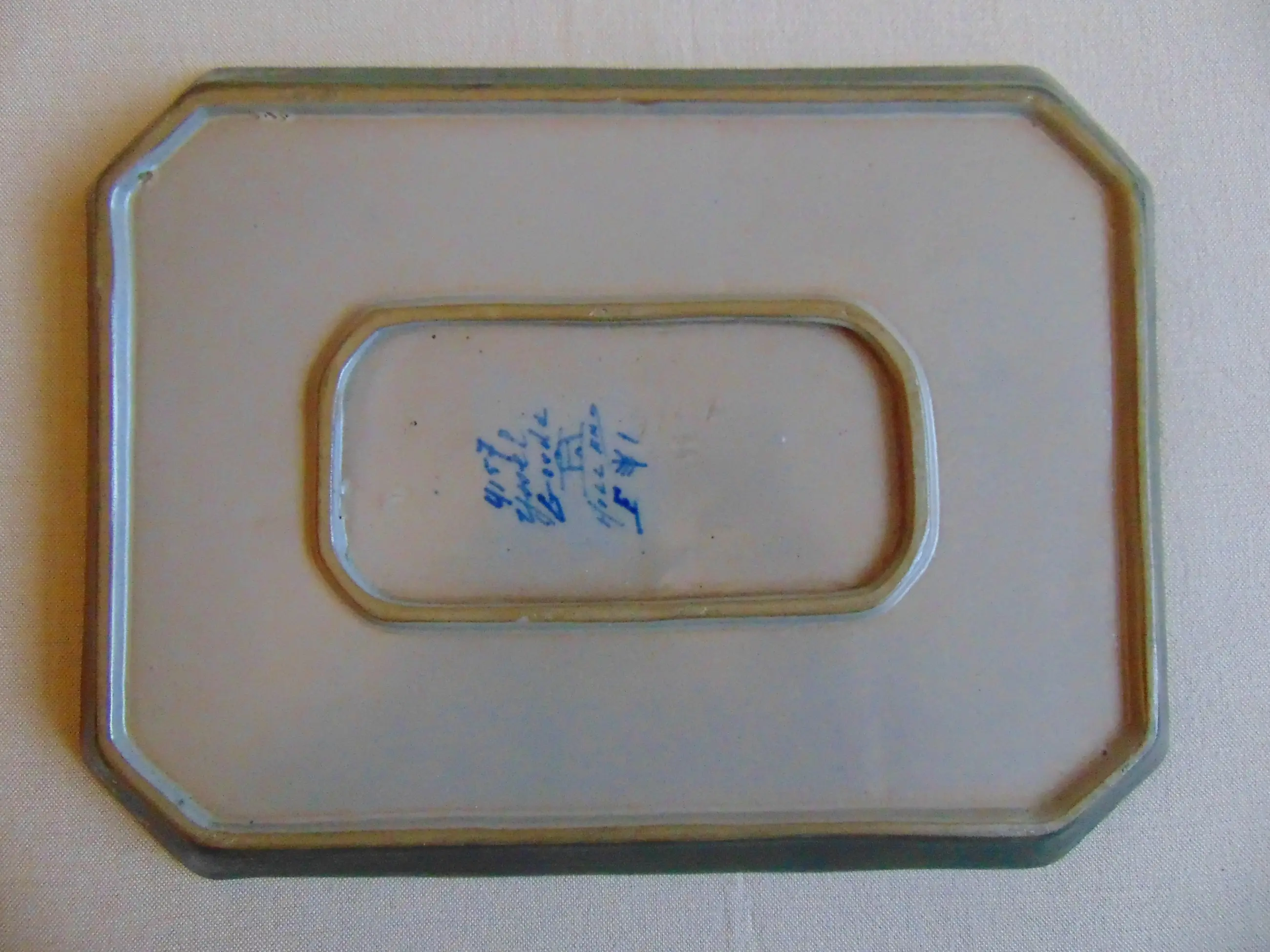 Deze rechthoekige schaal is aan de onderzijde gesigneerd (zie foto).