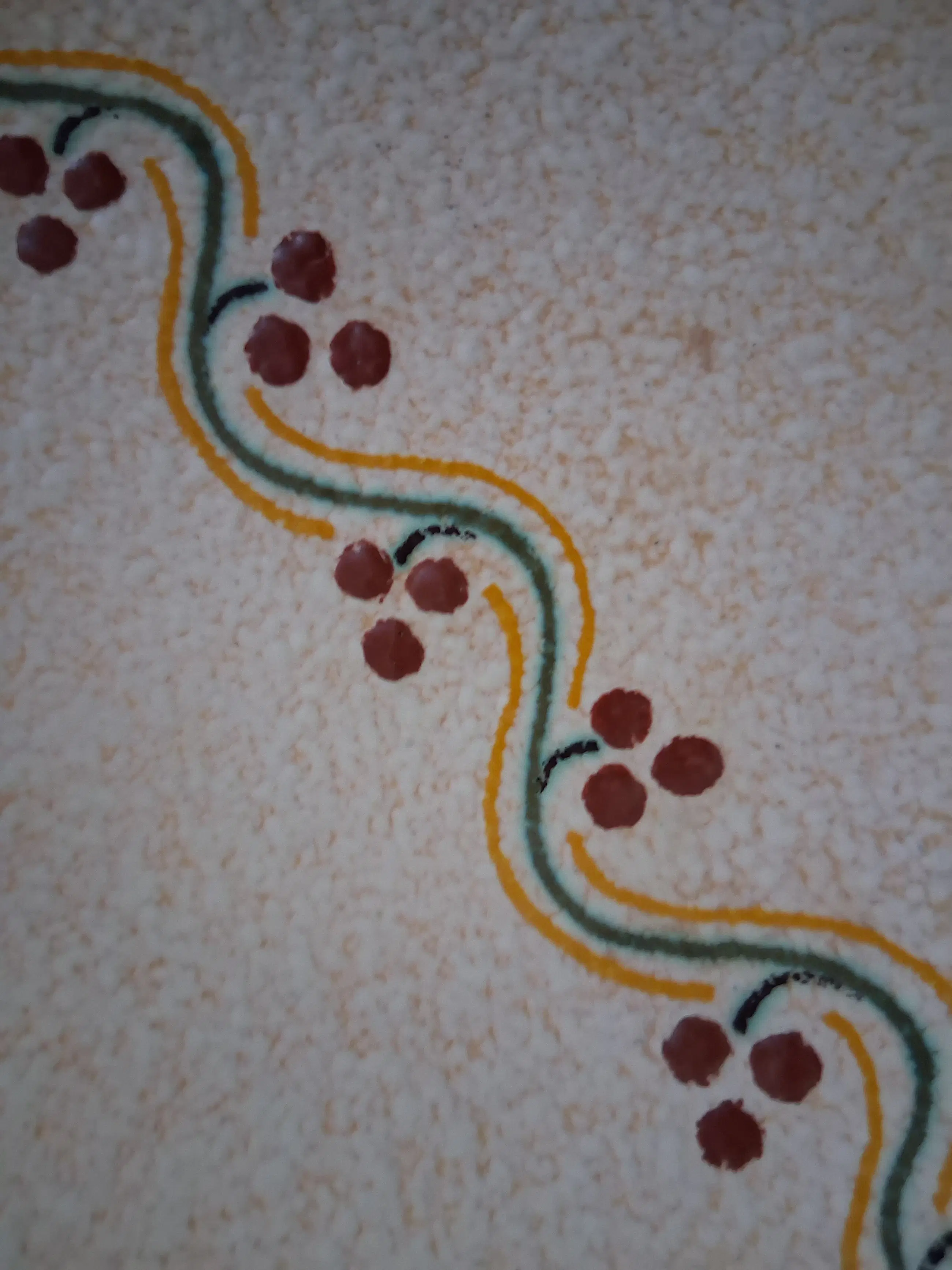 Het decor ‘Royal D’ wordt gekenmerkt door een speels golvend lijnenspel in mosterdgeel en groen, met daarlangs rode besachtige accenten. De rand is subtiel gemarkeerd met een afwisselend patroon. De glazuurtechniek en de expressieve vorm van de oren geven dit stuk een elegante maar ook eigenzinnige uitstraling.