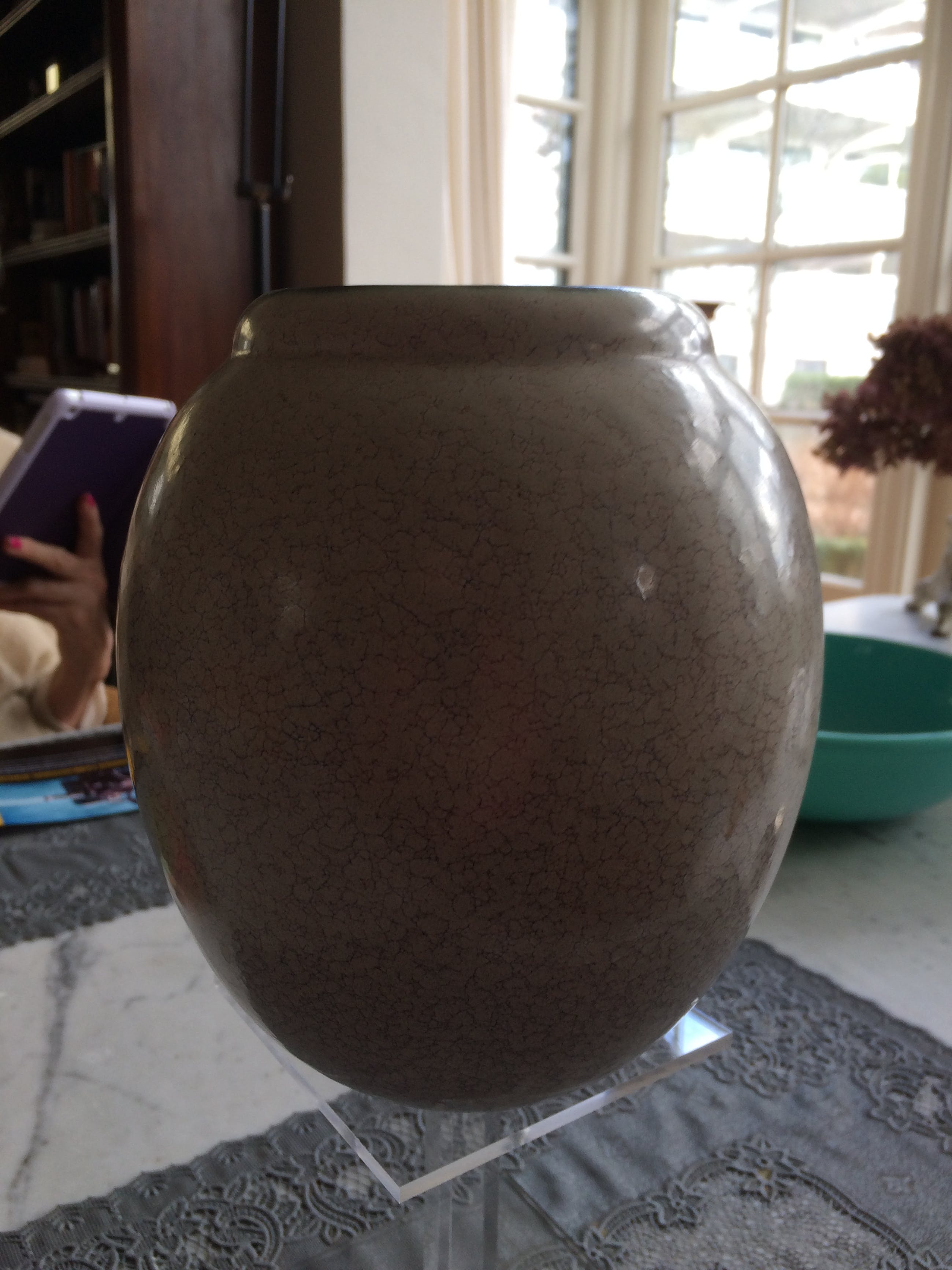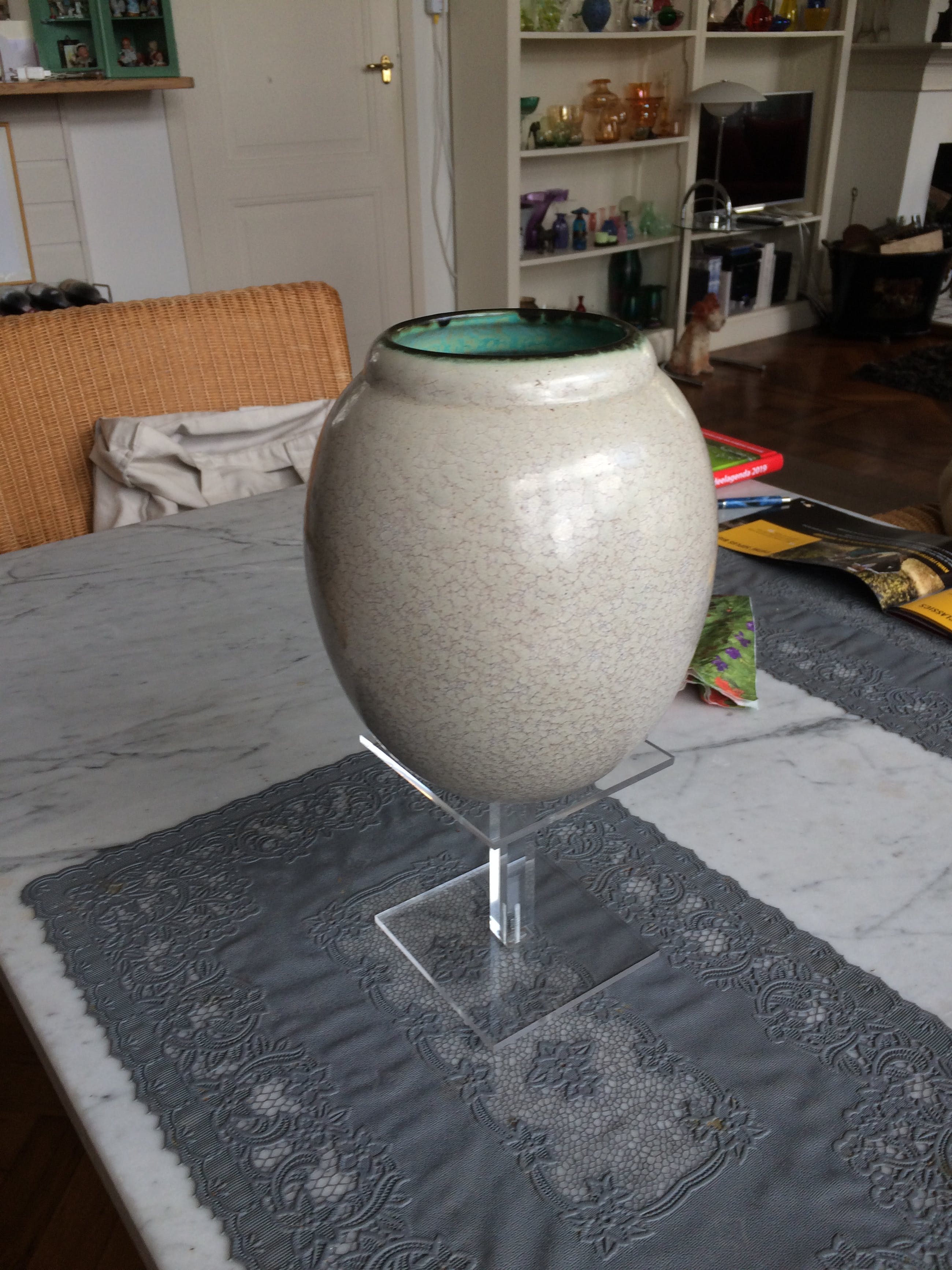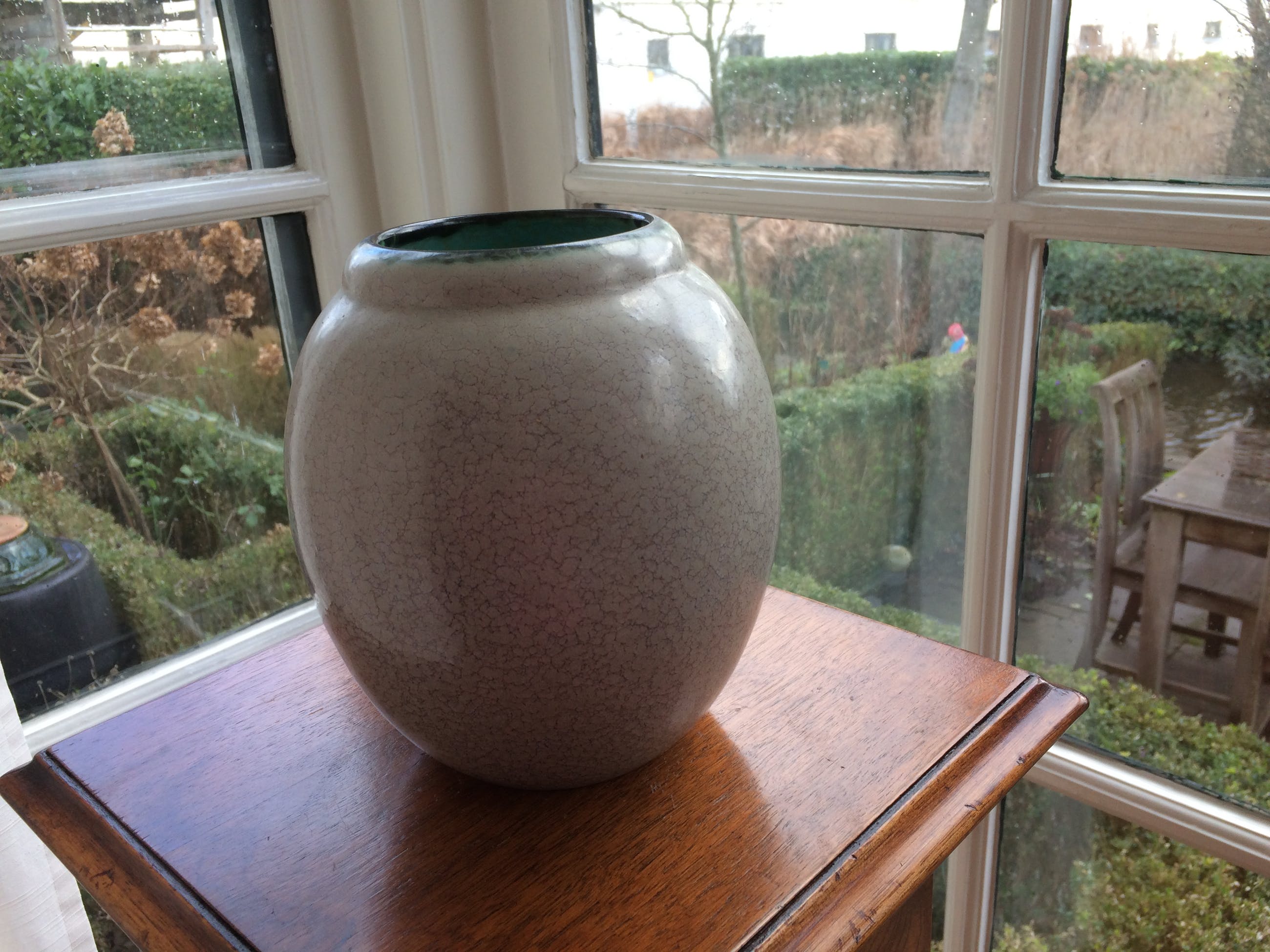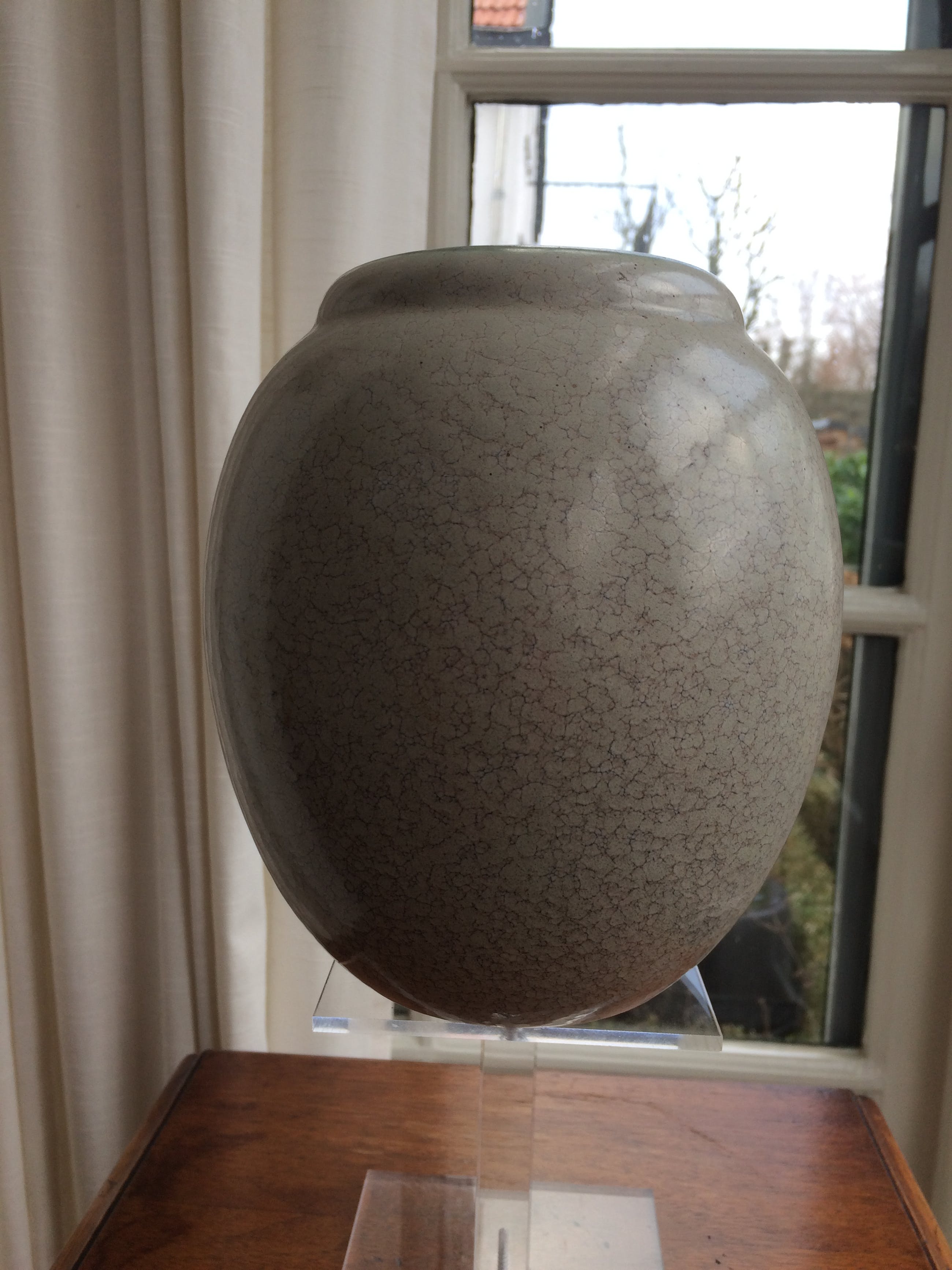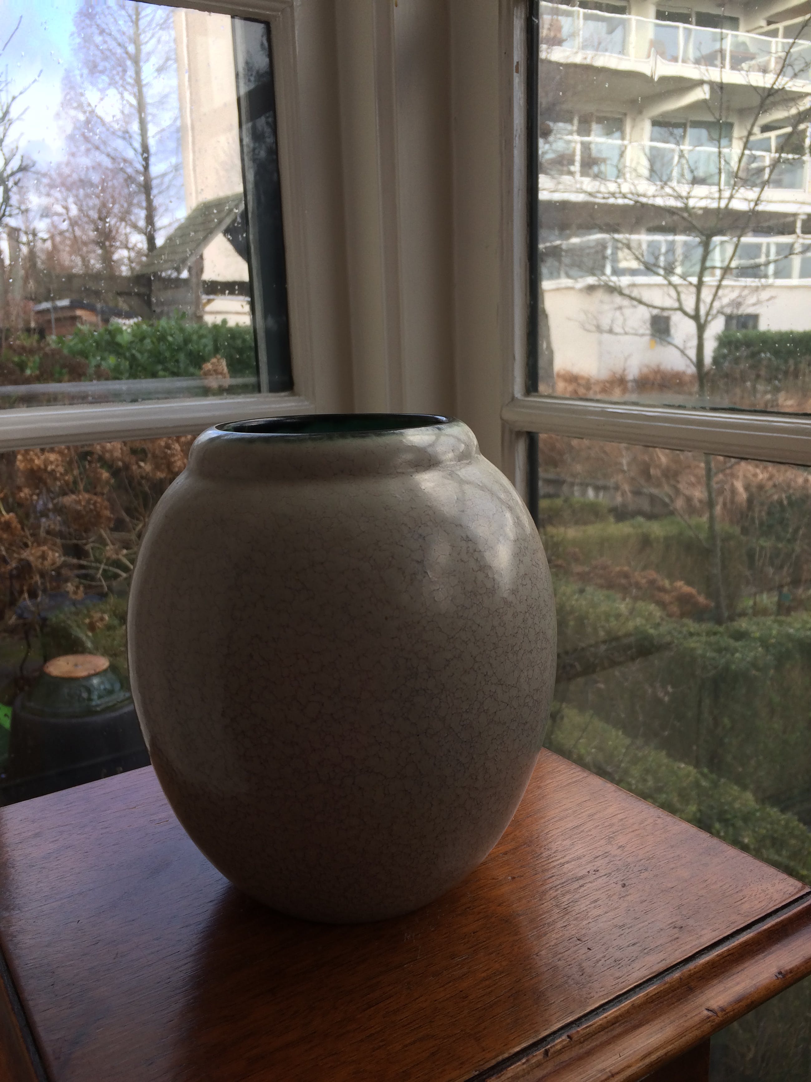 Plateel vaas van PlateelfabriekZuid-Holland uit de jaren 20/40.Deze Goudse plateel vaas heeft een zeer bijzonder blauw- dooraderd grijsgroen glazuur dat de tand des tijds perfect heel doorstaan.De vaas is in tip-top conditie .Maten: hoog 18 cm; grootste diameter 16 cm en diameter bloem-opening 8 cm. LET OP : LOOPT over twee dagen AF !! )