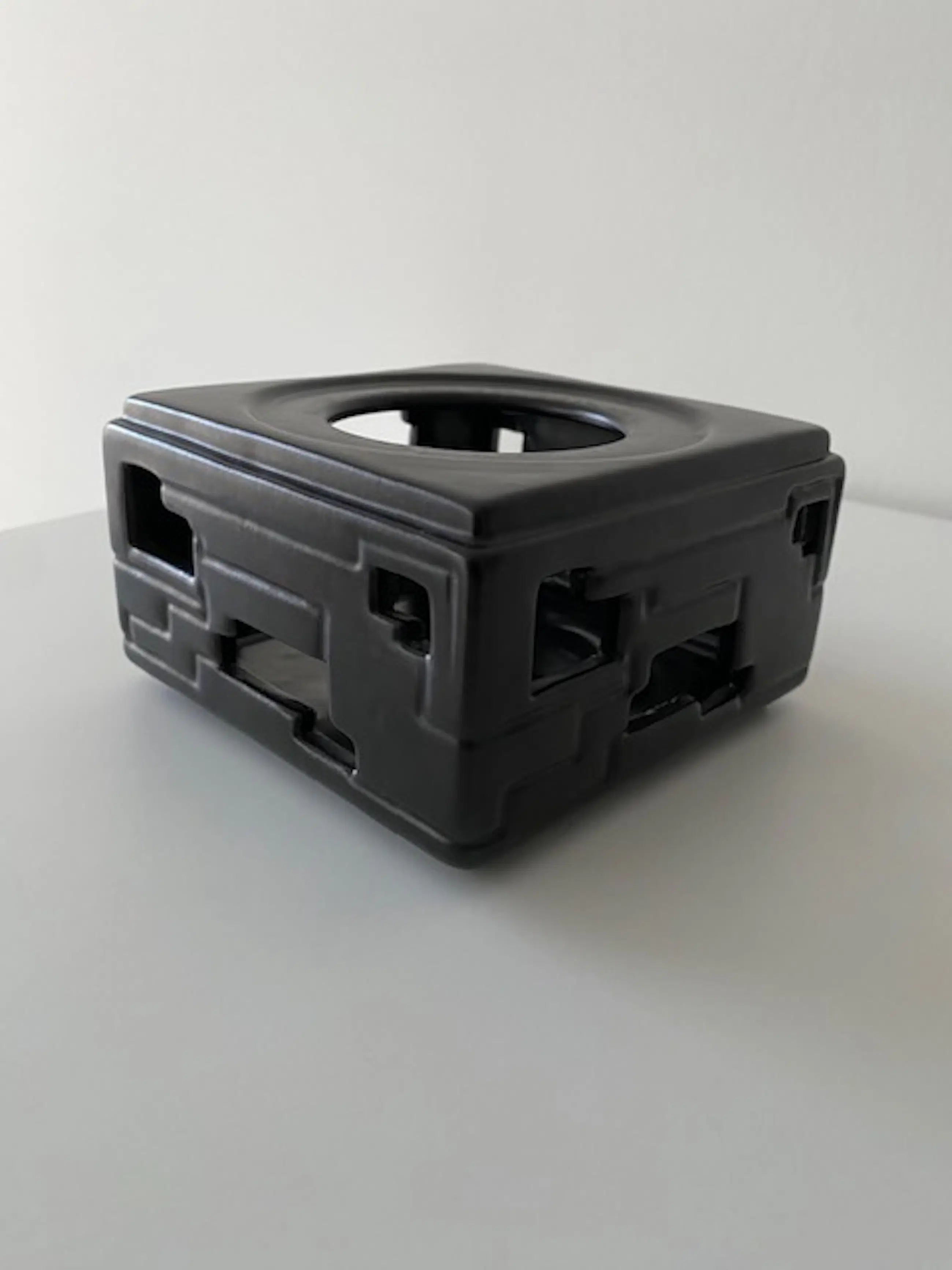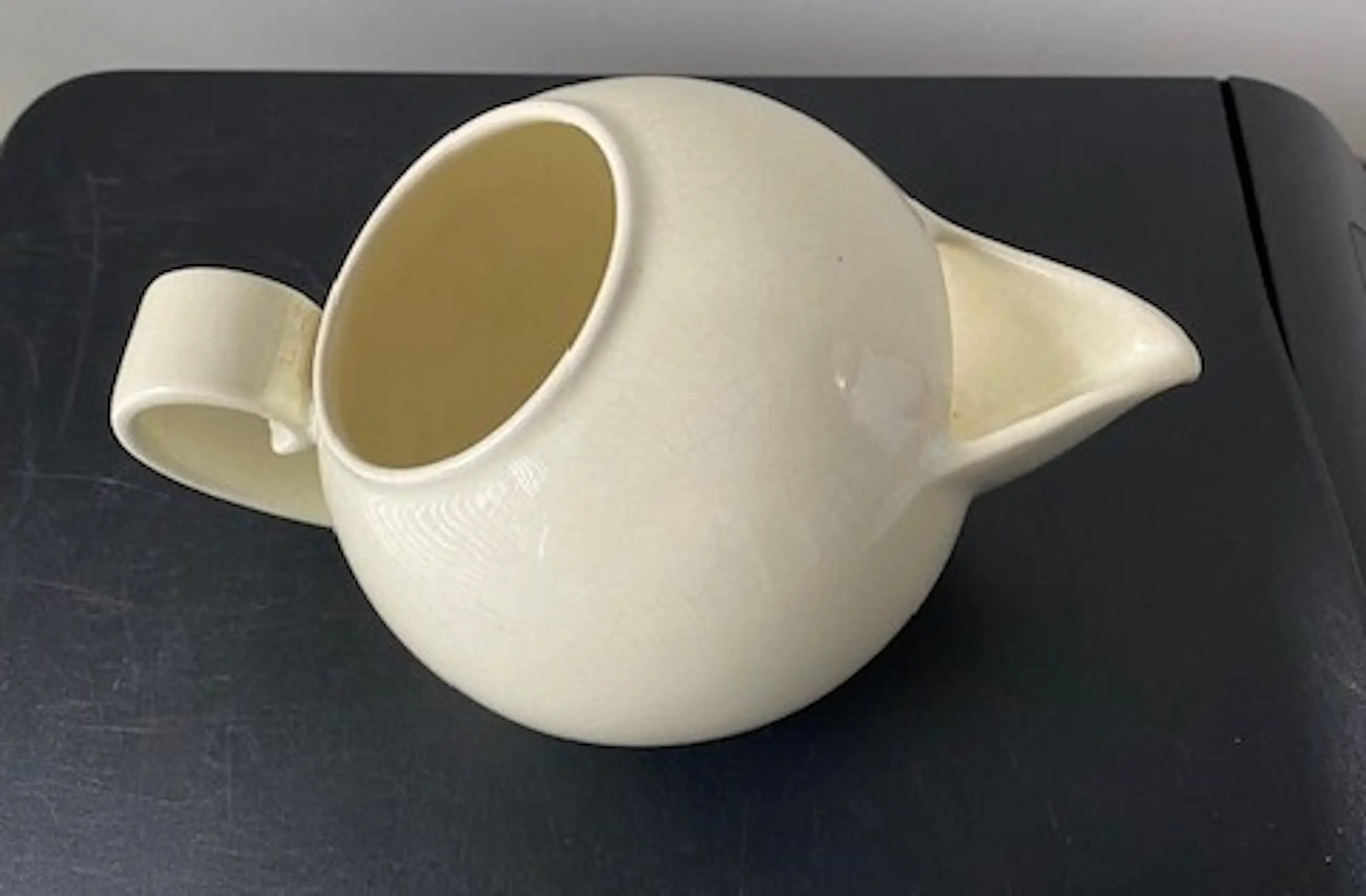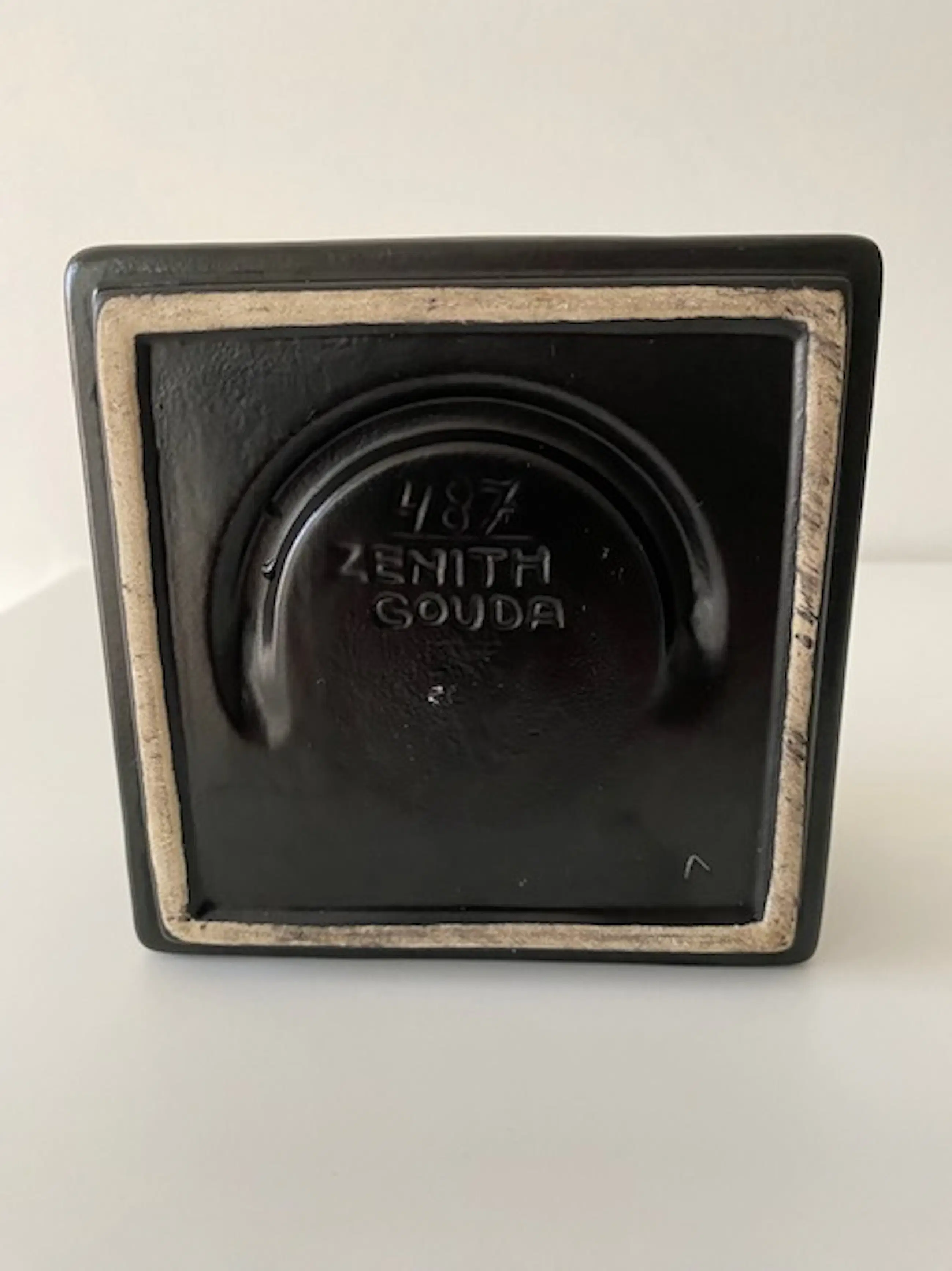 1. Zeldzaam melkkannetje "Cartoon" Ontwerp Leen Muller. Zie verhandeling op serviezendomein.nl over vernieuwing PZH (vorm oor). Gemerkt/ cremekleurig . Waarschijnlijk hoort een deksel op het melkkannetje (?) 2. Zeldzaam mooie Art Deco comfort / theelichthouder model 487 / zwart Ontwerp Willem Stuurman 1930's Uitvoering Zenith Gouda Gemerkt Zenith Gouda 487
