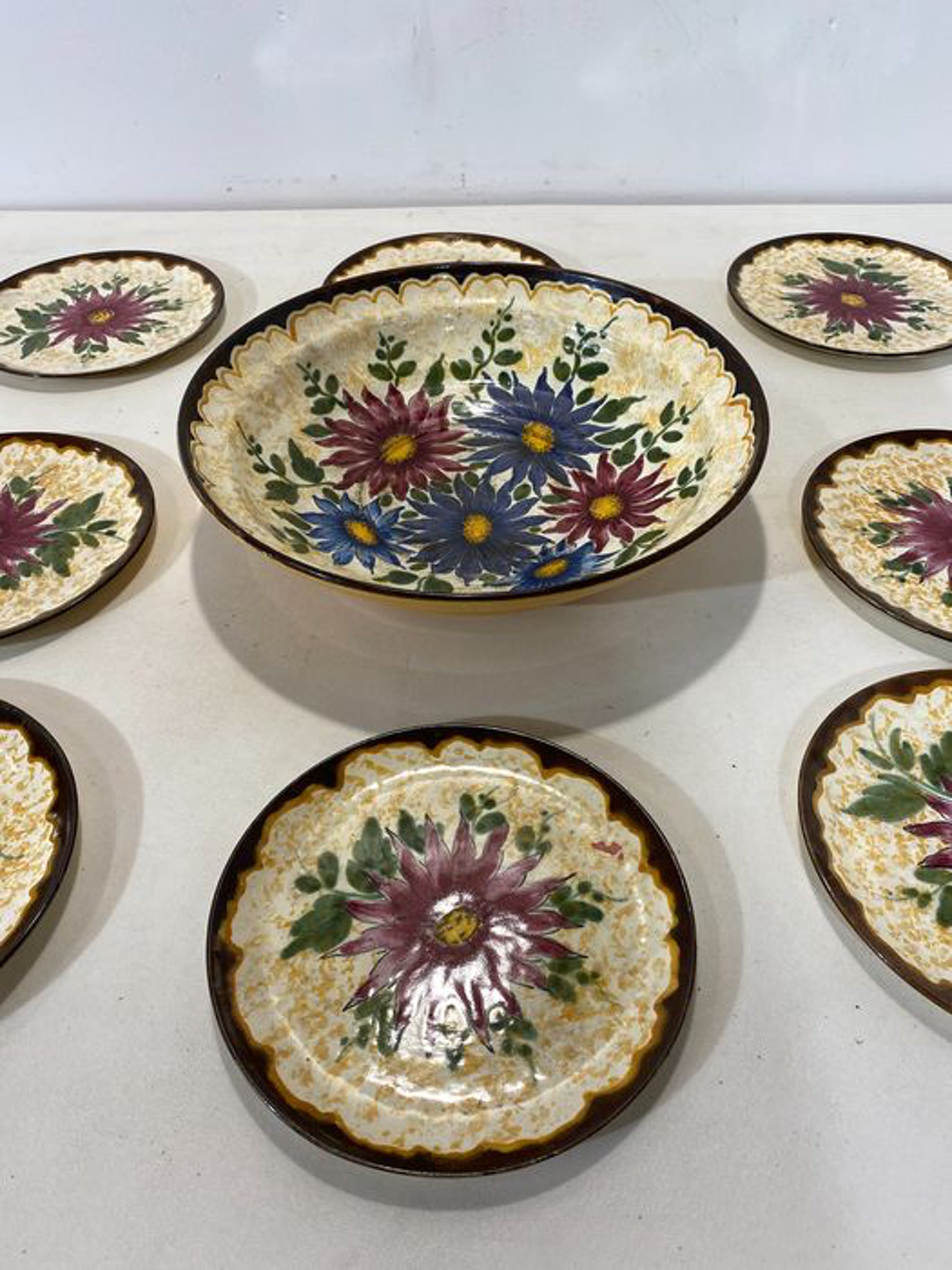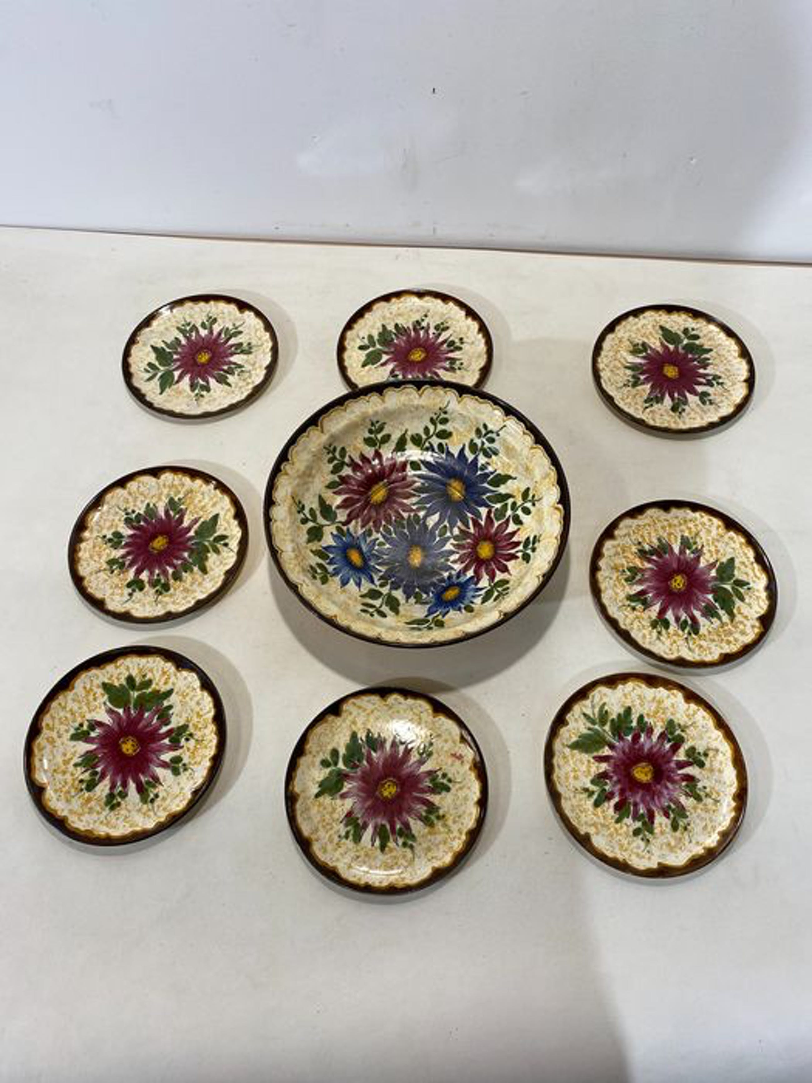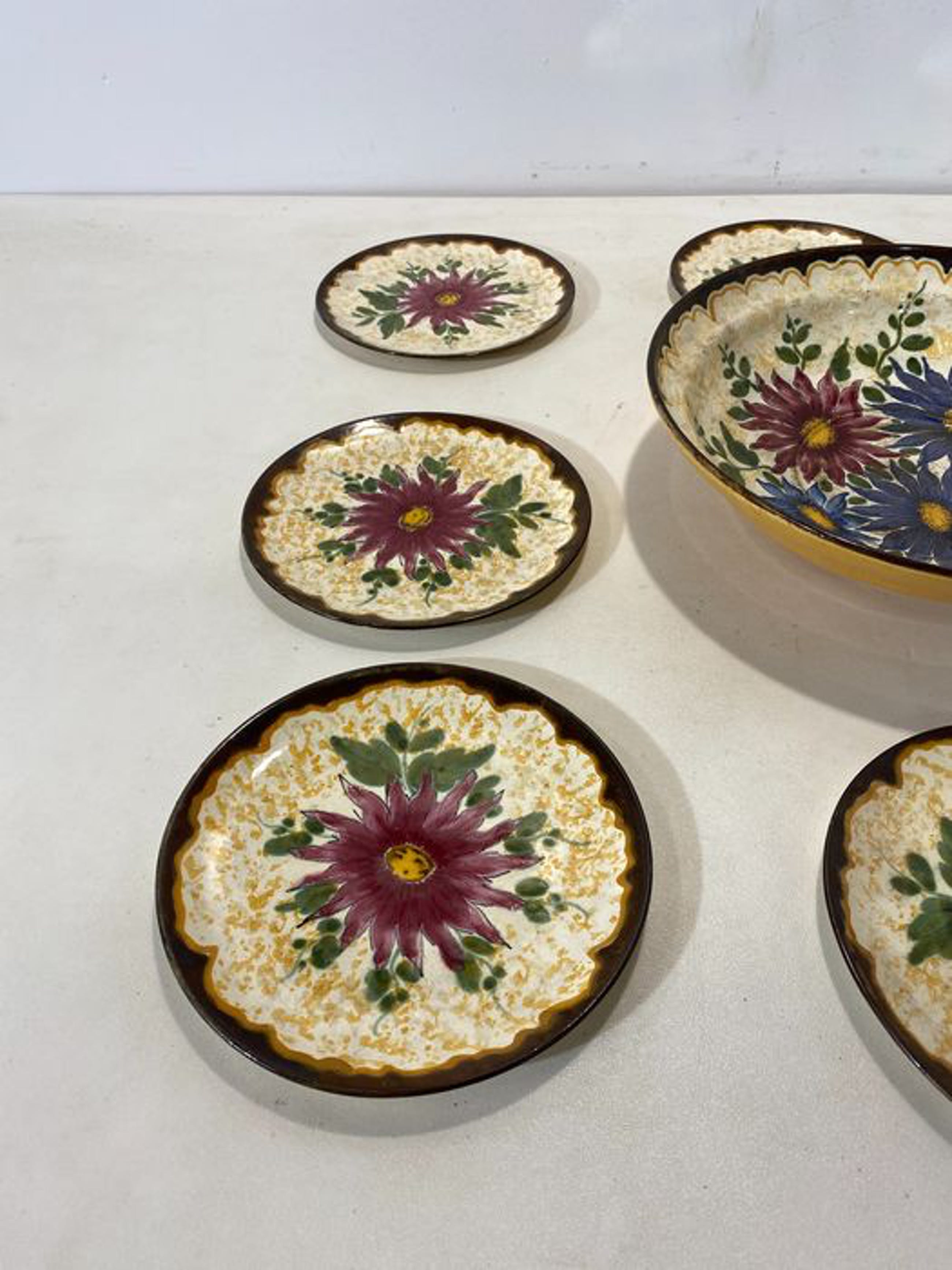 Aangeboden: Gouds plateel schaal met 8 kleinere bijbehorende bordjes Van de Zuid Hollandse Plateelbakkerij. Handbeschilderde borden.