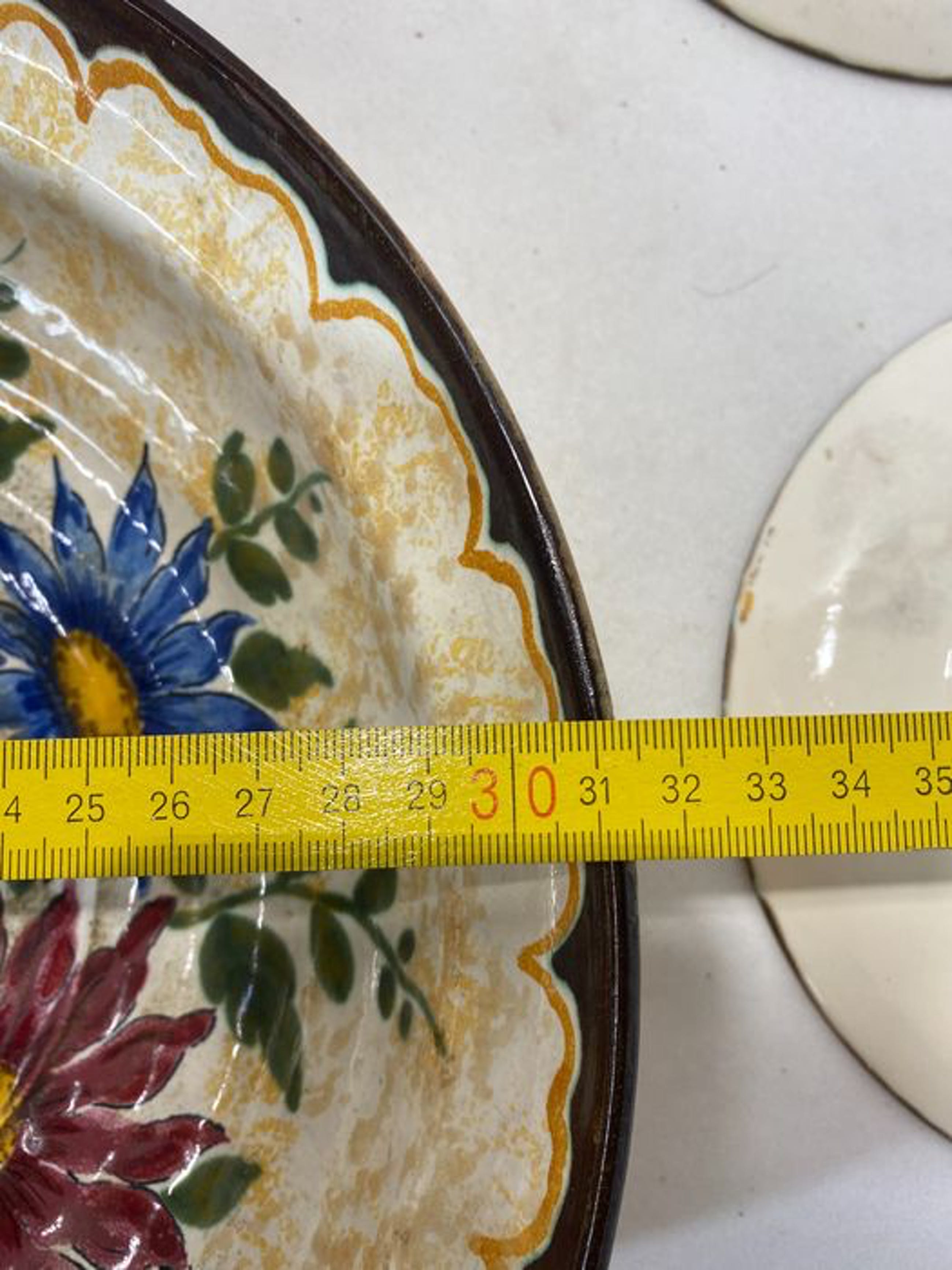 Afmetingen: grote schaal is 8 cm hoog en heeft een diameter van 31 cm, Kleine bordjes hebben een diameter van 19 cm.
