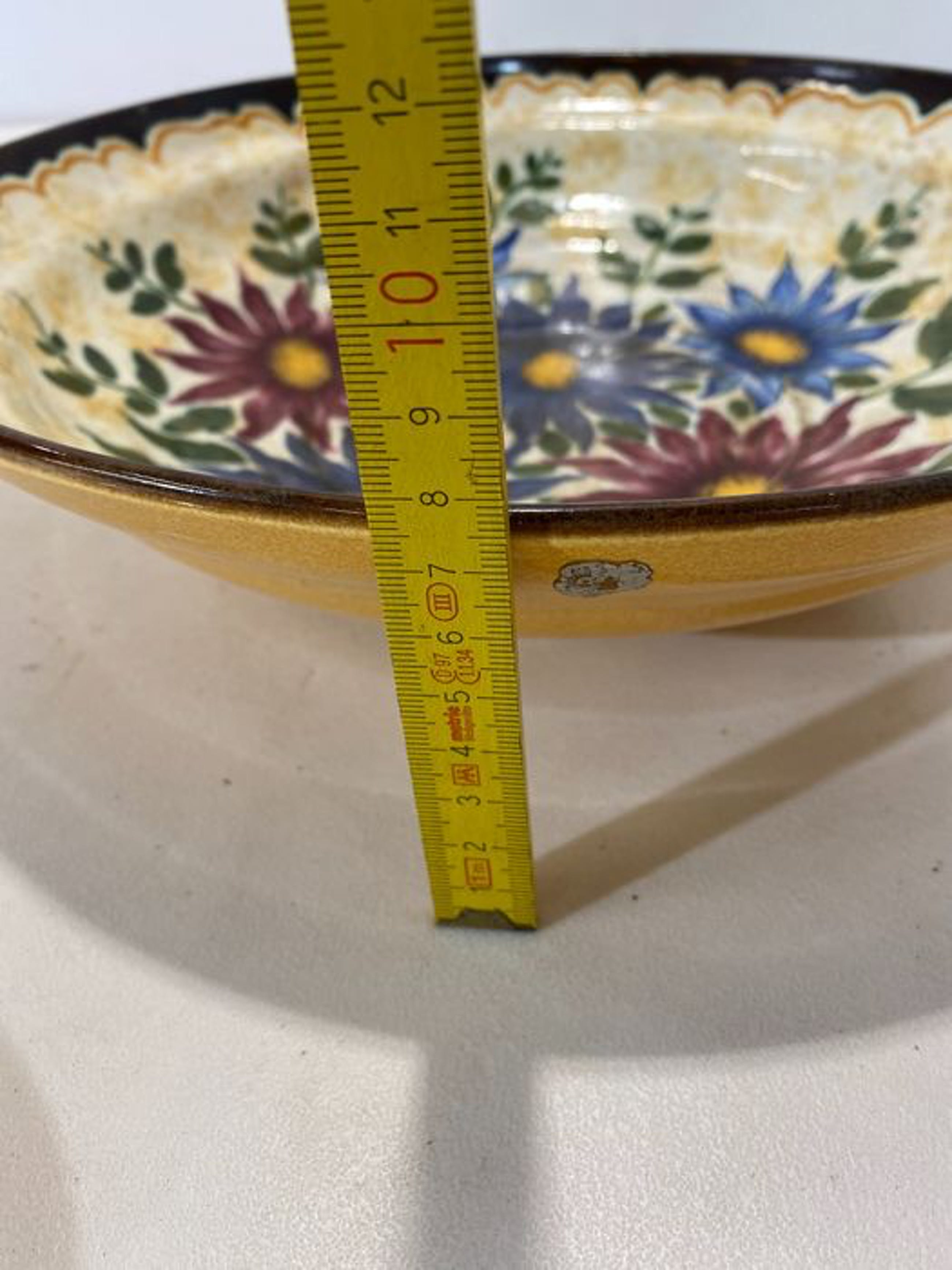 Het grote bord/schaal is versierd met bloemen.Aan de onderkant is de schaal geel en hij is genummerd met 6099.