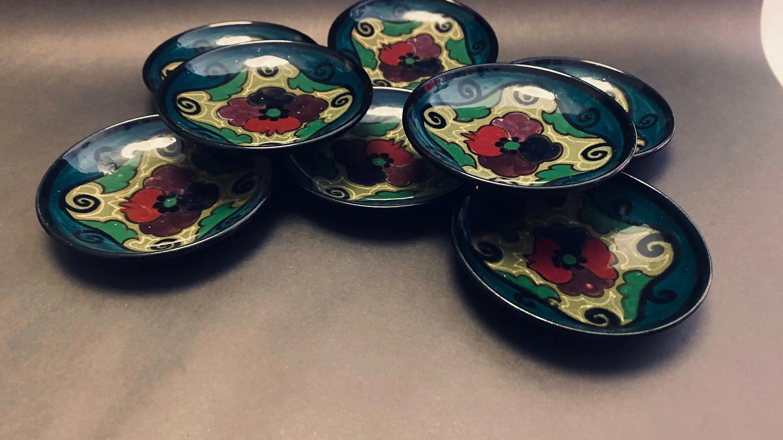 Het is zeldzaam om acht exact dezelfde schaaltjes van dezelfde schilder in één keer te vinden. De initialen 'AK' staan duidelijk op de onderzijde van elk schaaltje, wat de authenticiteit en de artistieke waarde garandeert.