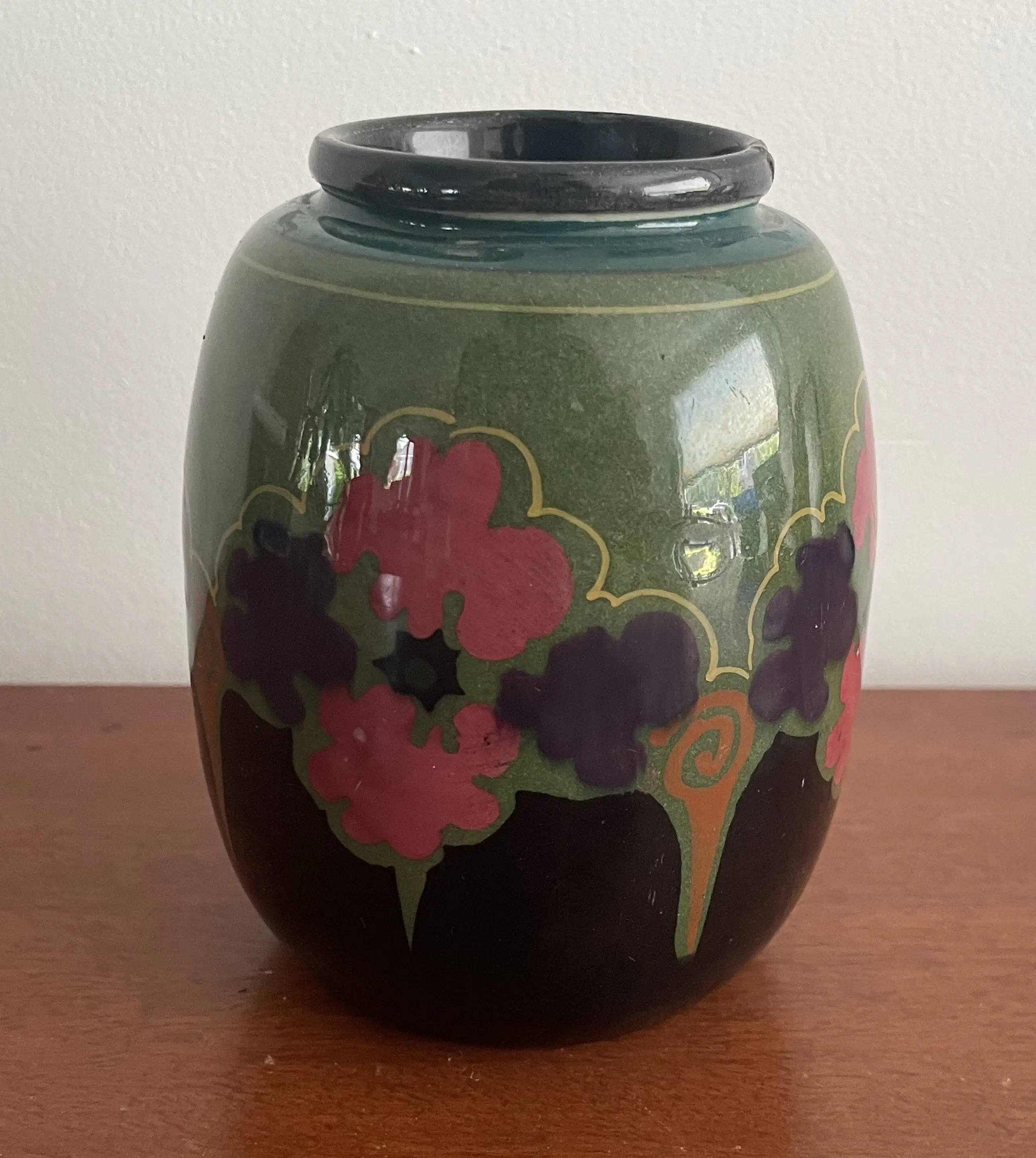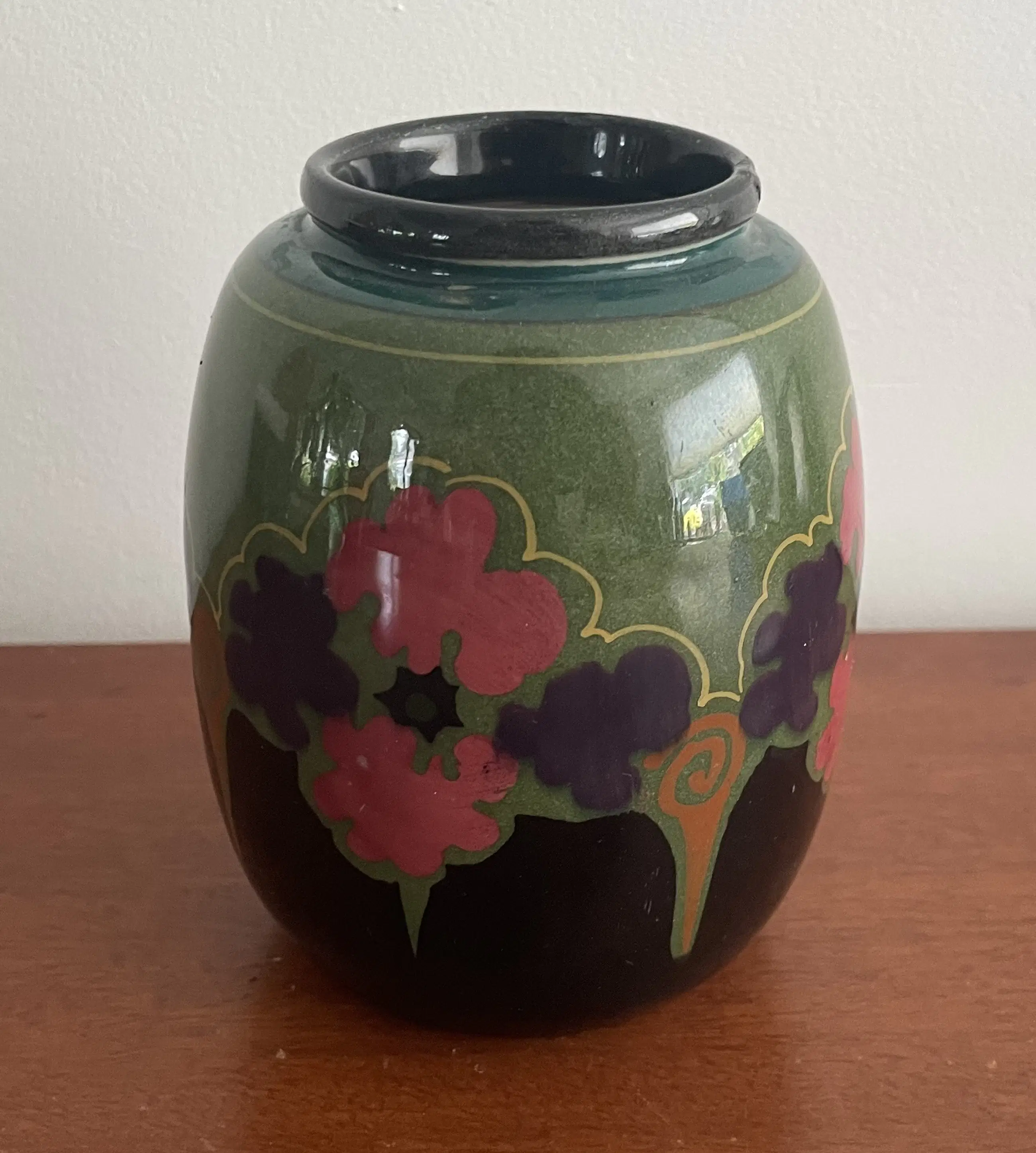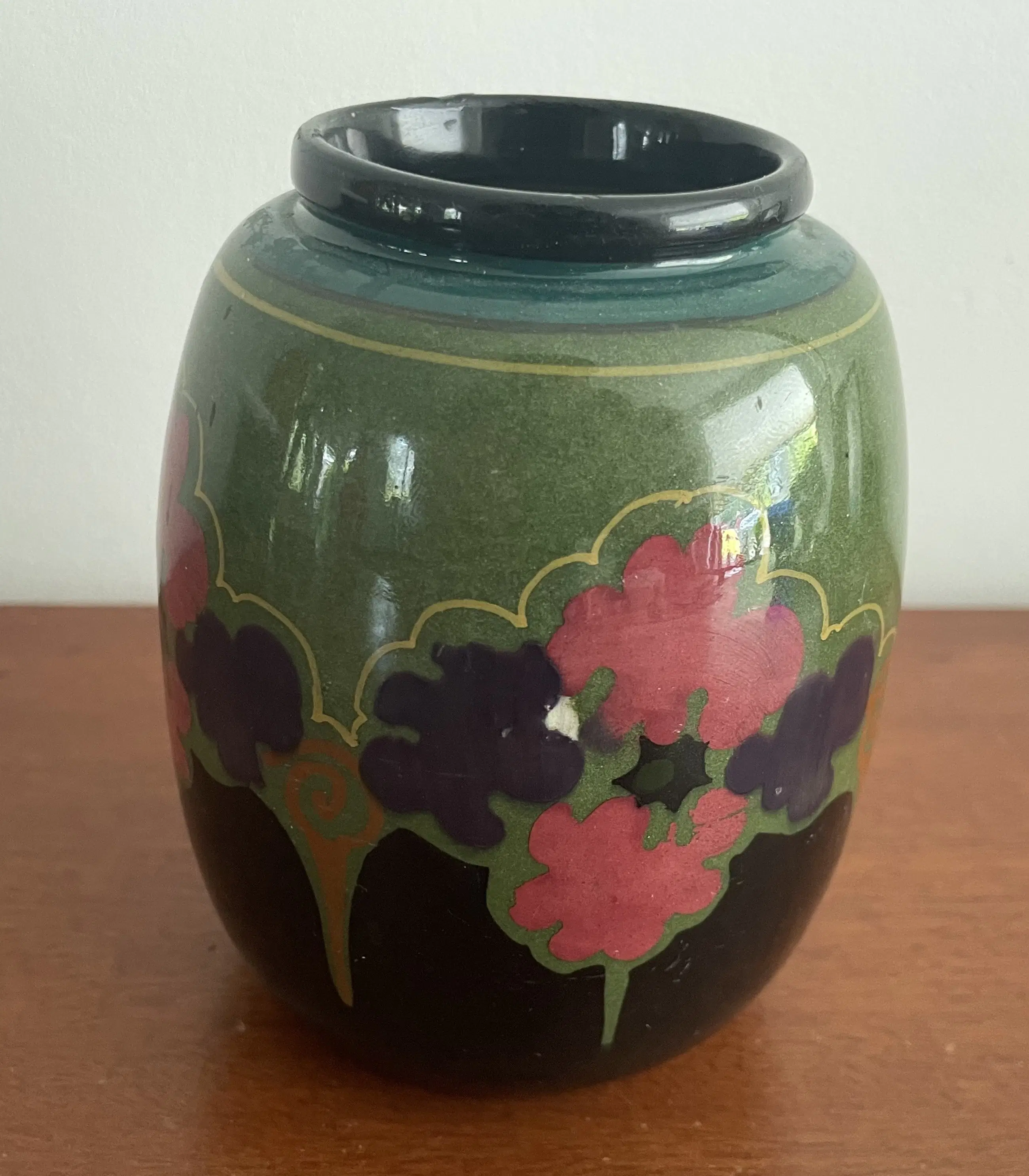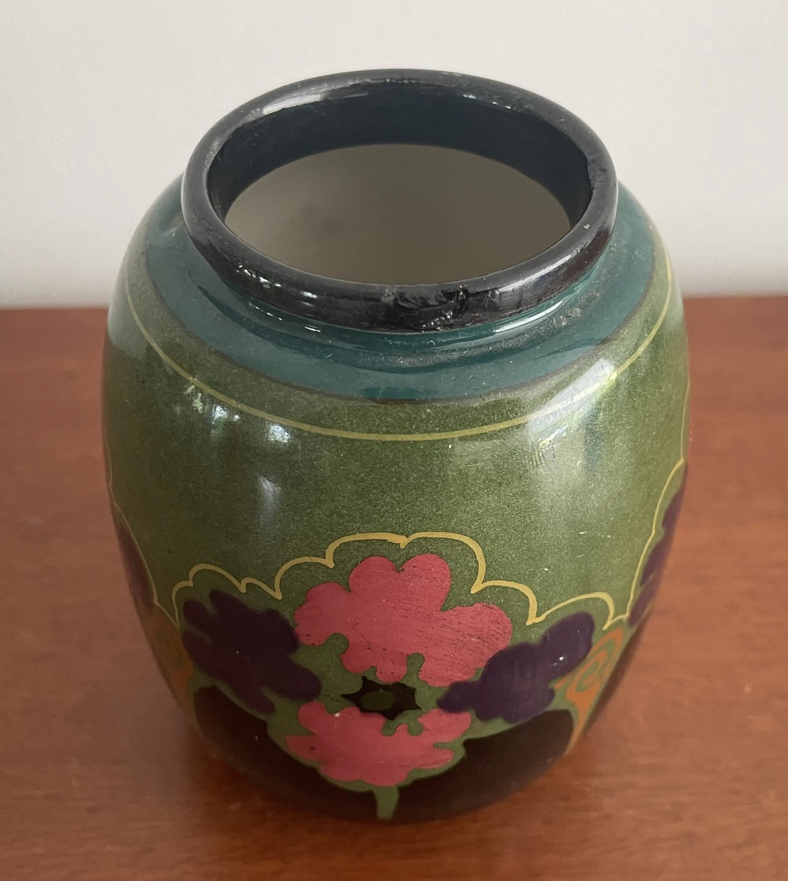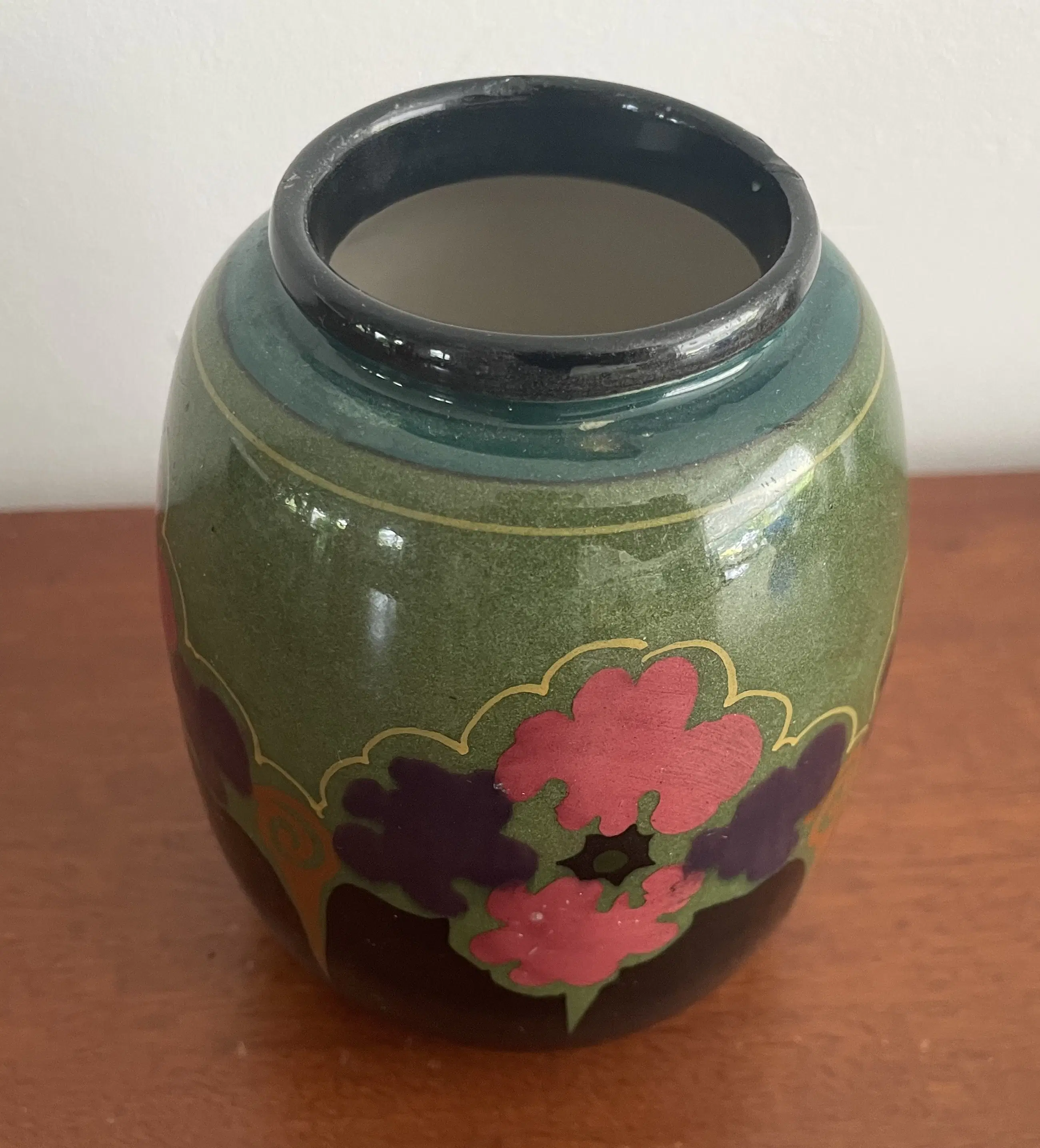 Glans platelen vaasje van Plateelfabriek Ivora uit Gouda. In goede conditie, heeft een kleine reparatie aan de bovenrand en mist bijzonder genoeg aan een kant wat decoratie en hier zit dan ook een wit plekje wat wel is geglazuurd, het is dus geen schade of een chipje.