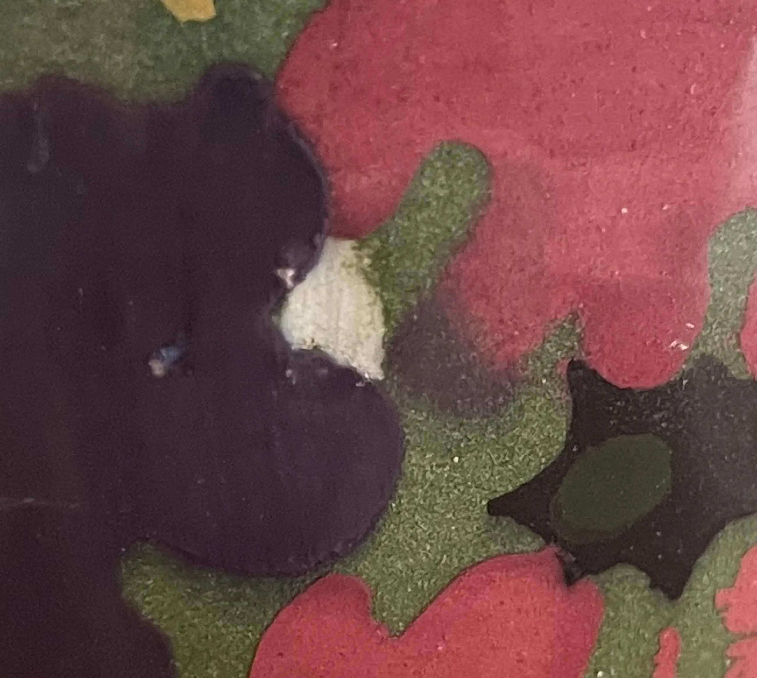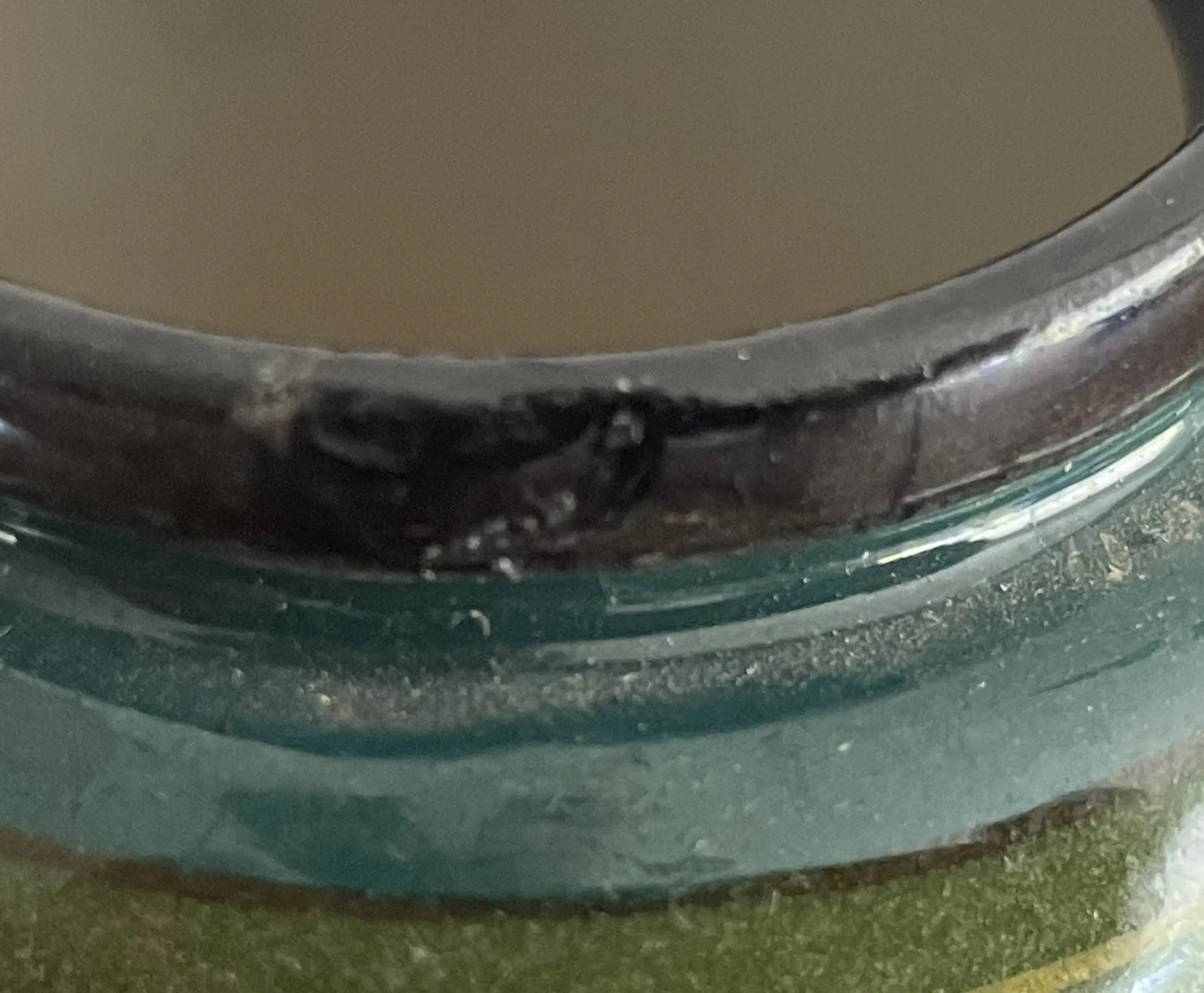 Heeft een reparatie op de bovenrand en heeft een stukje wit waar het schilderwerk niet gepakt heeft.