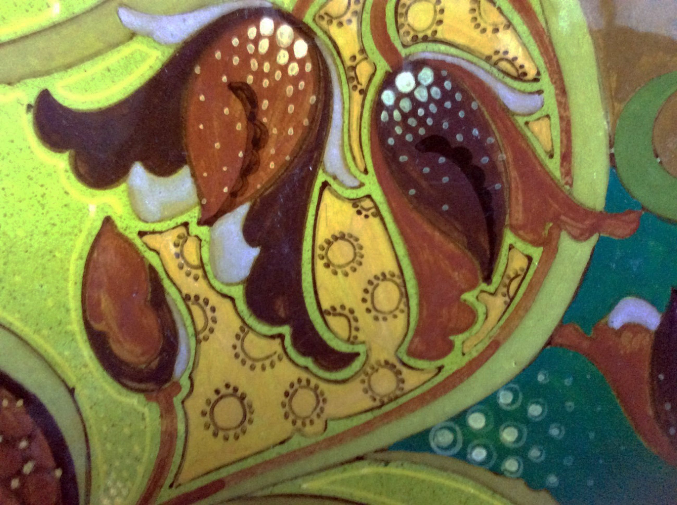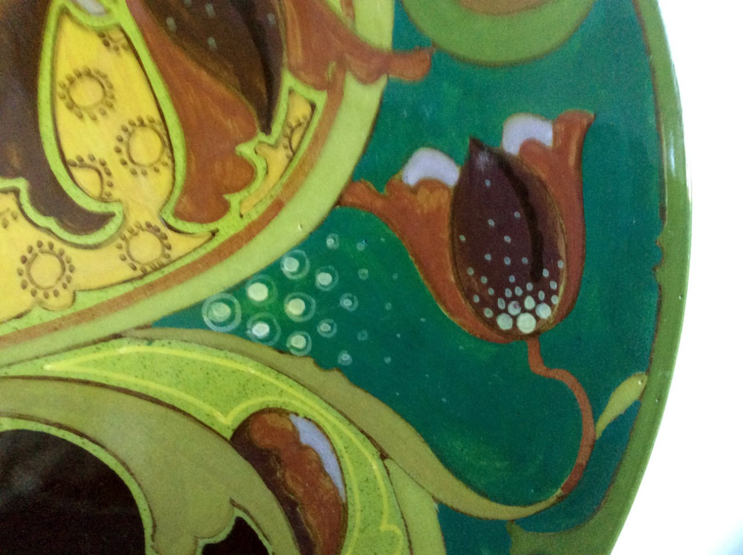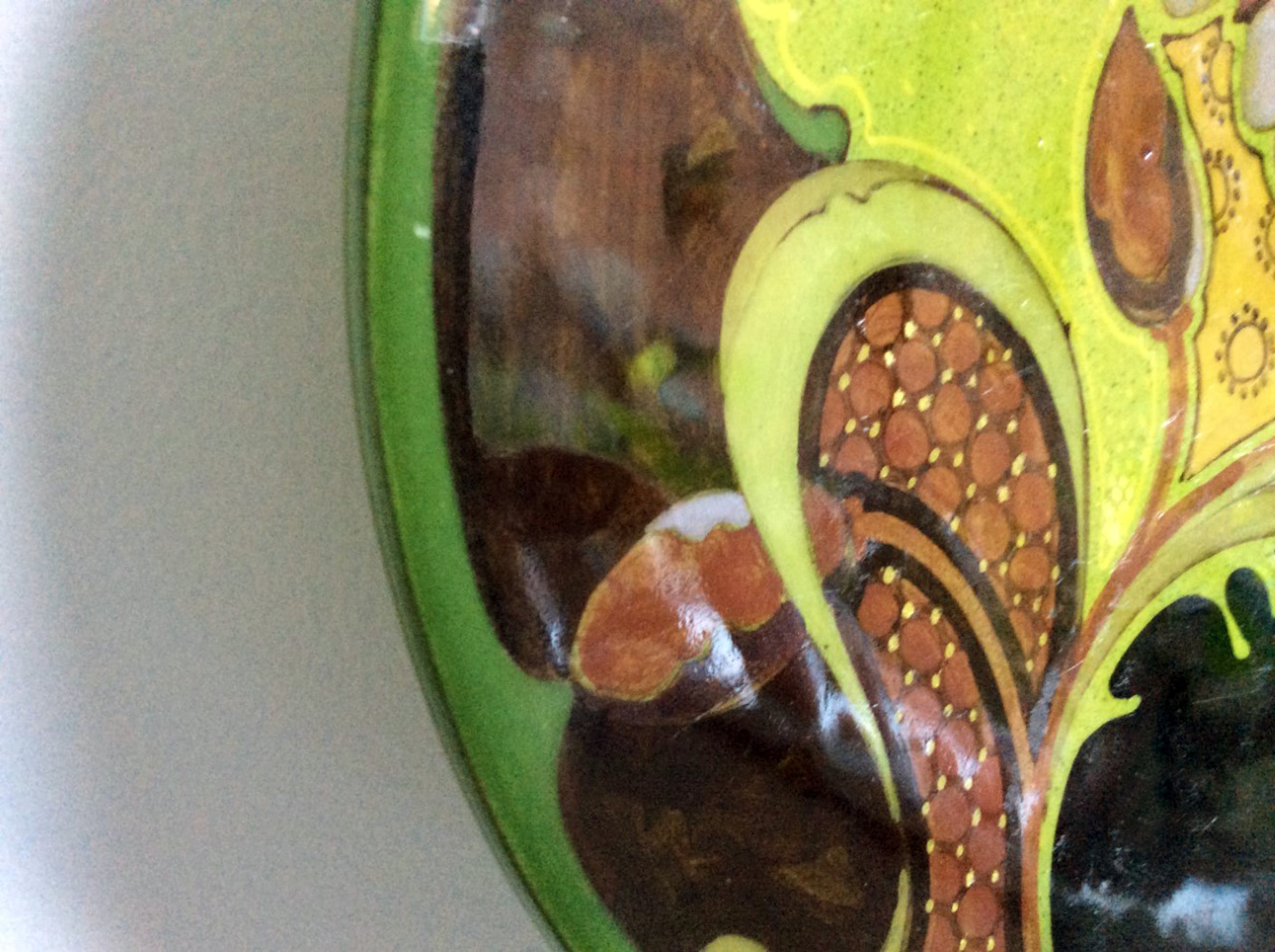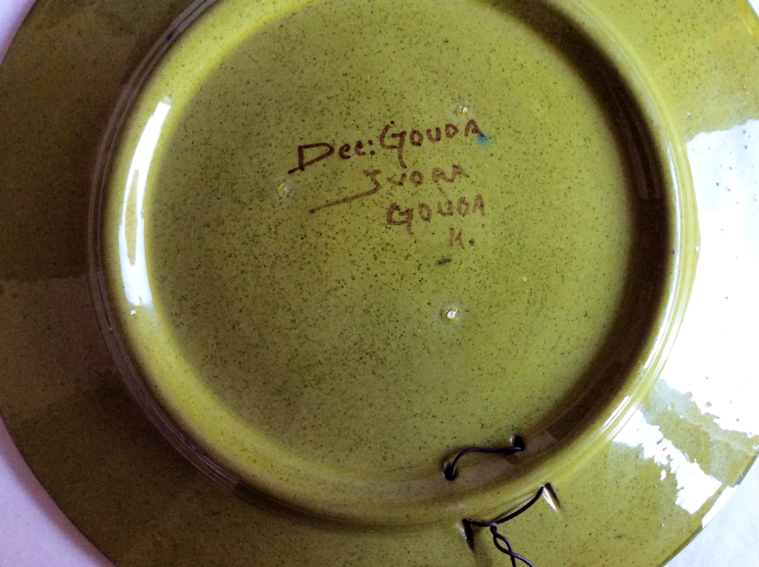 Gouda plateel bord, ca. 1920.Afm. doorsnede 23,5 cm, hoogte 3 cm.Gesigneerd onderzijde: DEE; GOUDA / IVORA / GOUDA K.Lichte gebruikssporen aan het glazuur, geen defecten.