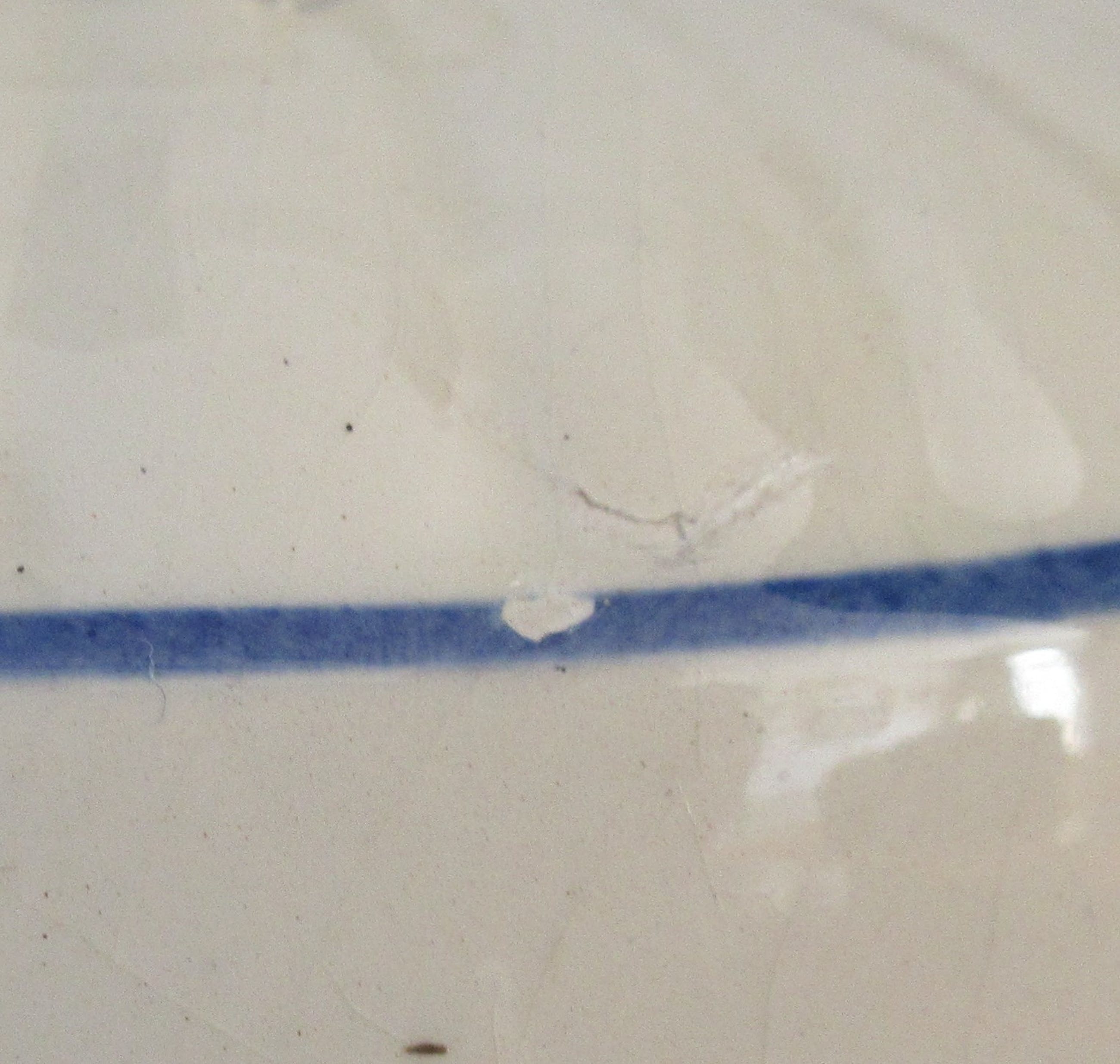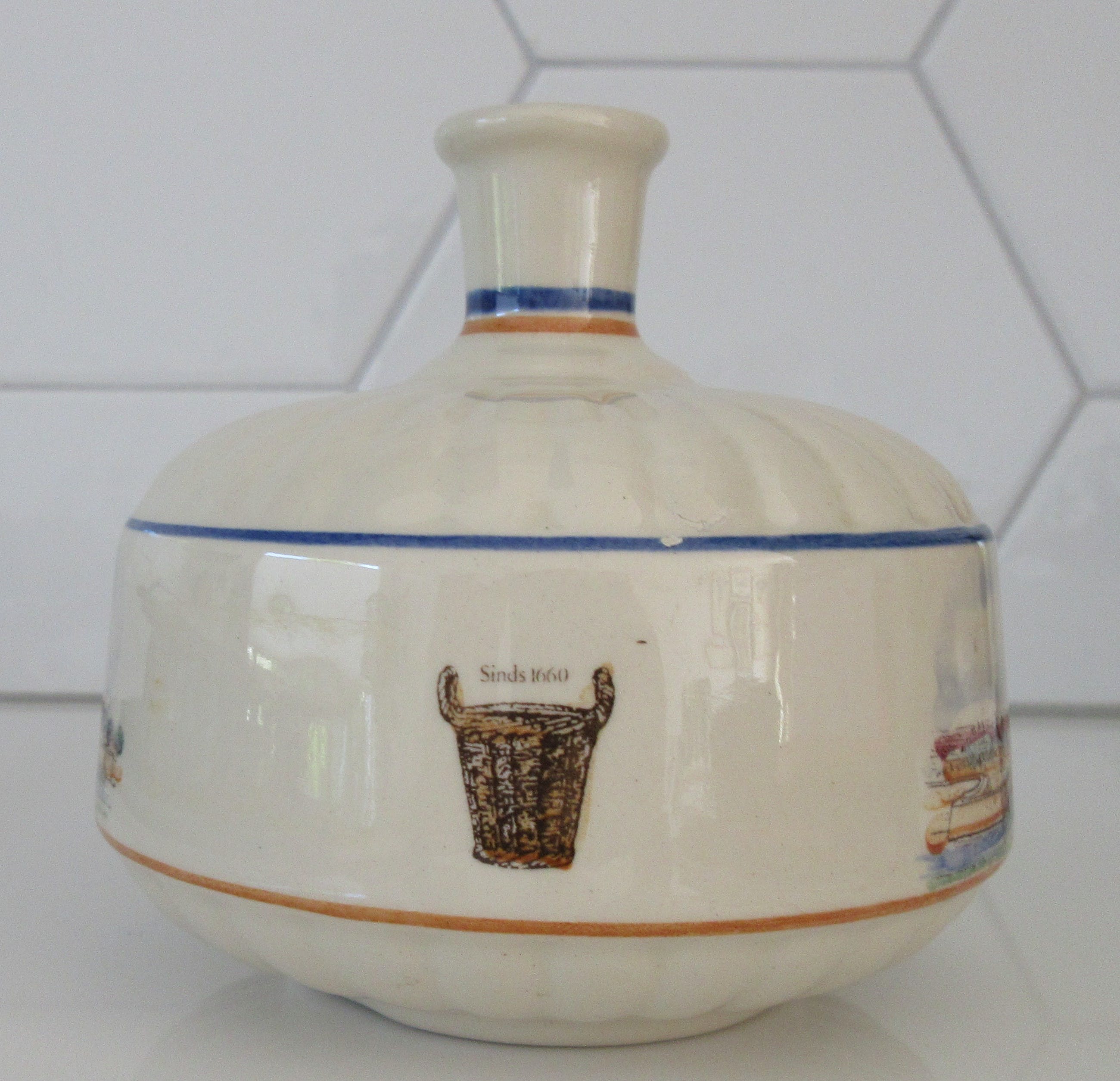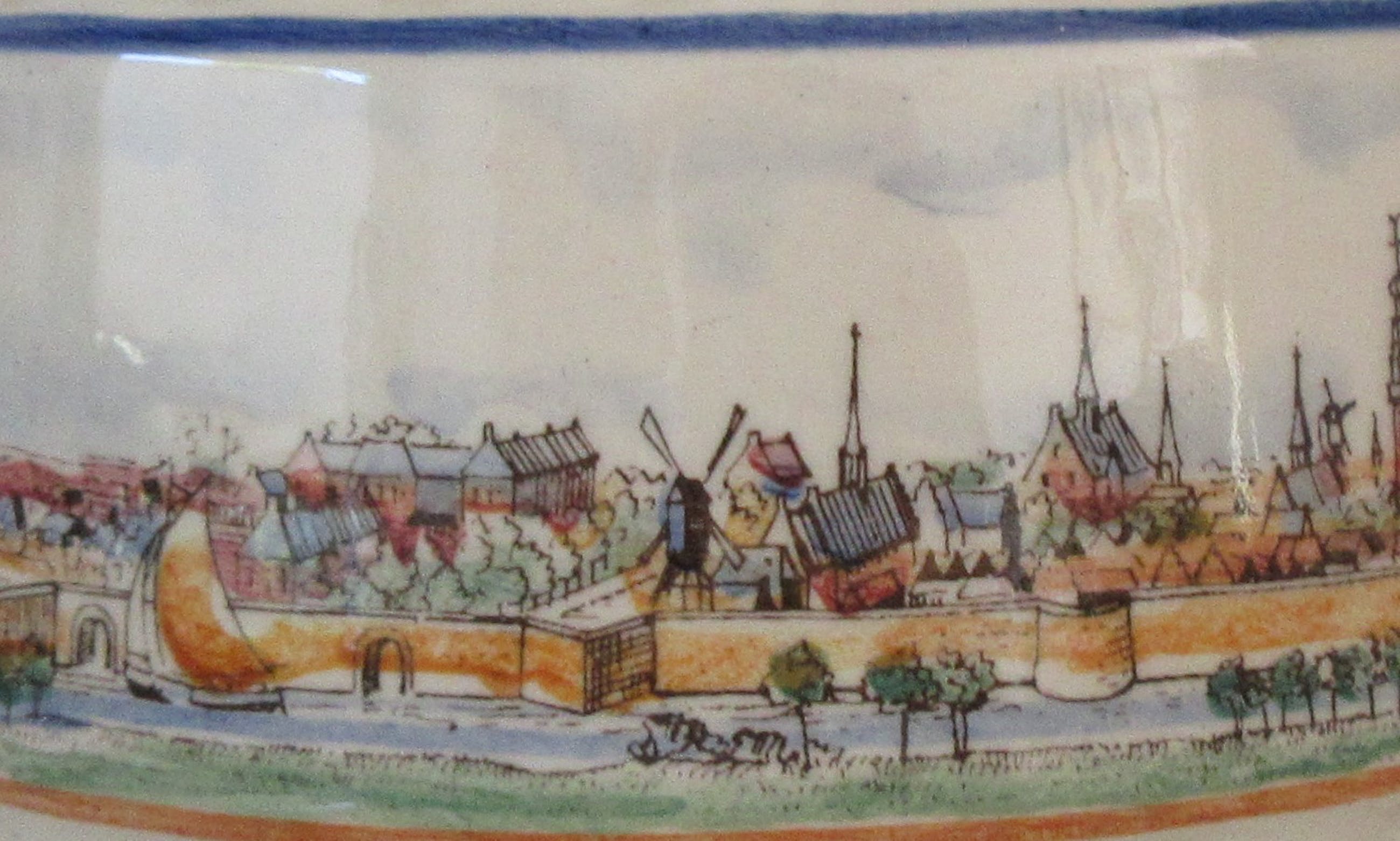Mooi wit platelen vaasje met simpele oranje en blauwe decoratie en op de zijkant de afbeelding van de stad Haarlem in 1660. Ter ere van waarschijnlijk het 300-jarig bestaan gemaakt, maar ik heb niet kunnen achterhalen wat. In goede conditie, heeft een kleine beschadiging.