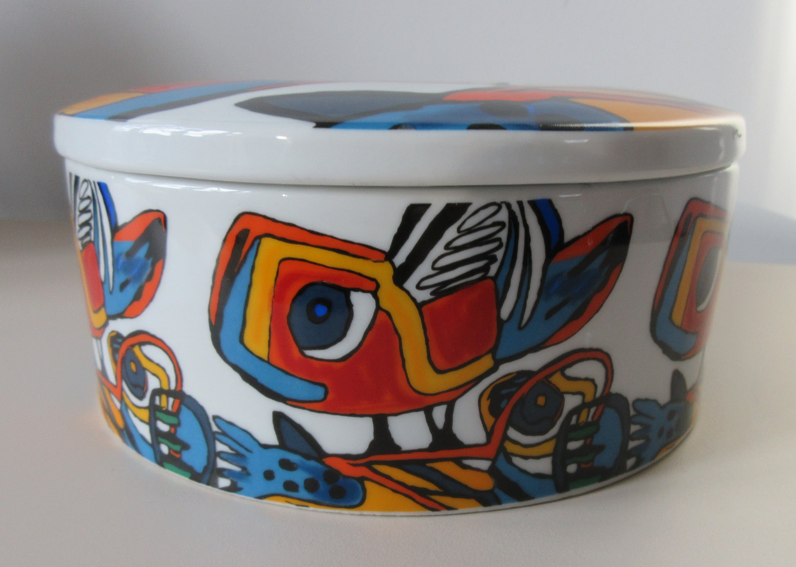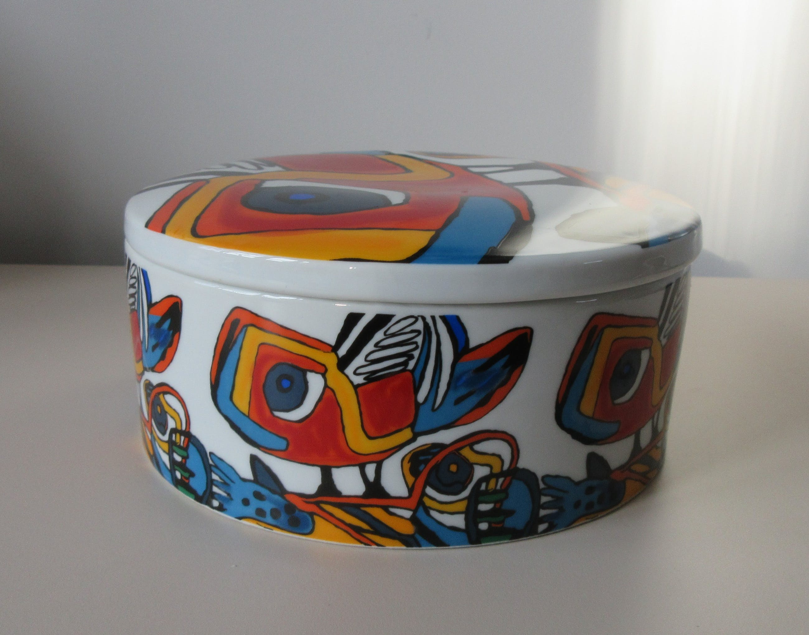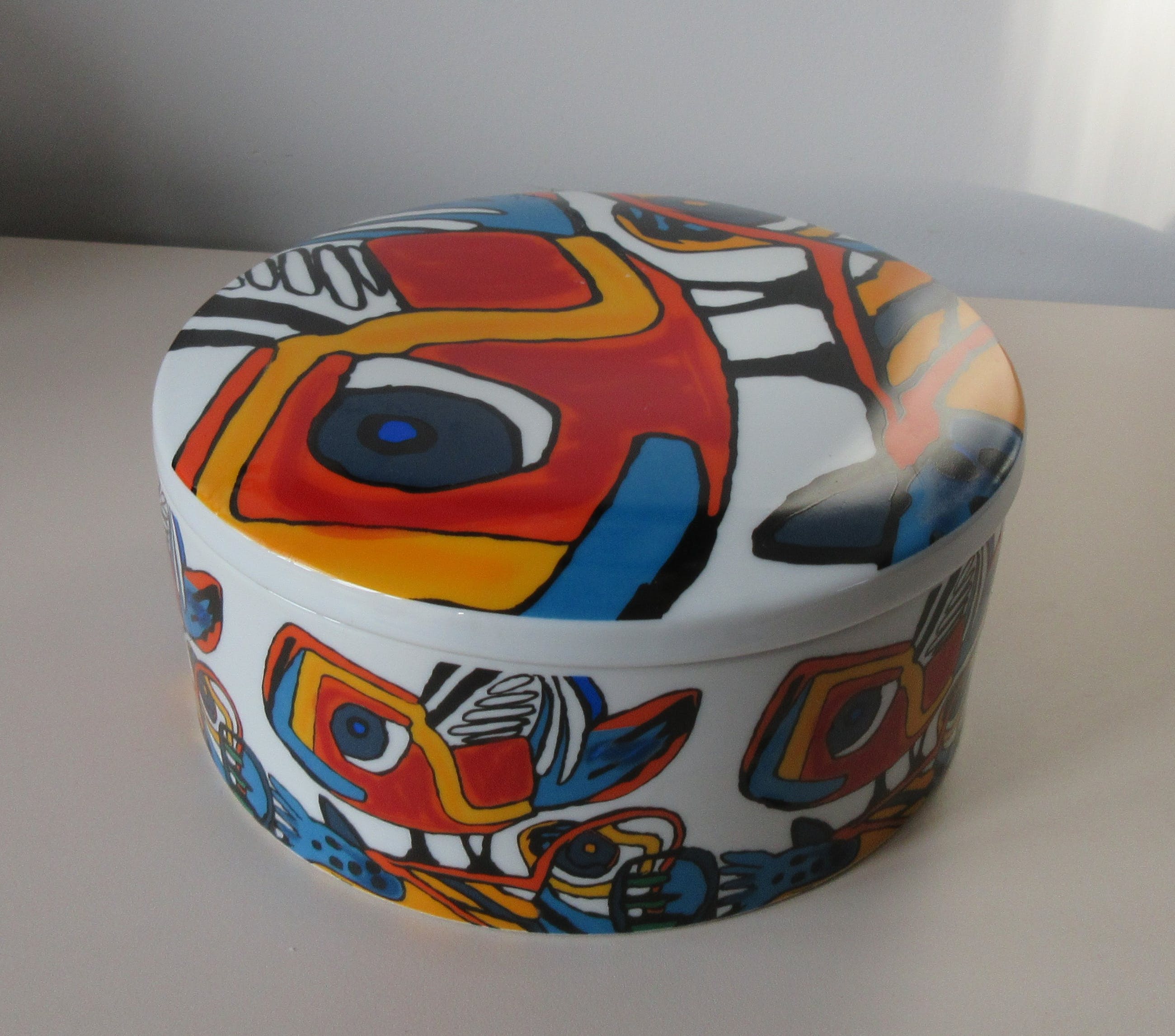 Mooie porseleinen doos met afbeeldingen naar Cobra actie vogels. Het is in gave staat. Aan de onderkant de tekst "net even anders, een kado met een boodschap". Fabrikant Schoonhoven Keramiek. Mooie kleurrijke en vrolijke doos.