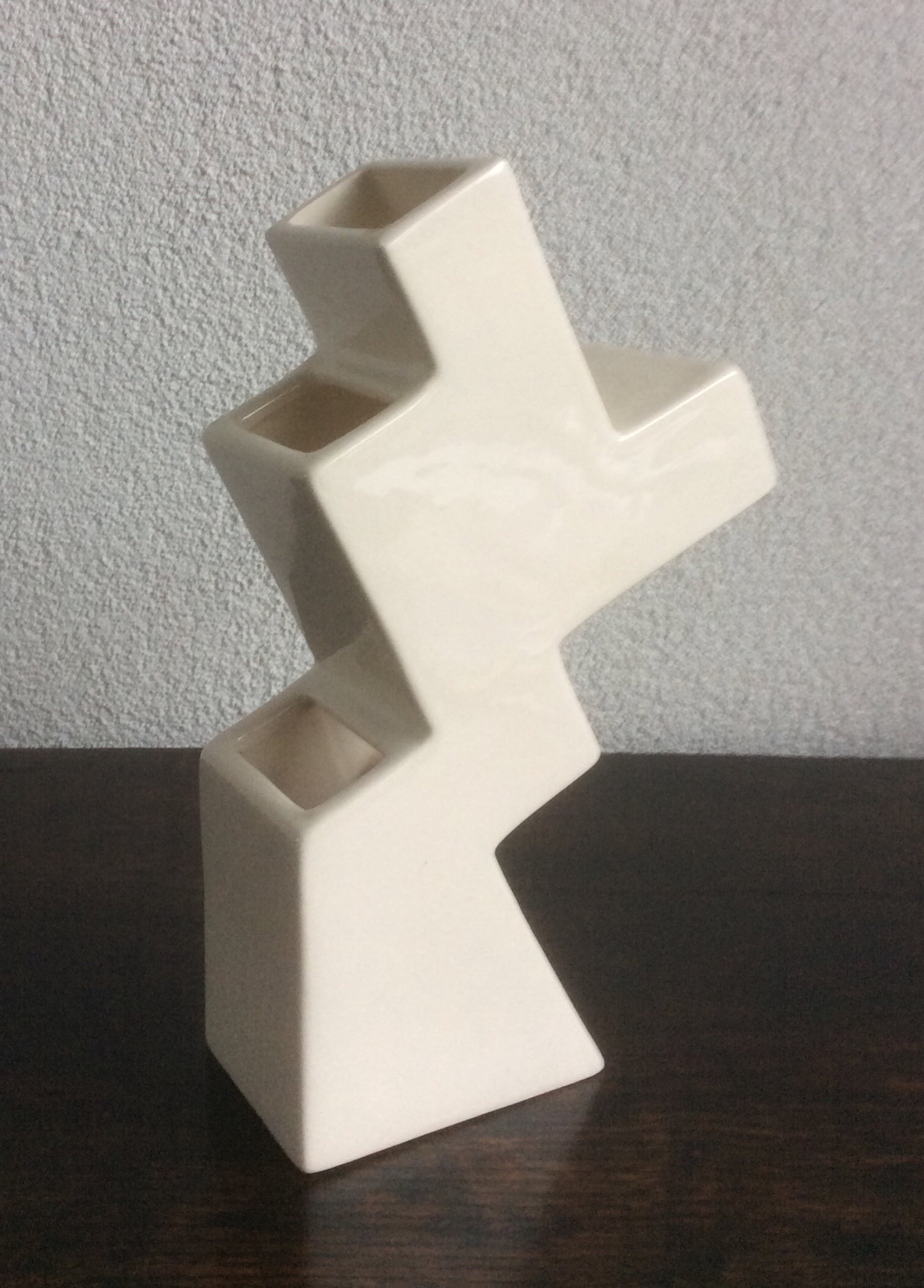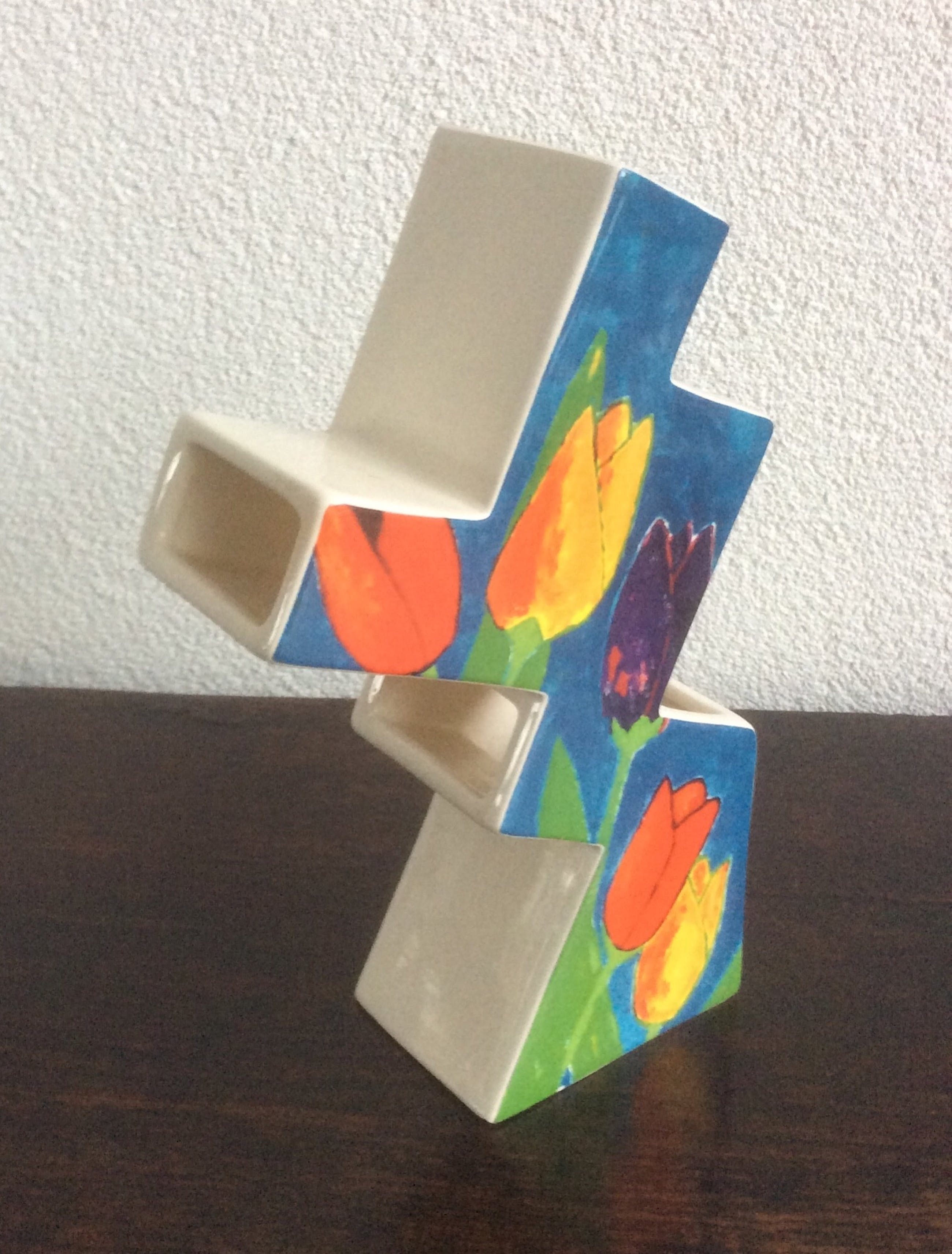 Strak gevormde vaas met vijf openingen. Gedecoreerd aan de voorzijde met vijf tulpen door. Twee minimale chipjes aan de onderzijde, alleen te zien aan de onderzijde. Verder in nieuwstaat.