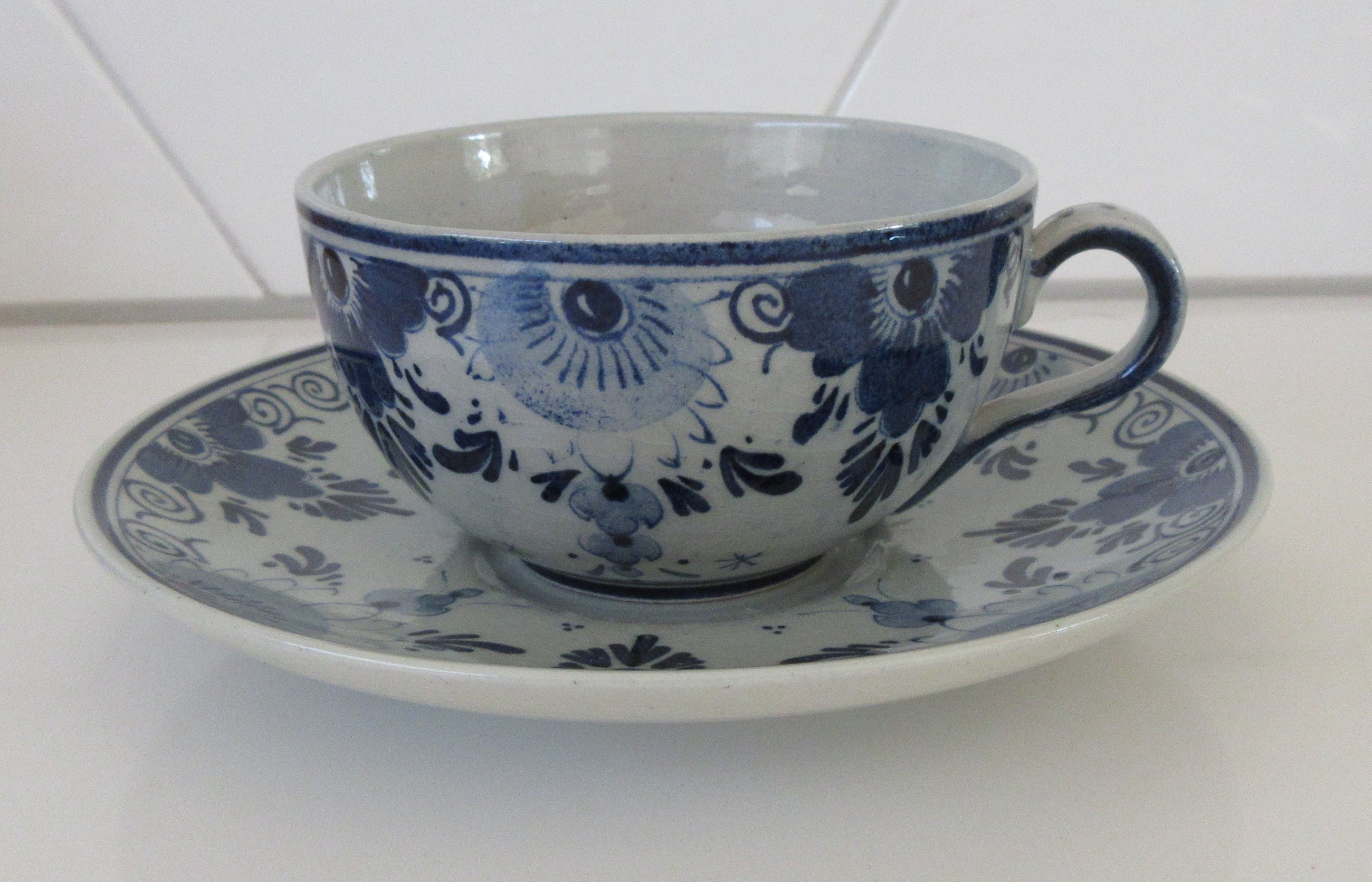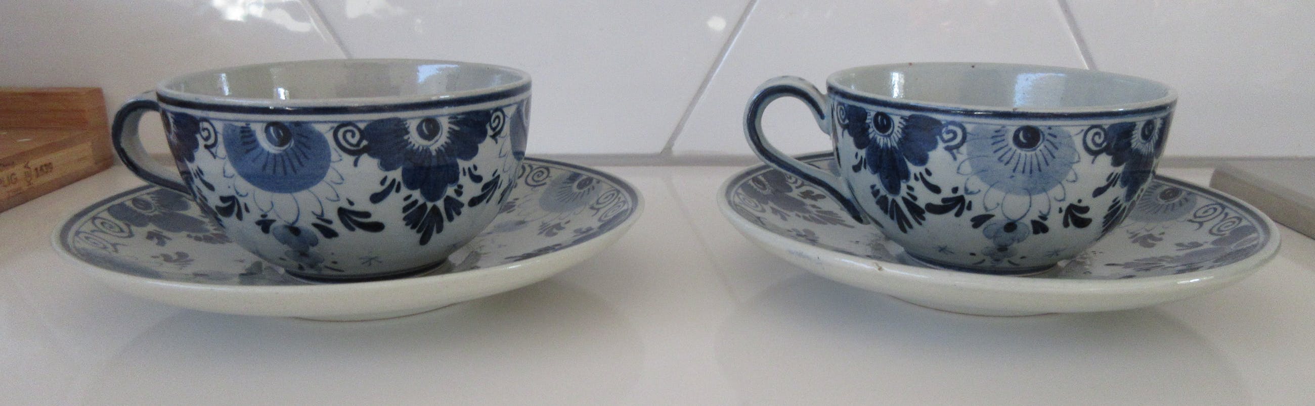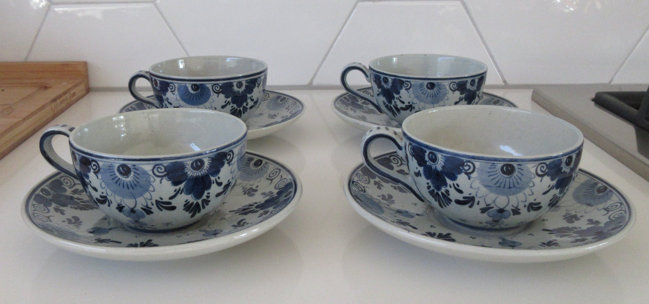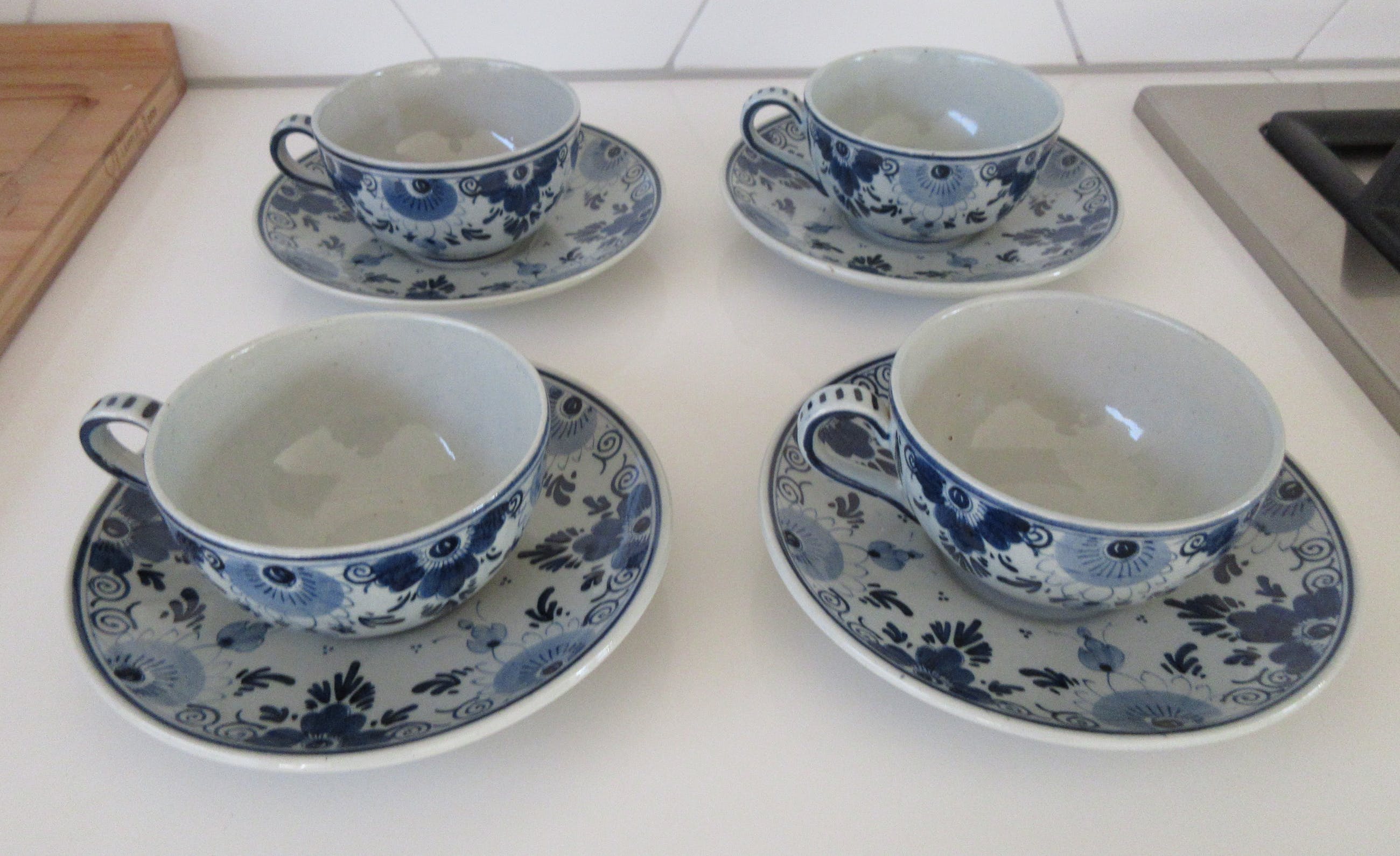 Vier platelen kop en schotels decor Delfts uitviering plateelfabriek Schoonhoven. Alle vier zijn in prima onbeschadigde conditie.