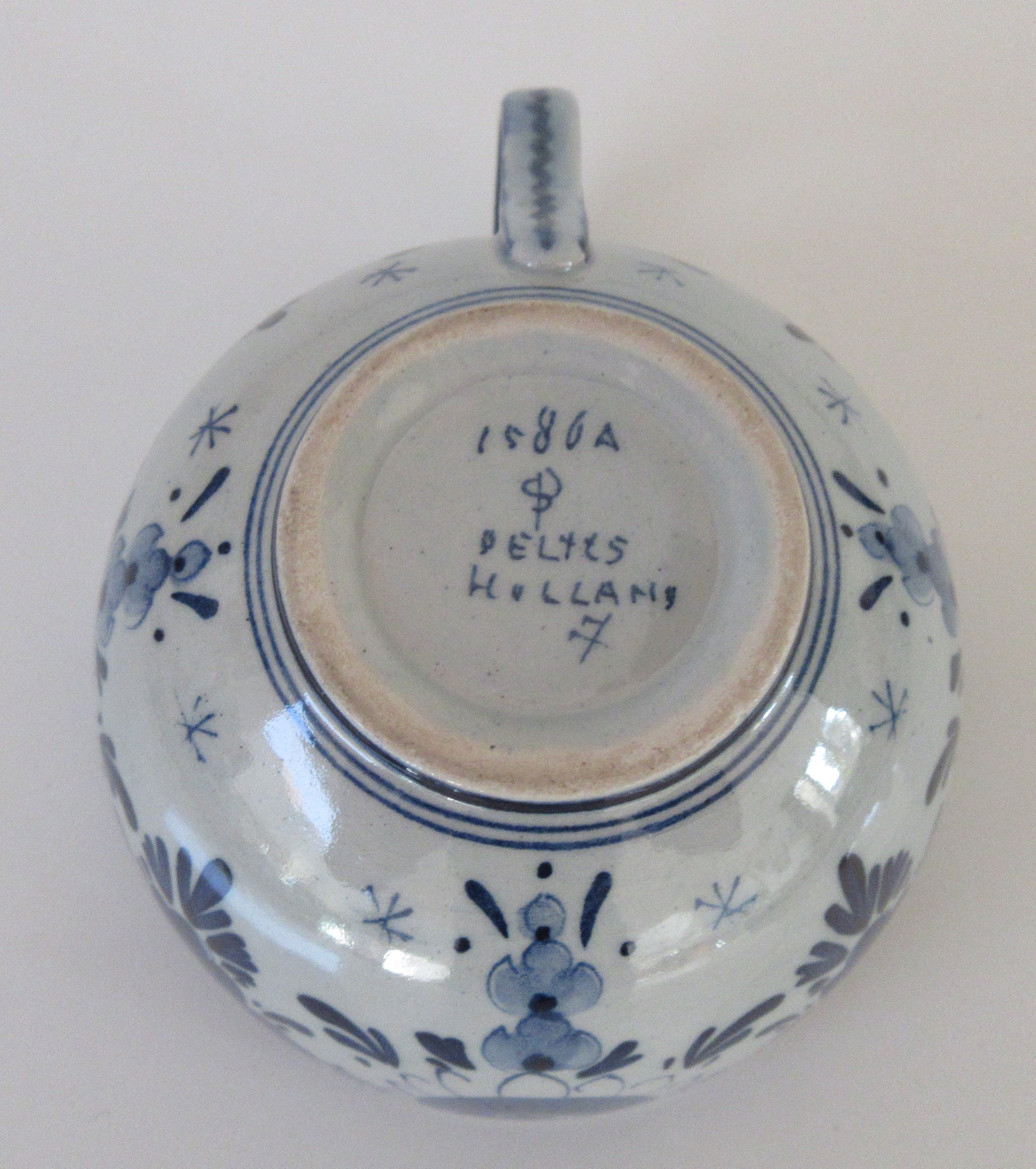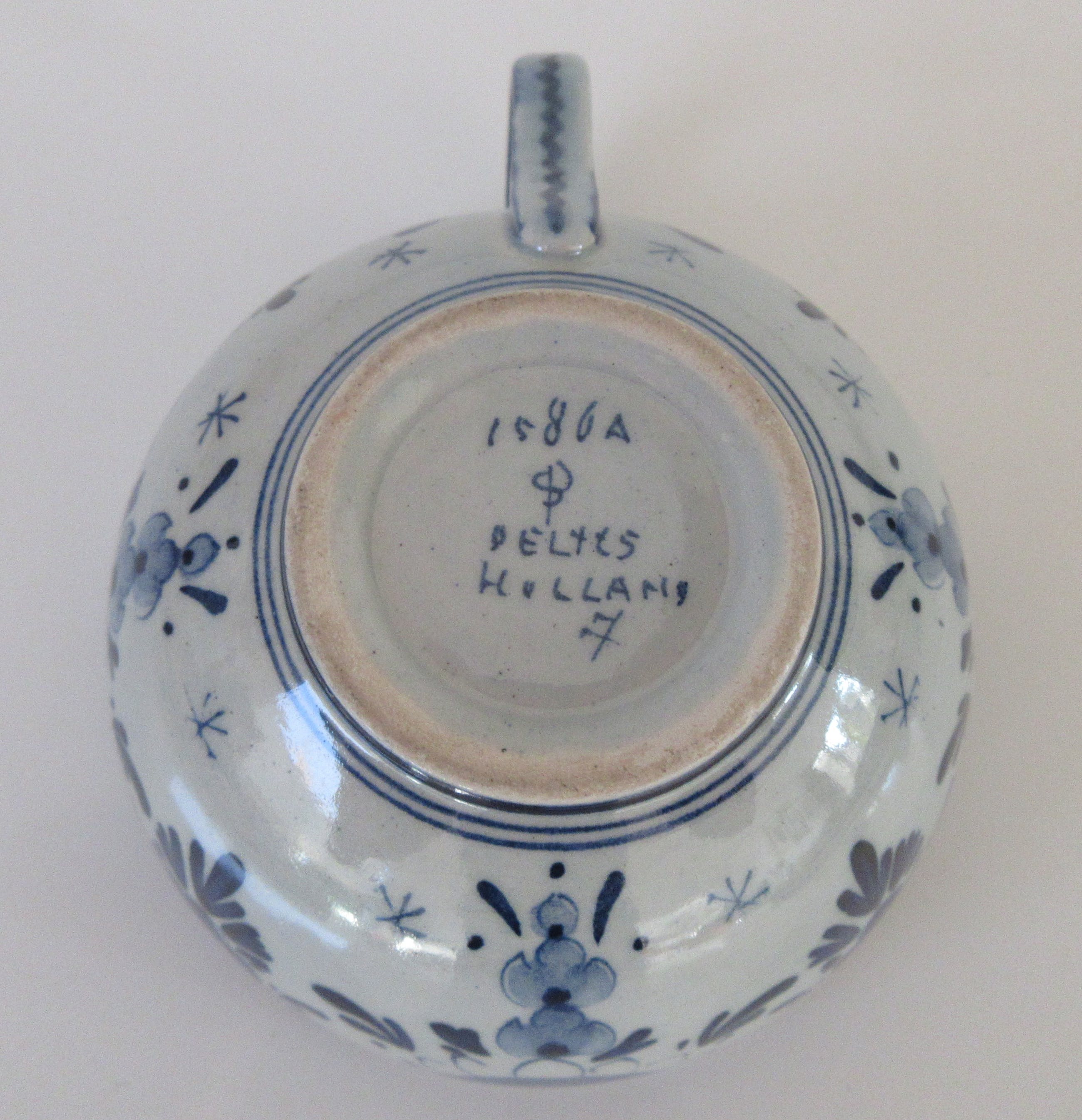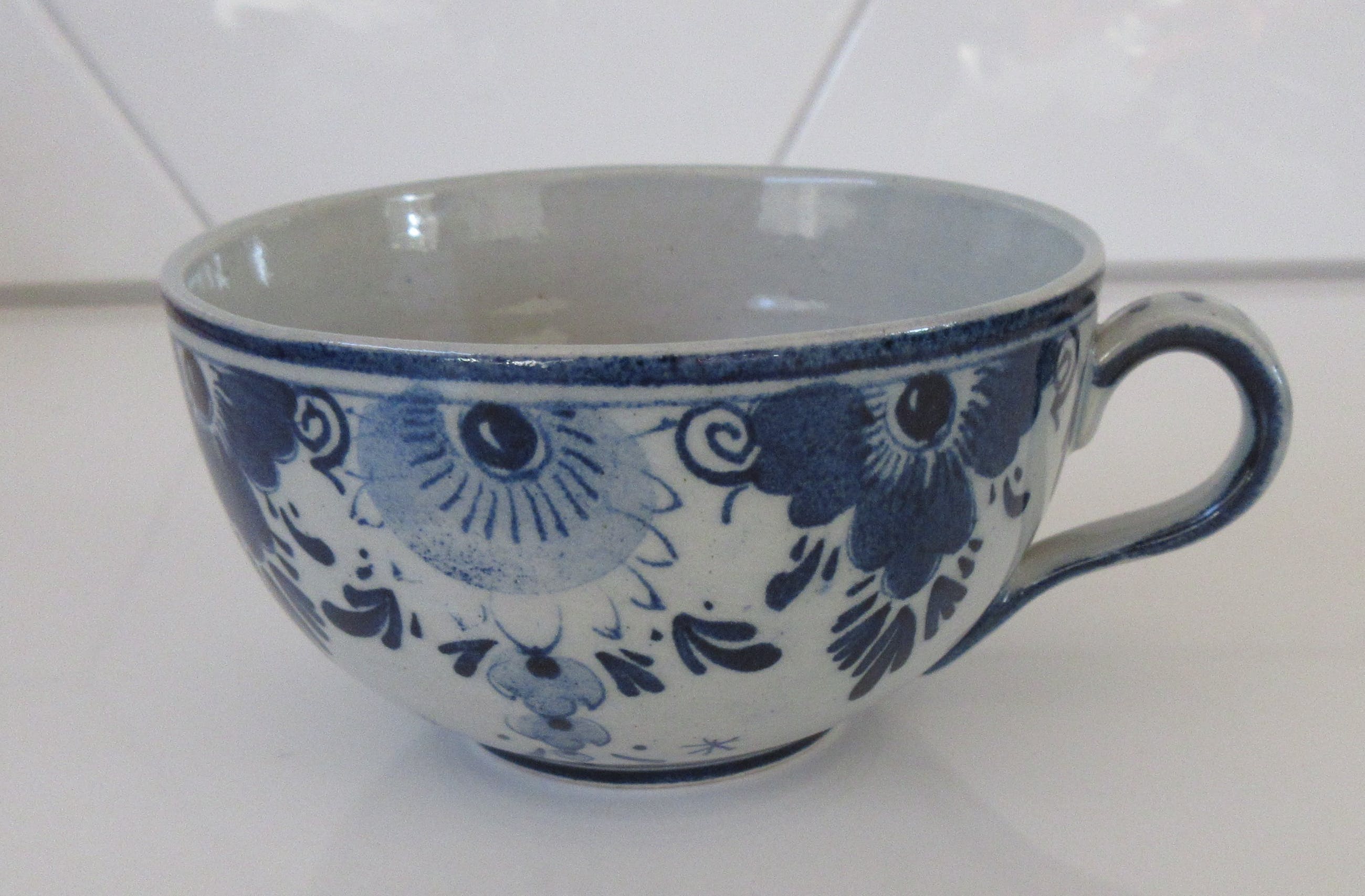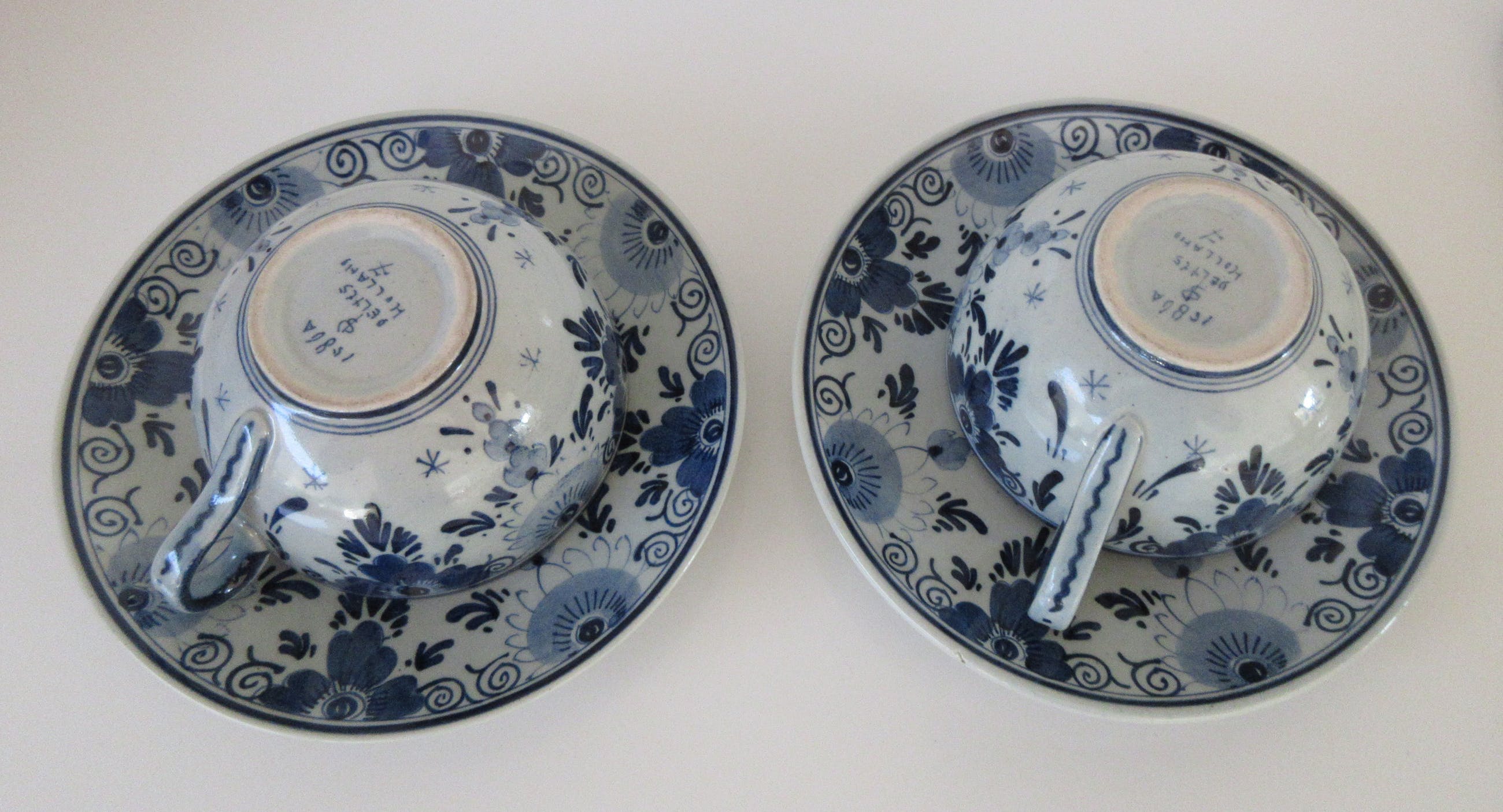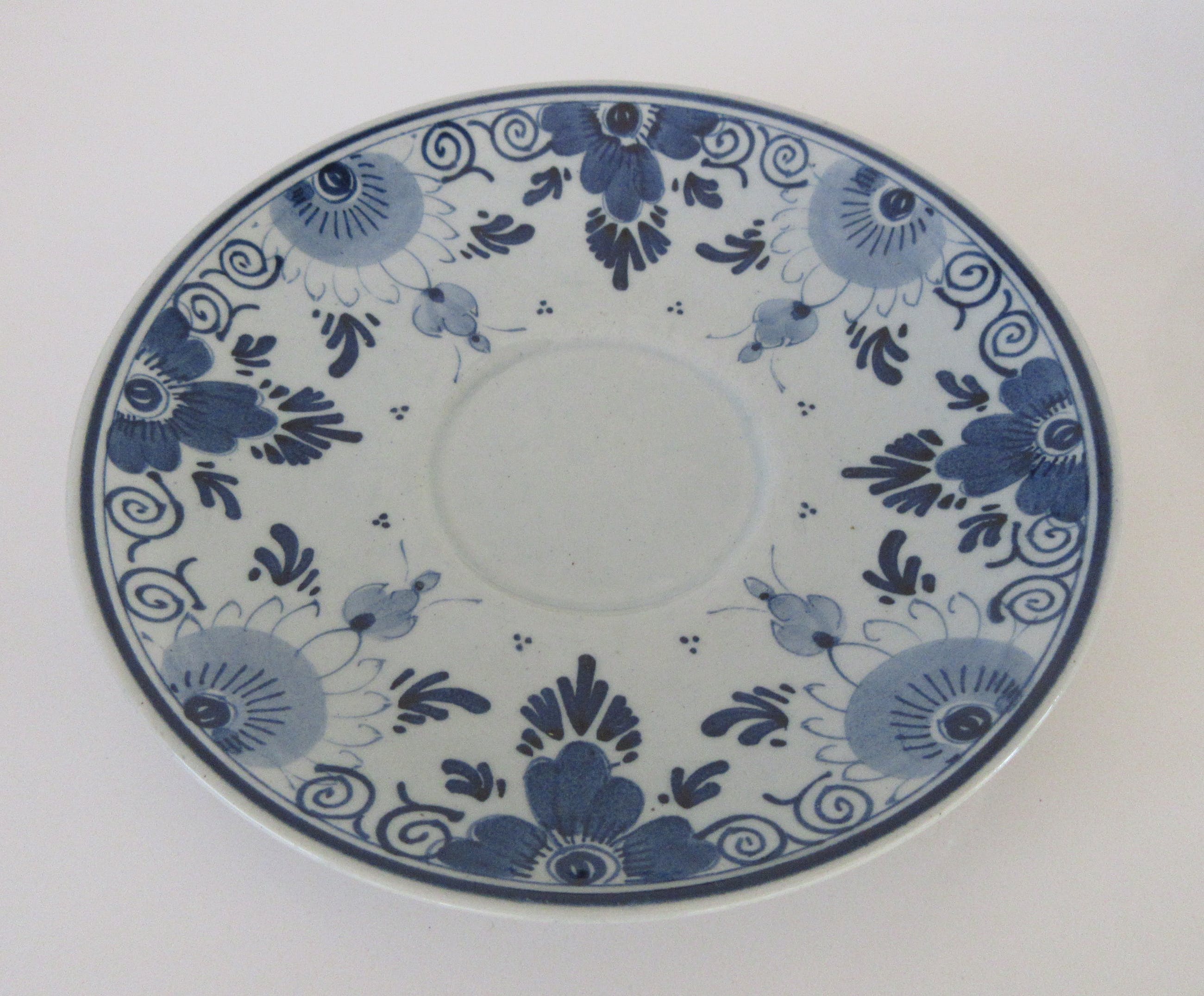 Vier platelen kop en schotels decor Delfts uitviering plateelfabriek Schoonhoven. Alle vier zijn in prima onbeschadigde conditie.