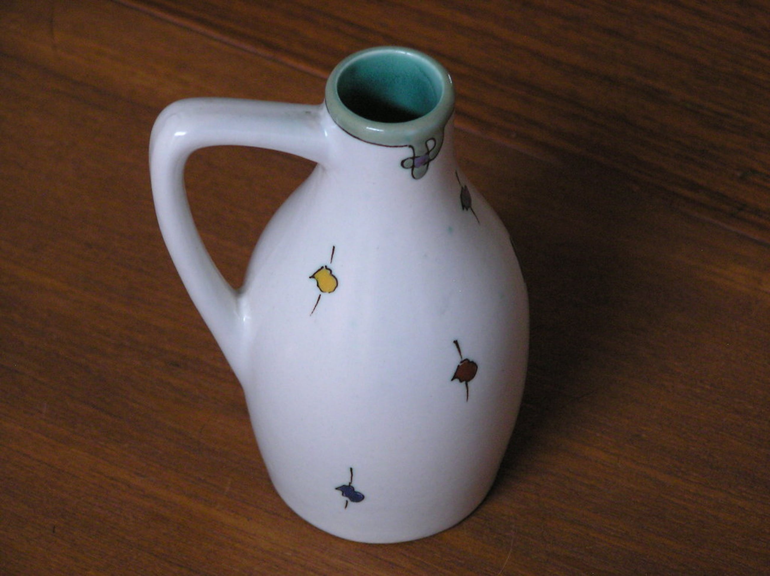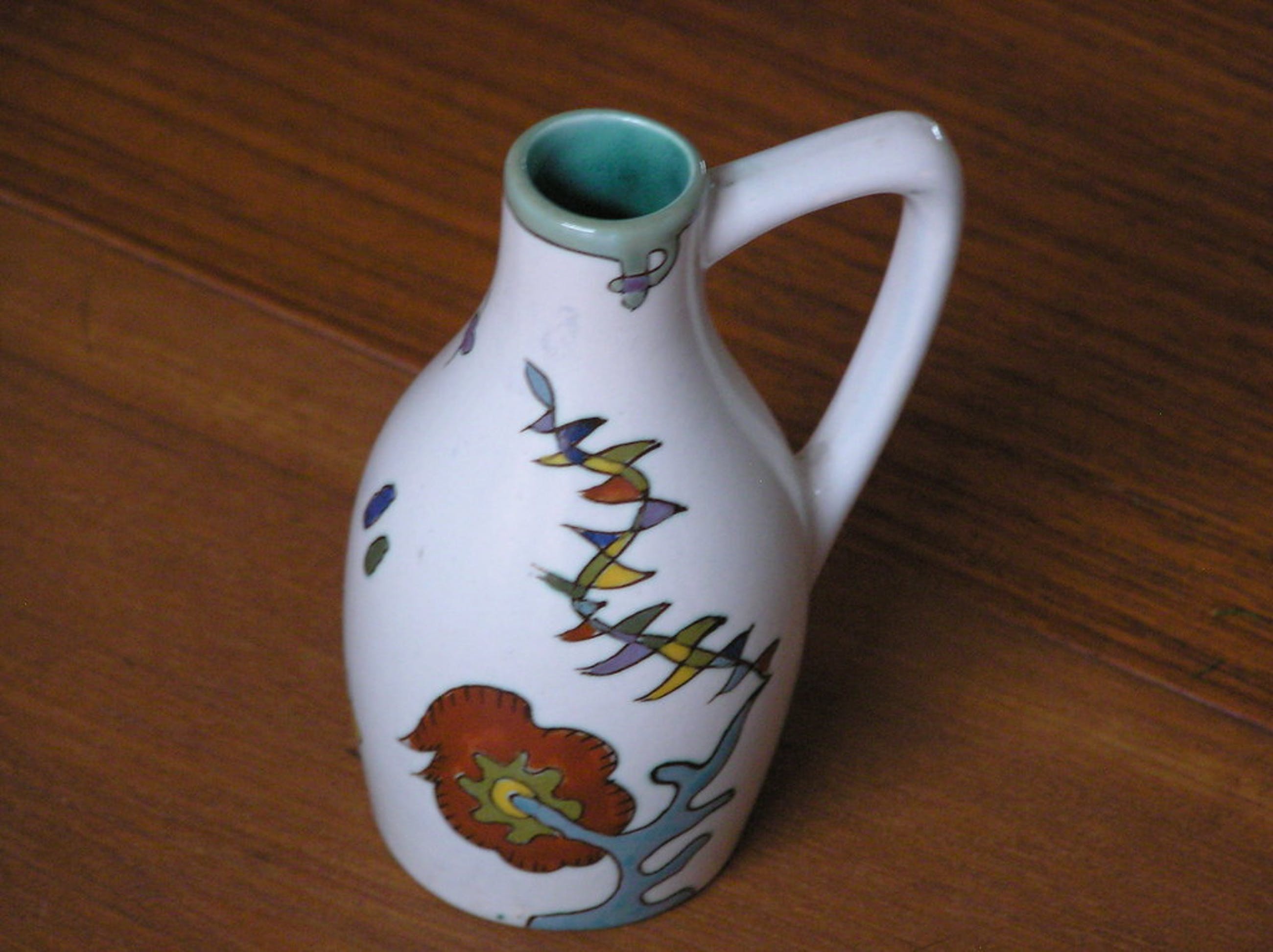 Plazuid, klein platelen kruikje jaren'50 voorzien van handbeschilderd kleurrijk fantasiedecor. Onderzijde voorzien van gestempeld en ingedrukt merk en handbeschilderd Model/decornr. 3761. In prima onbeschadigde conditie. Waarschijnlijk bedoeld voor de export.