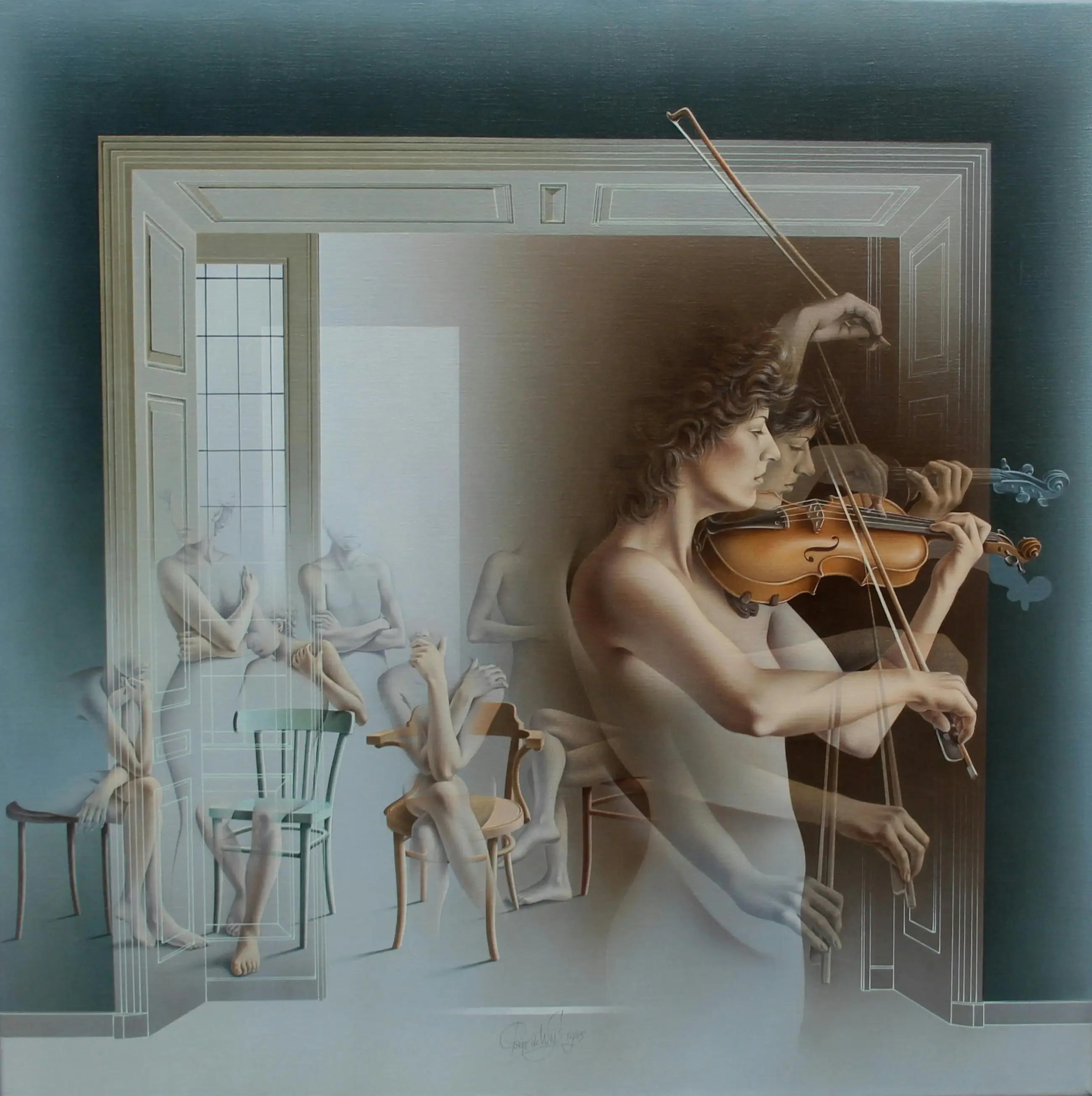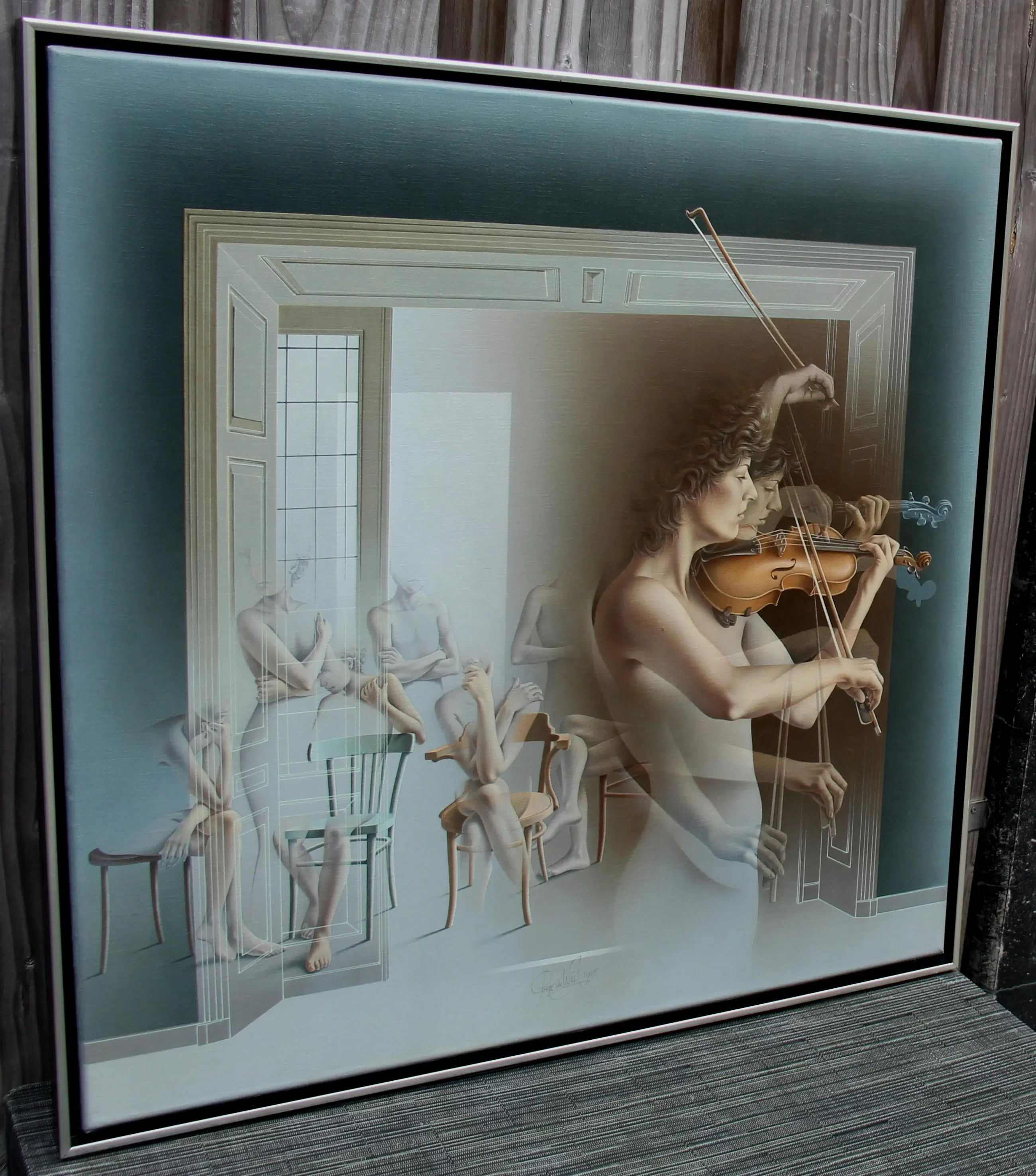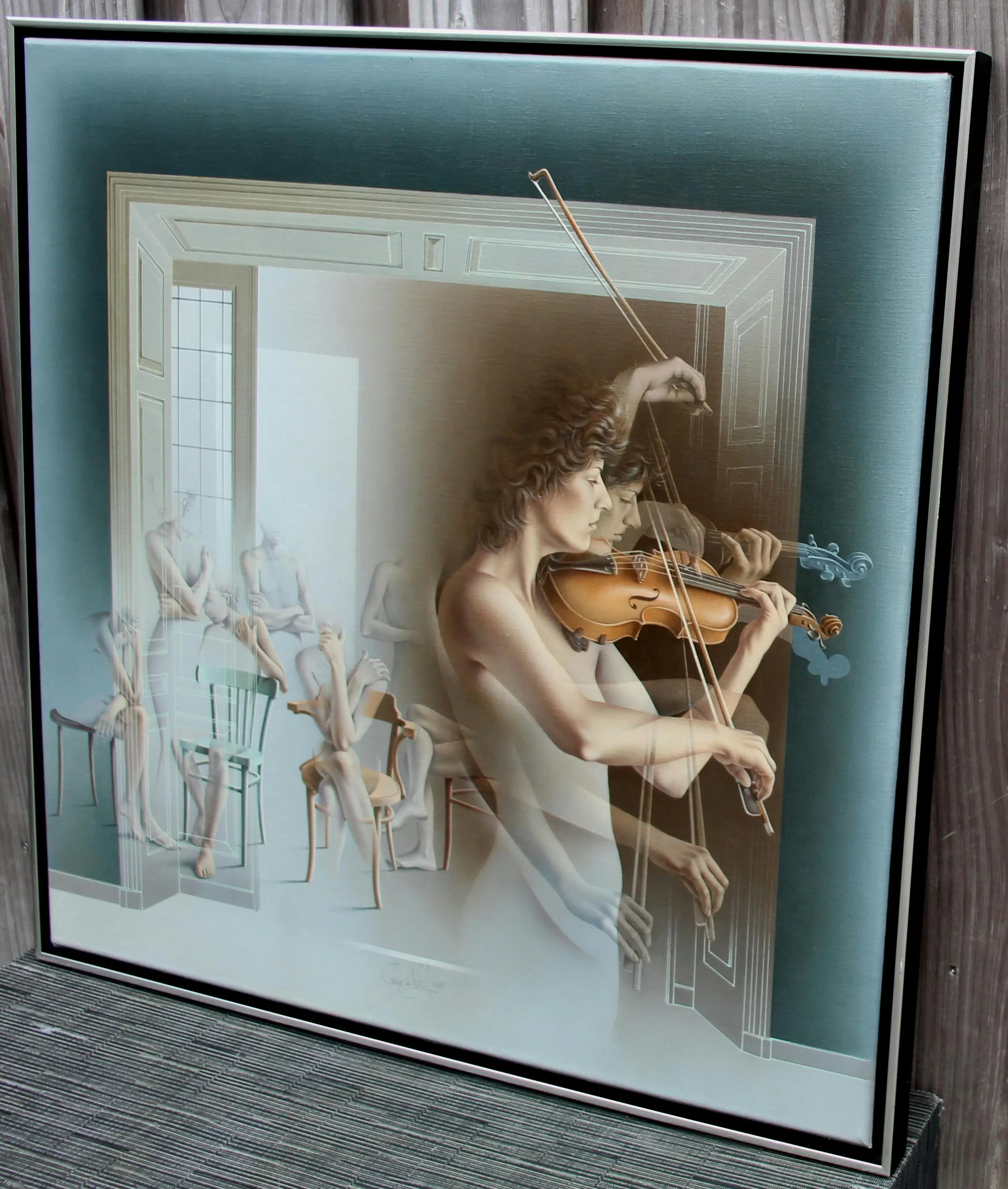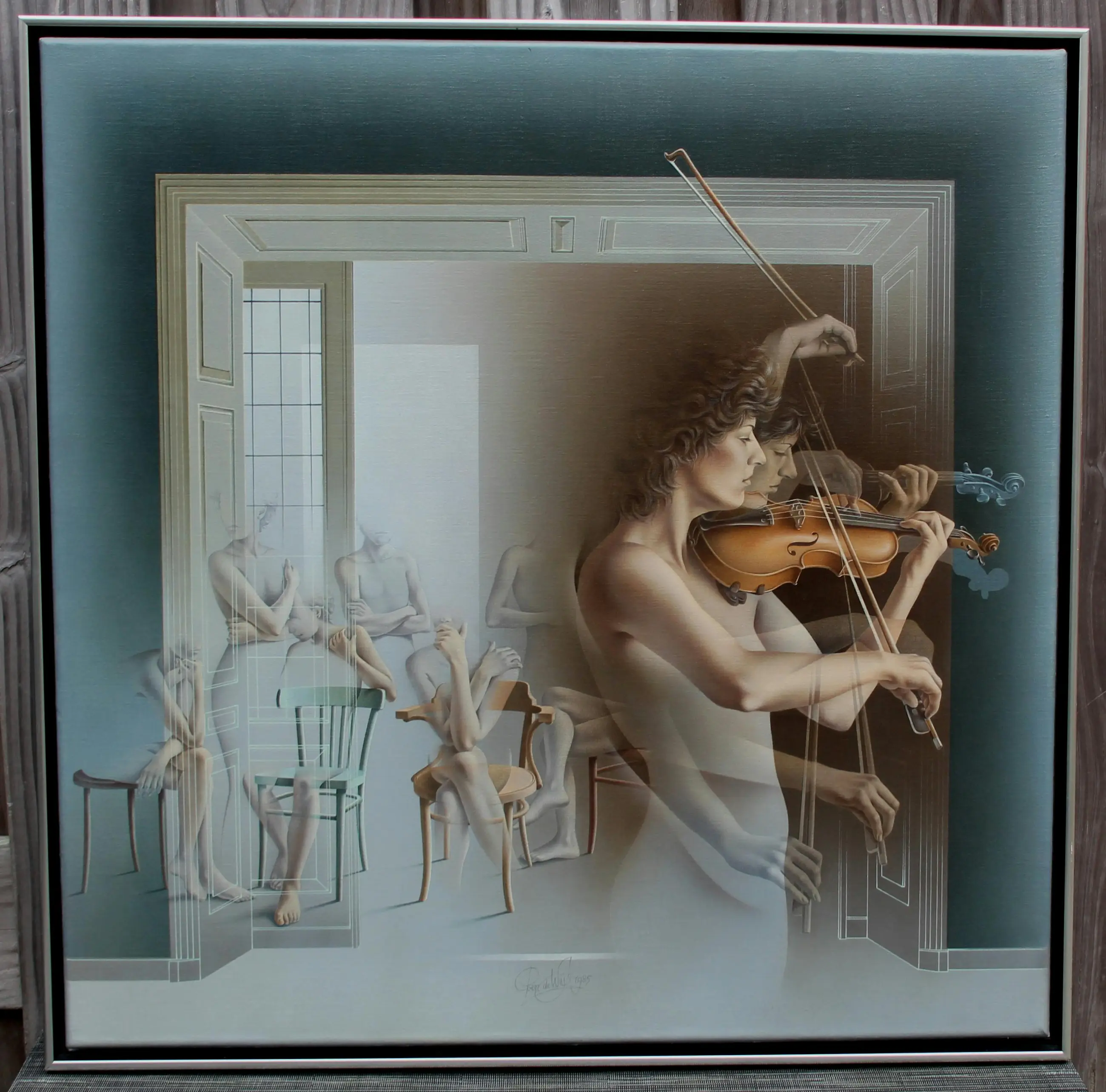 Ingelijste olieverf op doek, van Poen de Wijs. Titel: 'portrait of violin. Violist: Sylvia Houtzager. Jaar: 1985. Afmetingen incl lijst: H73 x b73cm. Afmetingen voorstelling: H70 x B70cm.