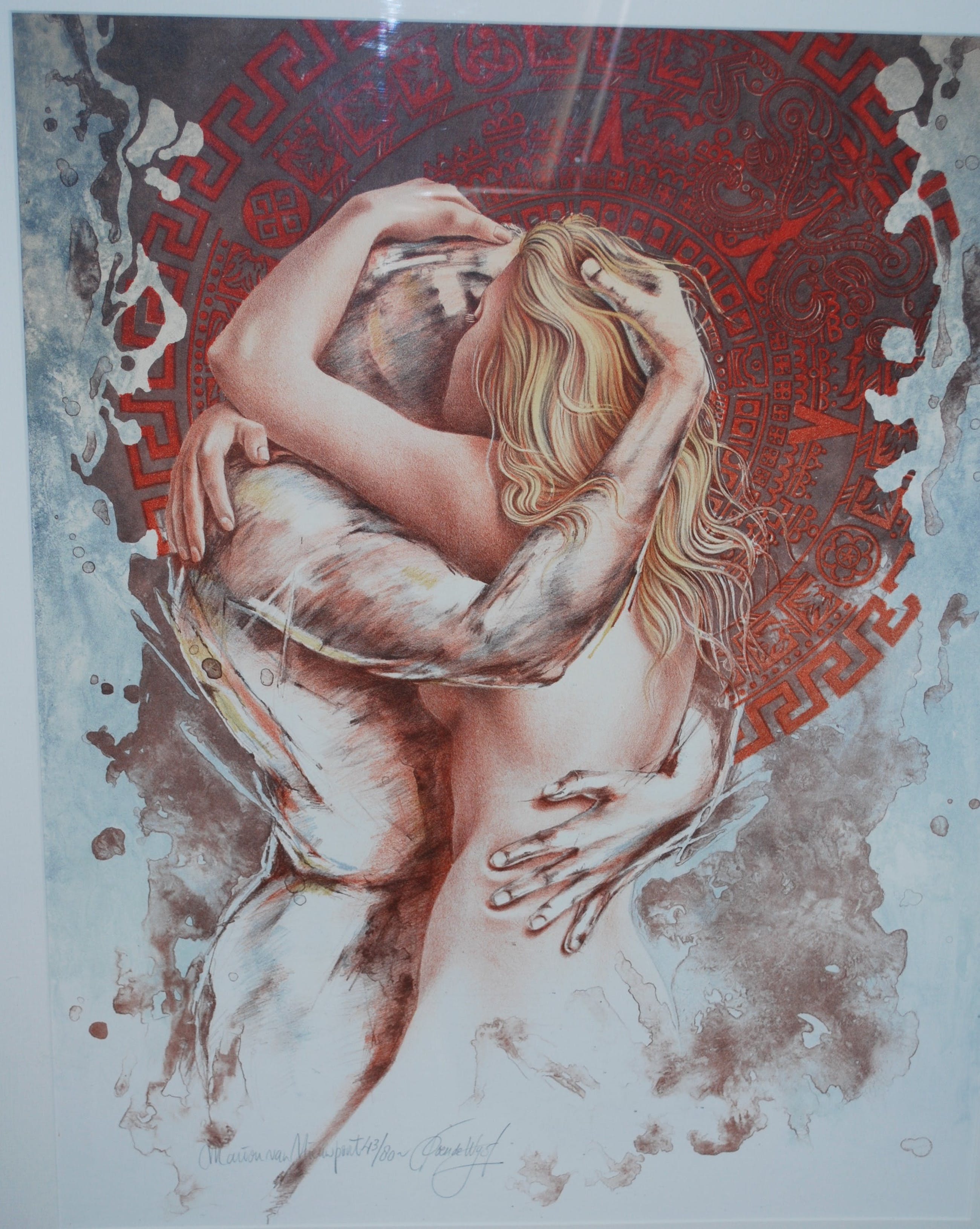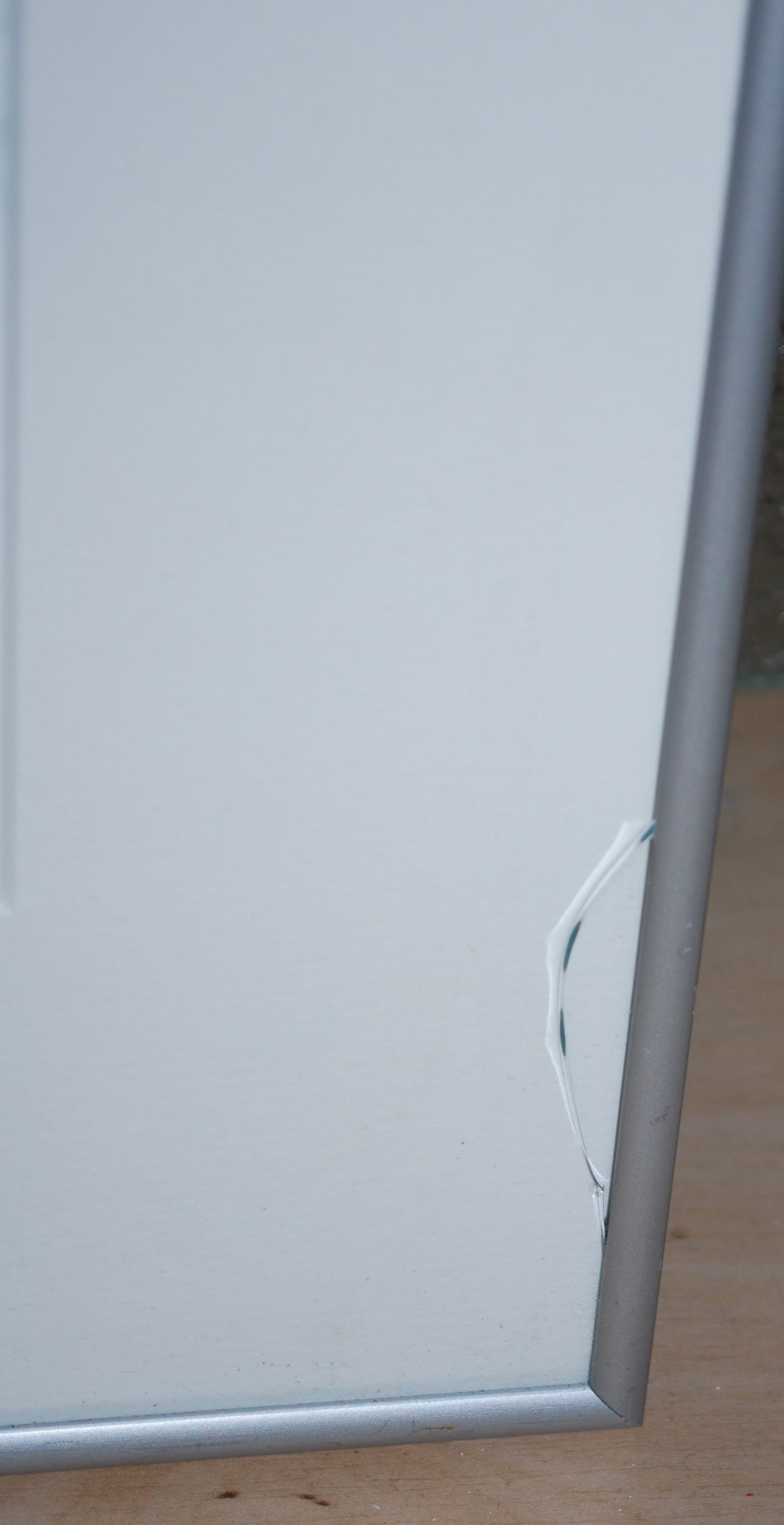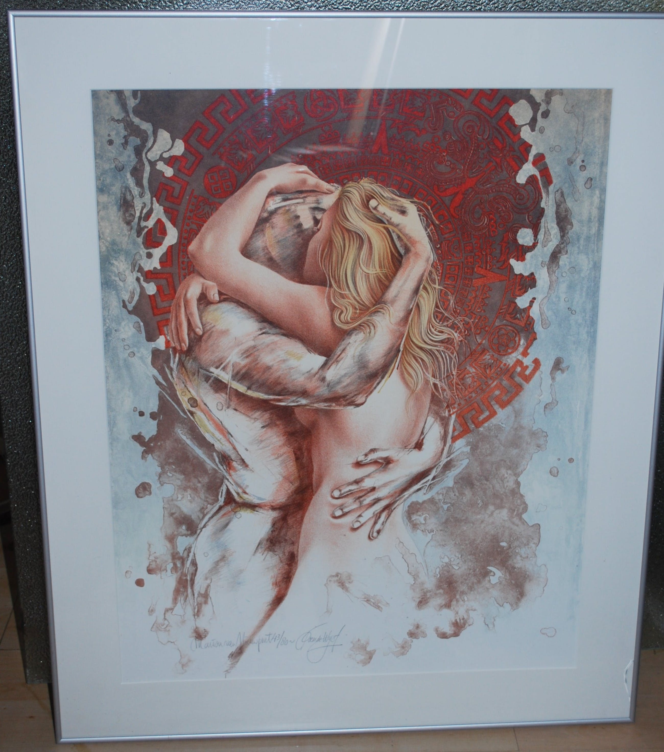 De litho is geplaatst achter passepartout en glas in een aluminium lijst. Het glas heeft een kleine barst rechts.