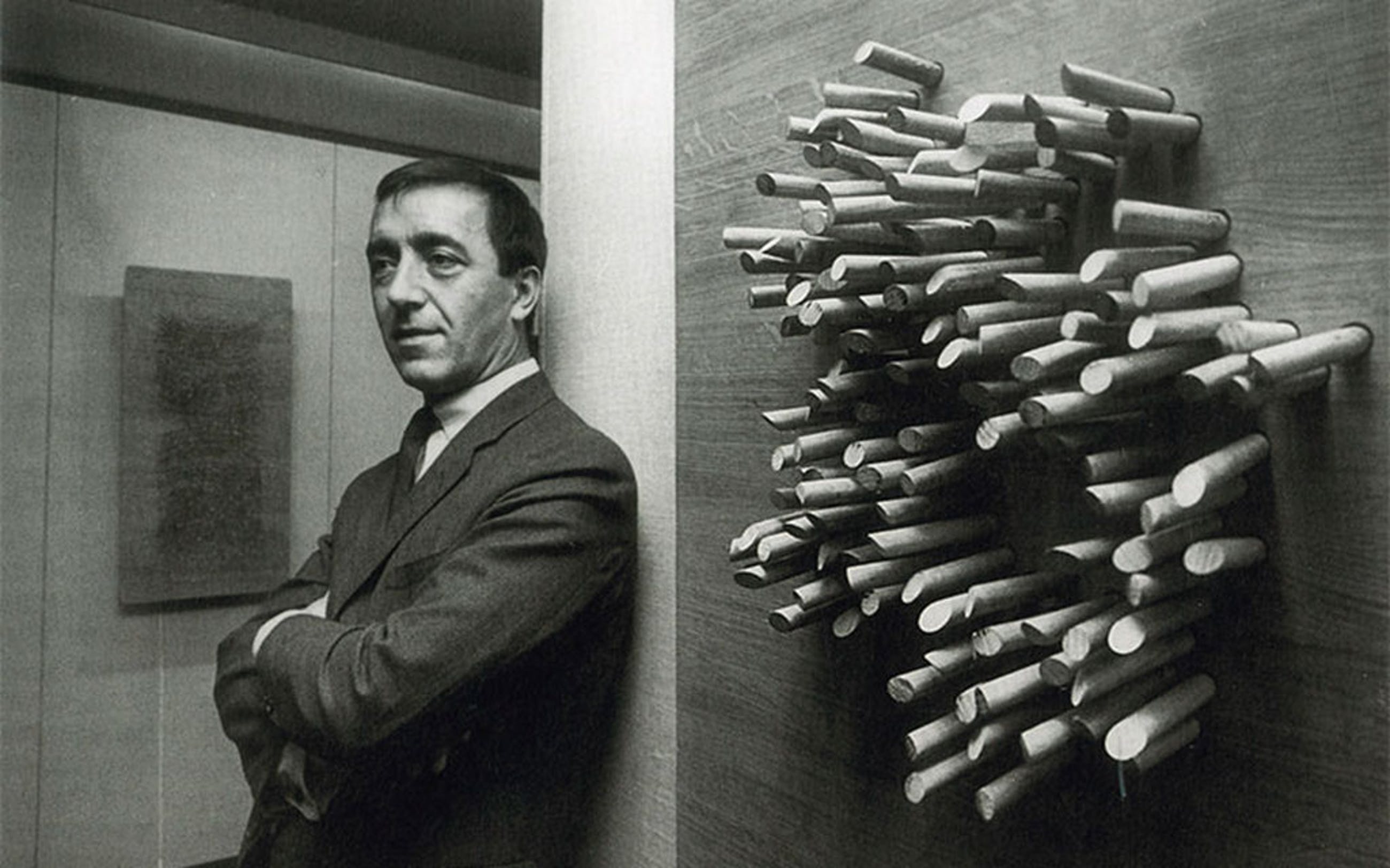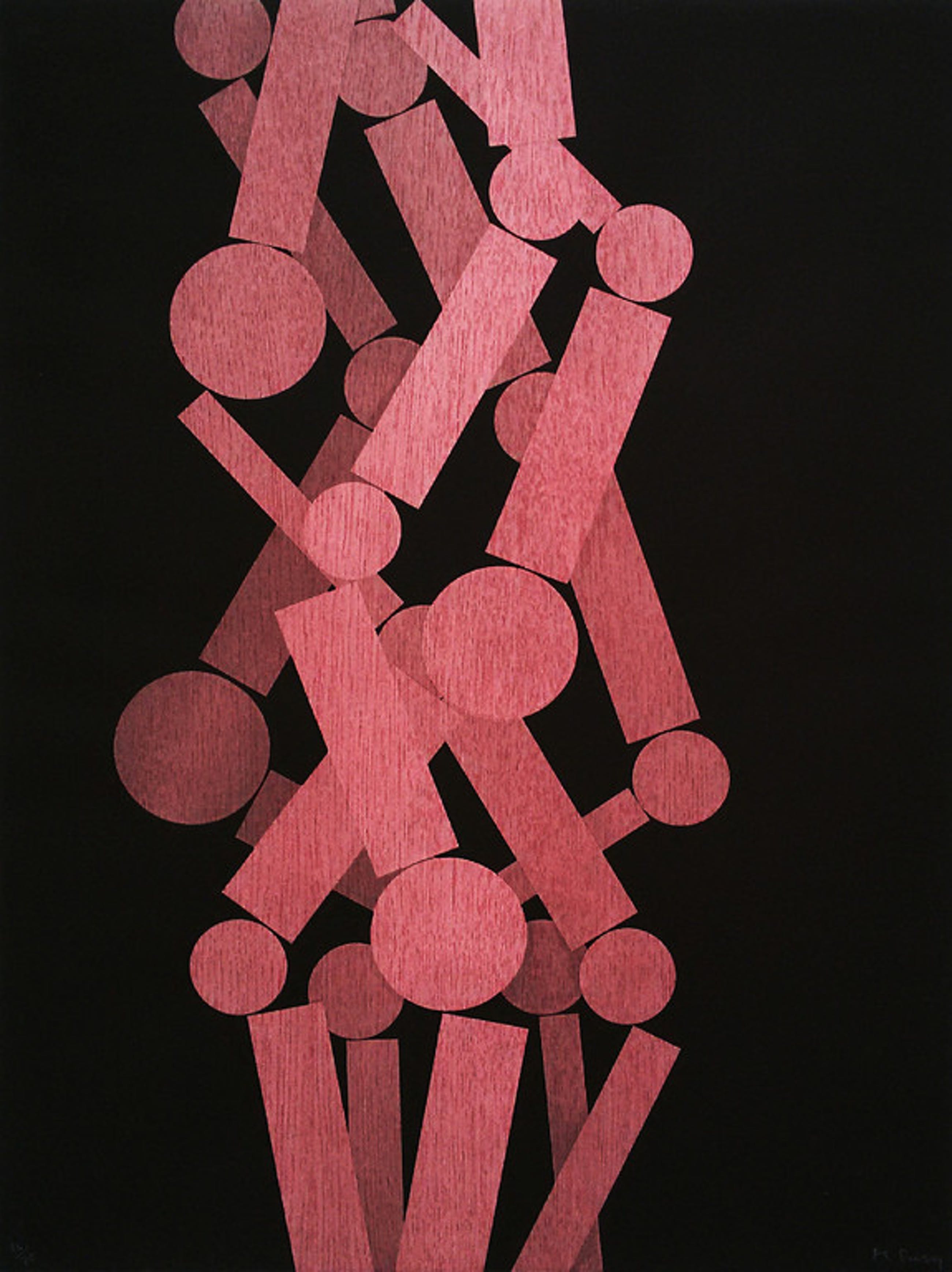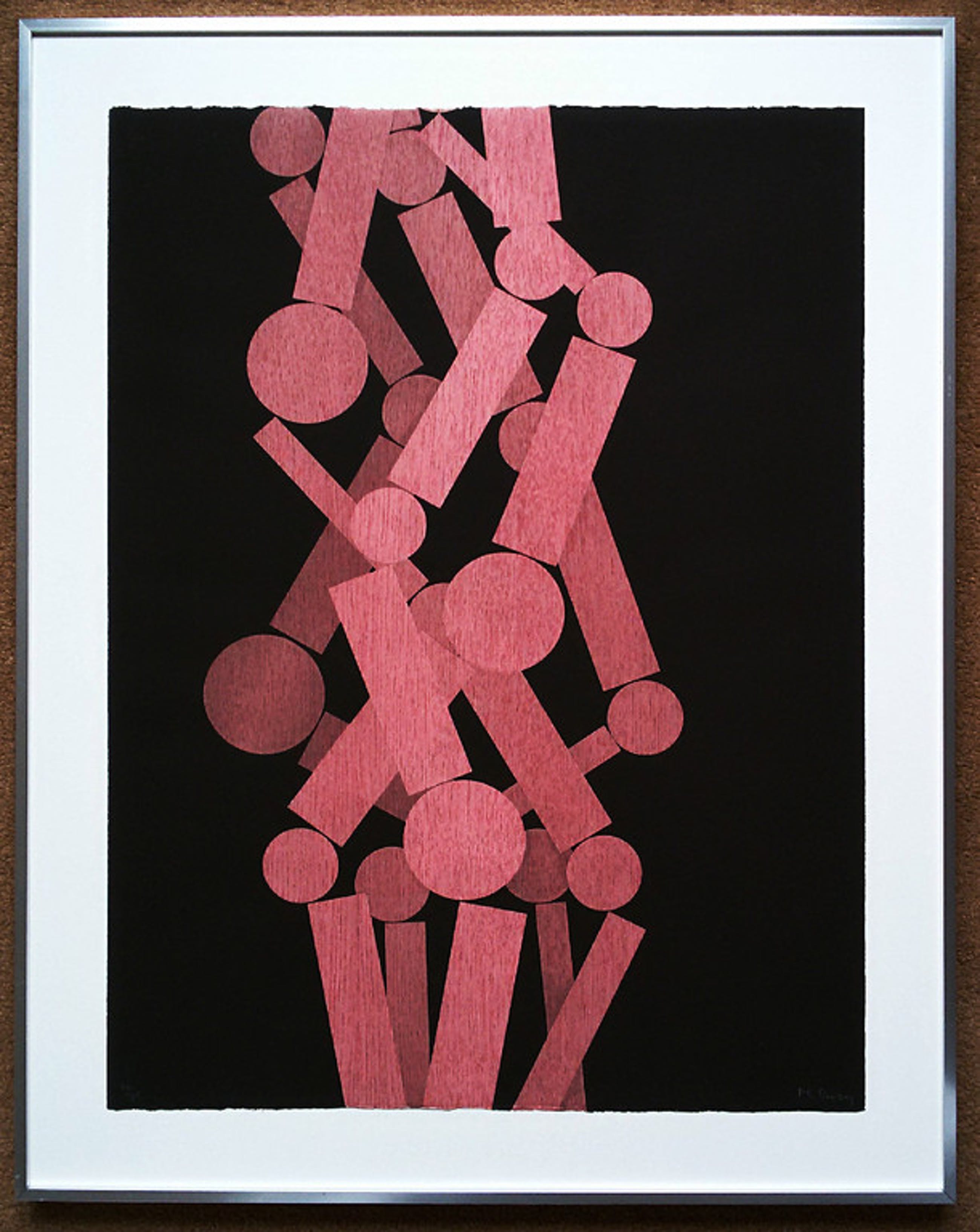 Karakteristieke, kinetische compositie van deze Belgische kunstenaar die gefascineerd was door tijd-ruimte. Litho op papier, met potlood gesigneerd en genummerd (26/75). Ingekaderd in zeer solide, aluminium lijst en achter glas door de firma Schleiper & Fils uit Brussel. In uitstekende conditie.